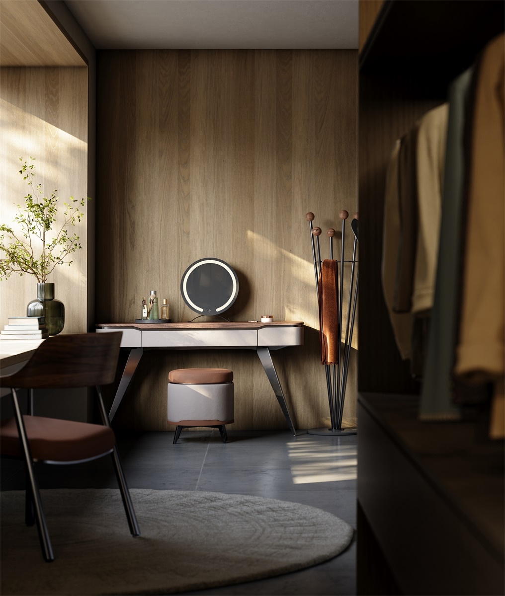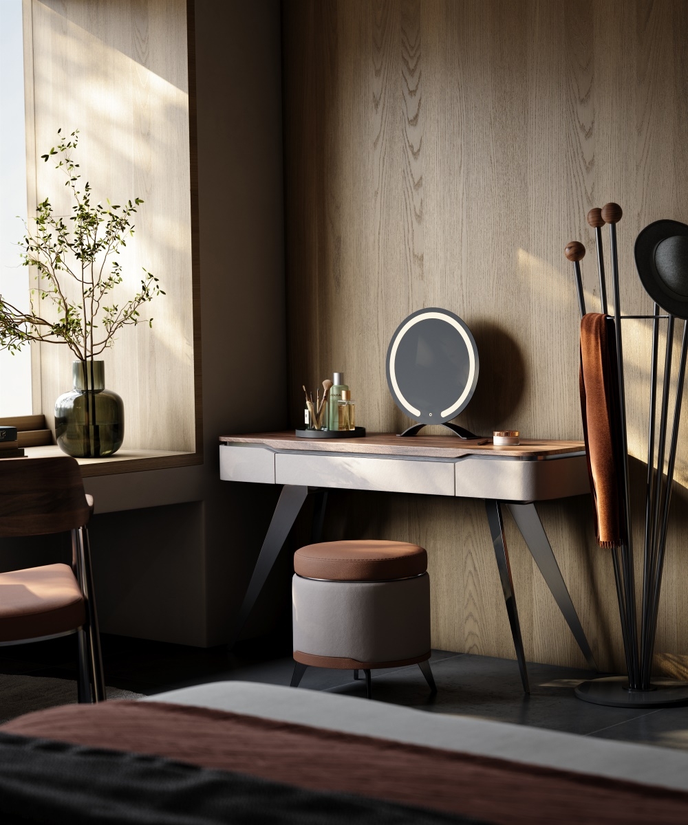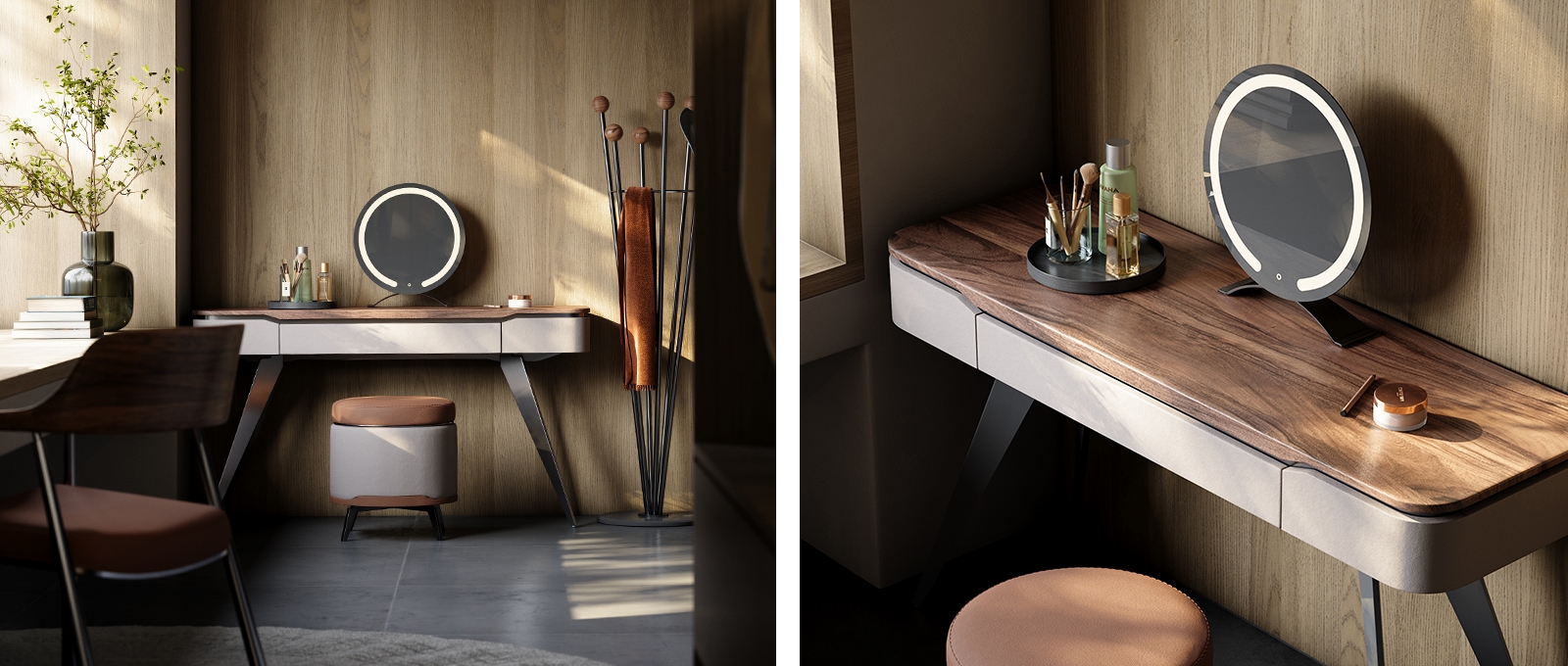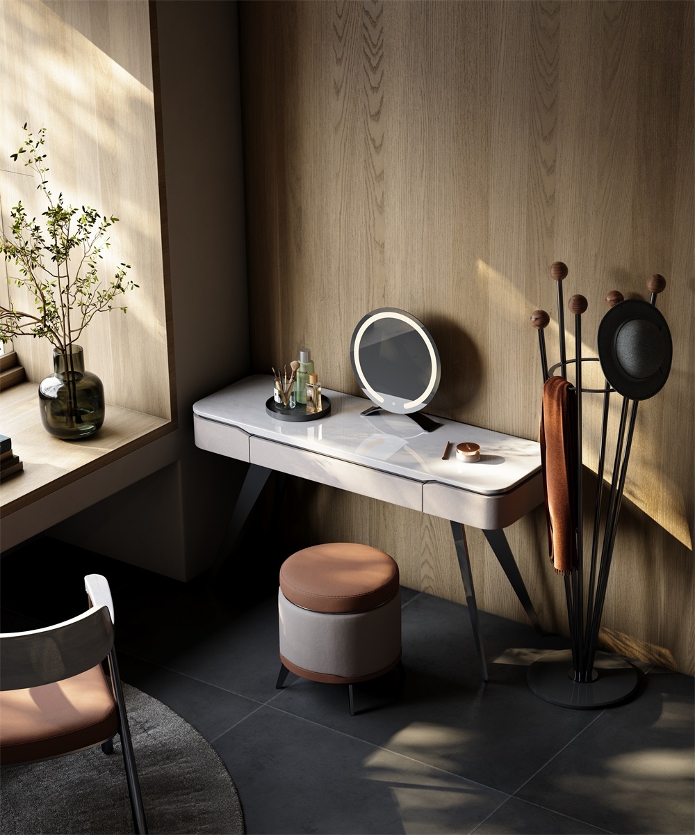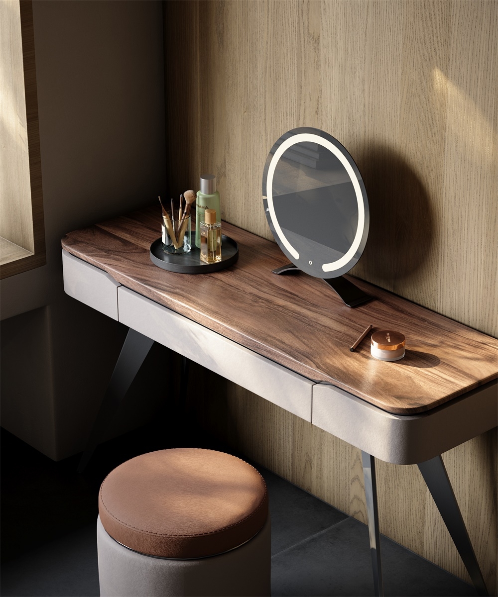 The leather stitching is CNC sewing + manual trimming, with a precise needle distance of 0.2mm to fit the texture; the joints between the metal bracket and various materials are laser-welded + manually polished, smooth and burr-free; the annular mirror is matched with the table top, and is manually adjusted to adapt the angle and brightness to the beauty scene, integrating "exquisite detailism" into every makeup structure.