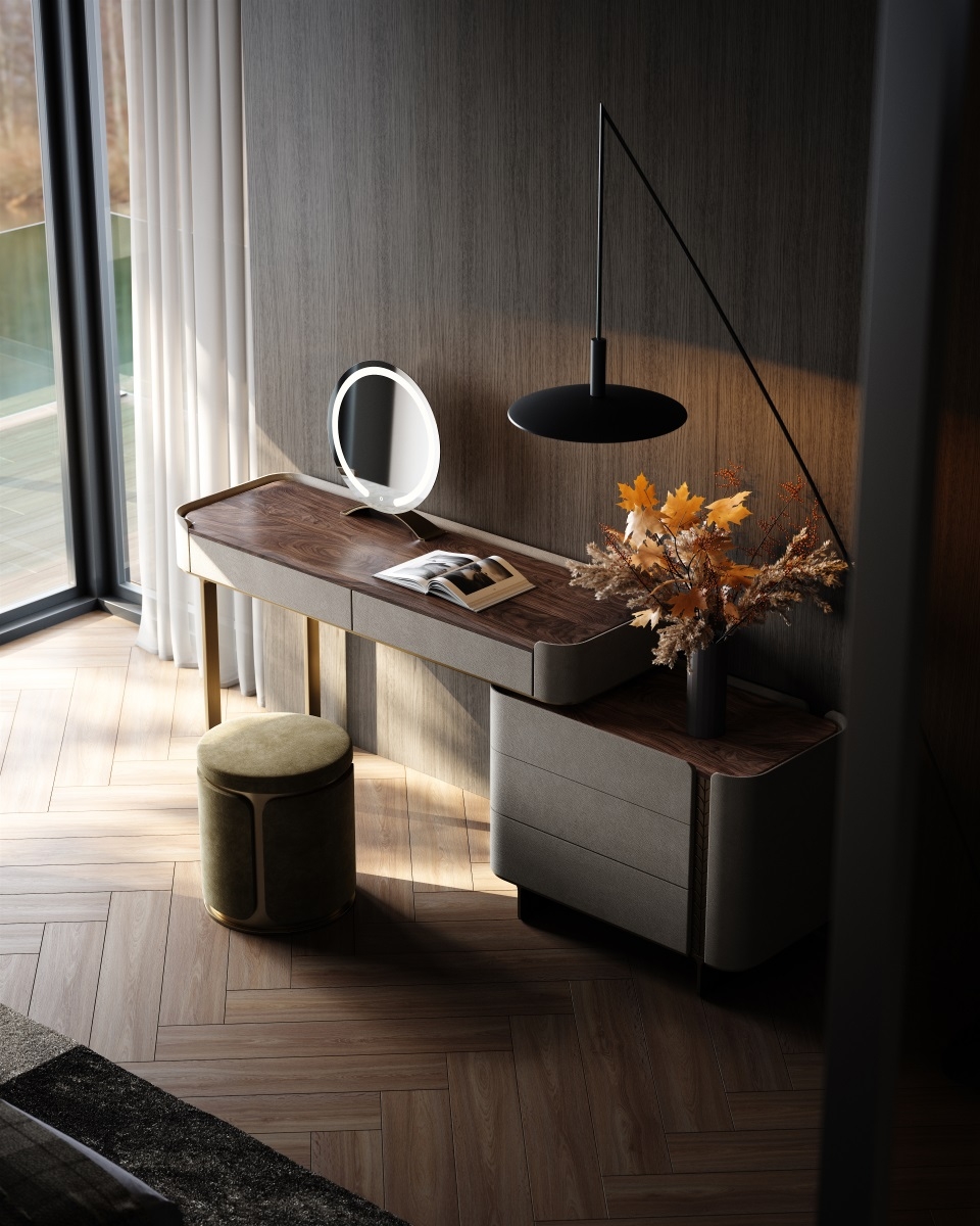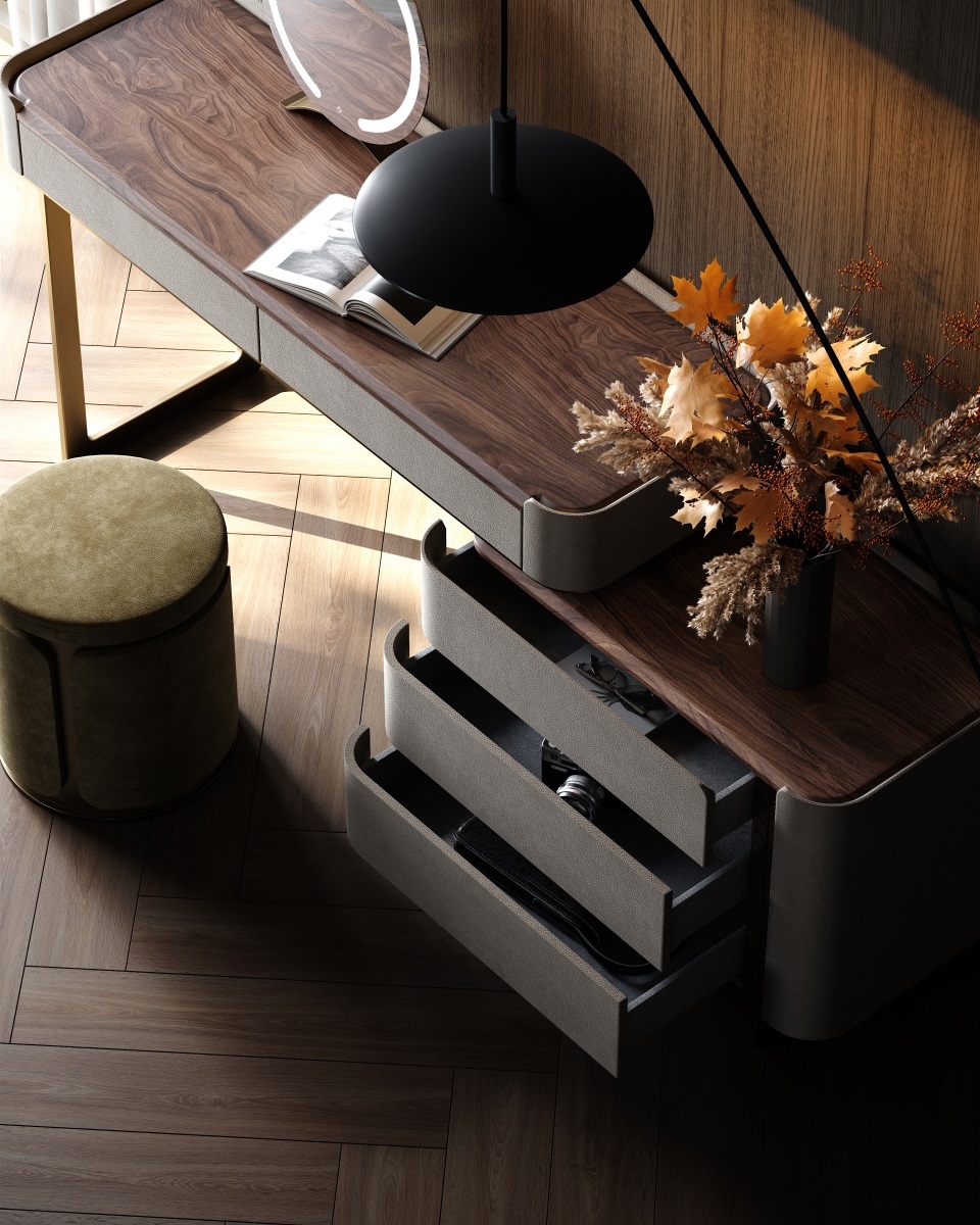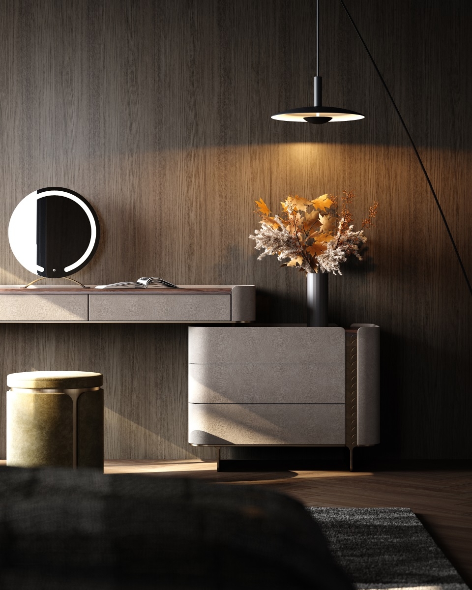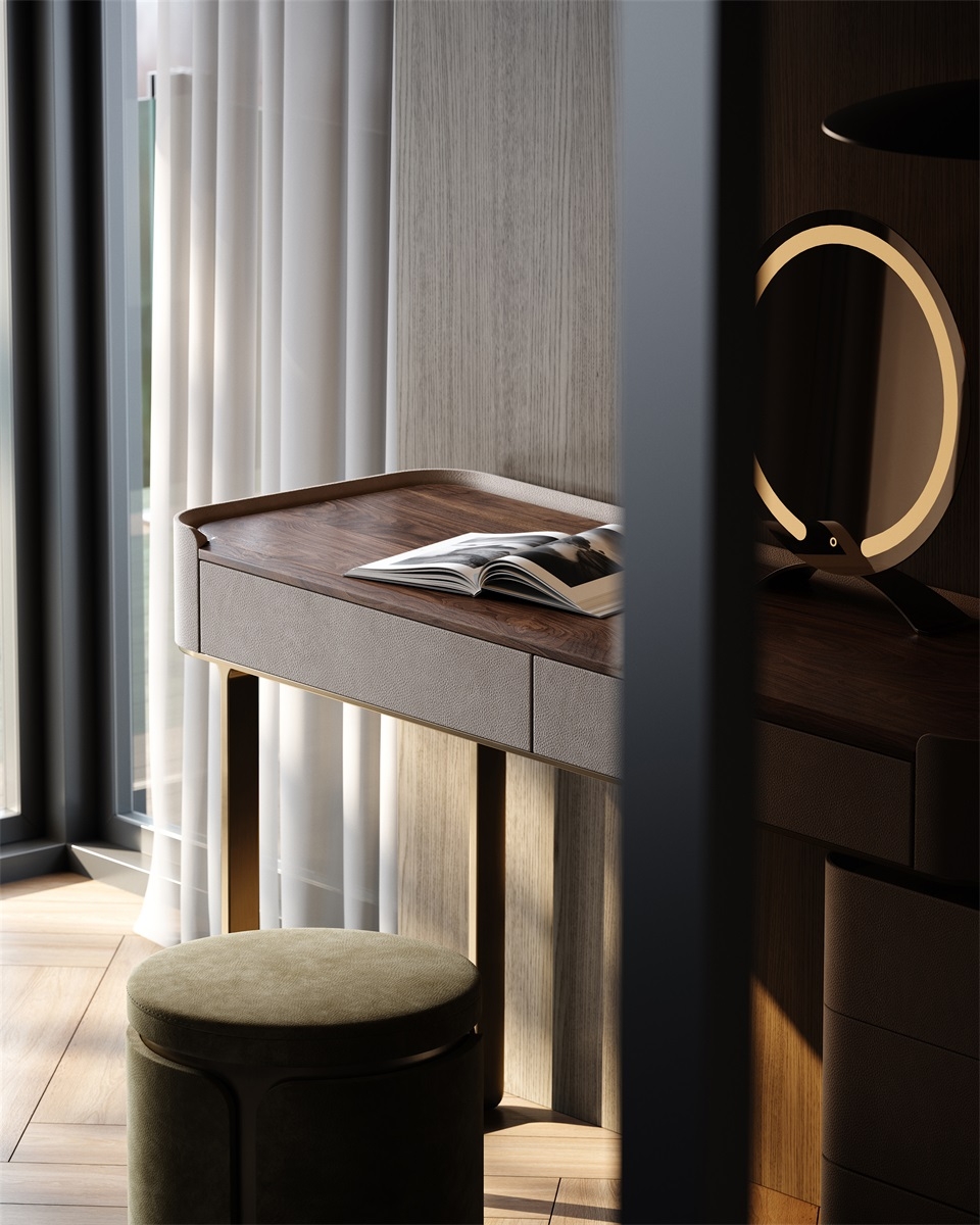and the metal legs provide sturdy support. Multiple drawers offer large-capacity storage, fully displaying a light luxury style.