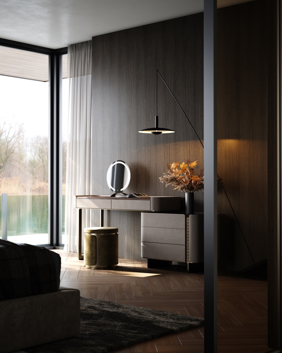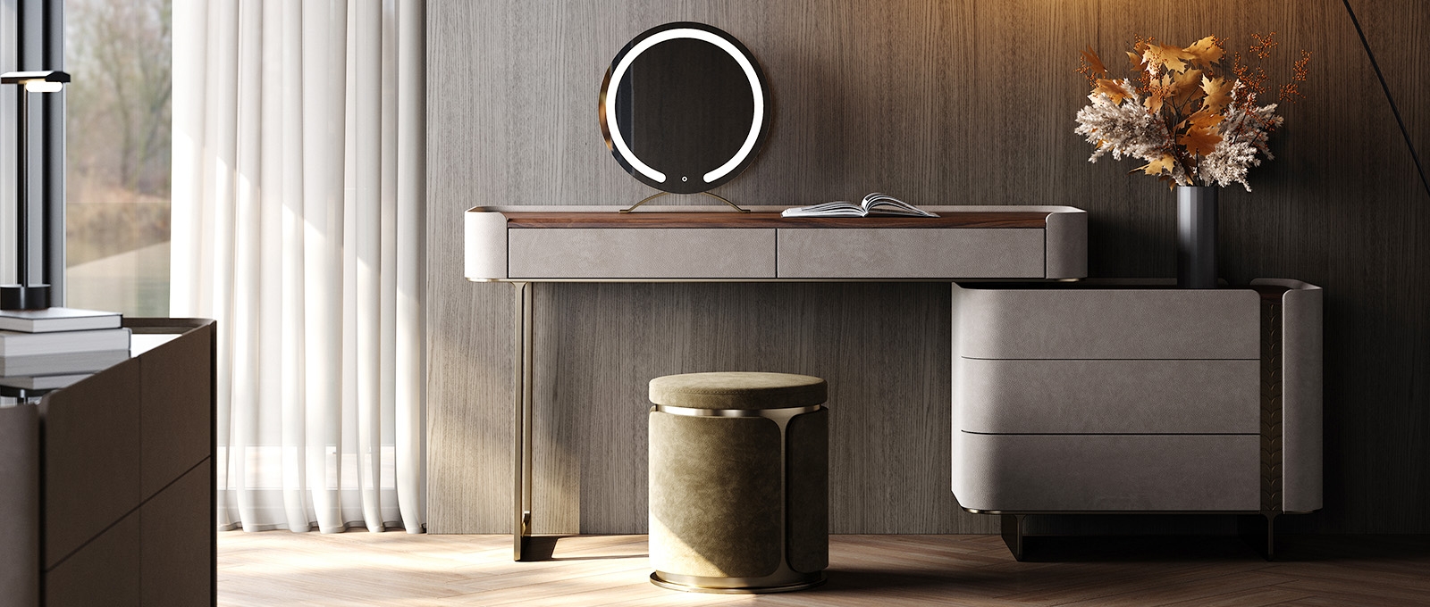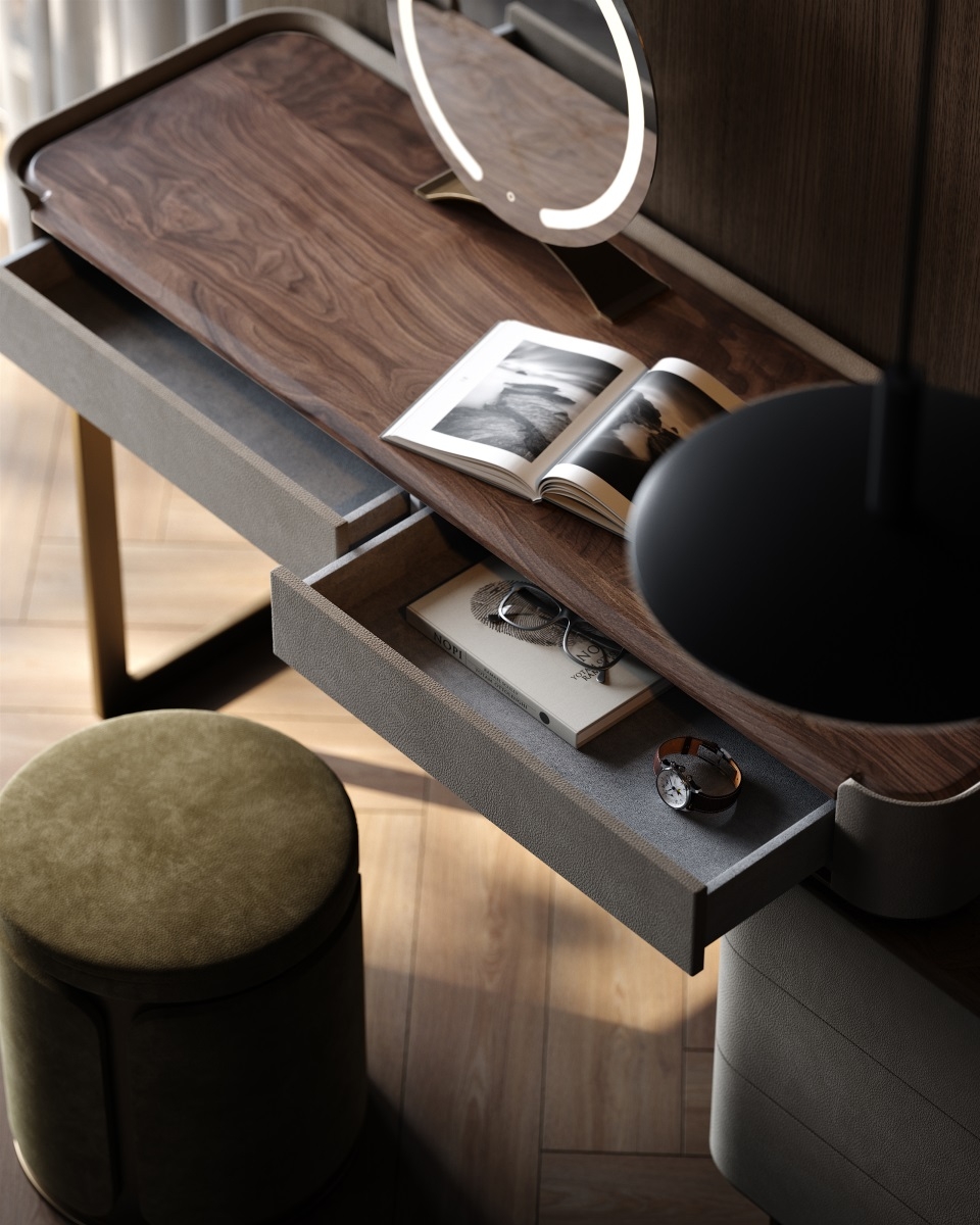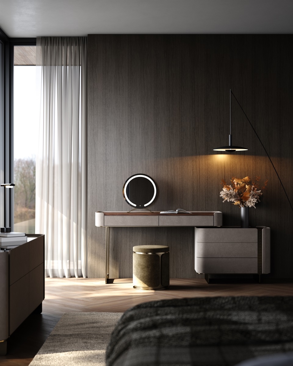 and the metal legs provide sturdy support. Multiple drawers offer large-capacity storage, fully displaying a light luxury style.