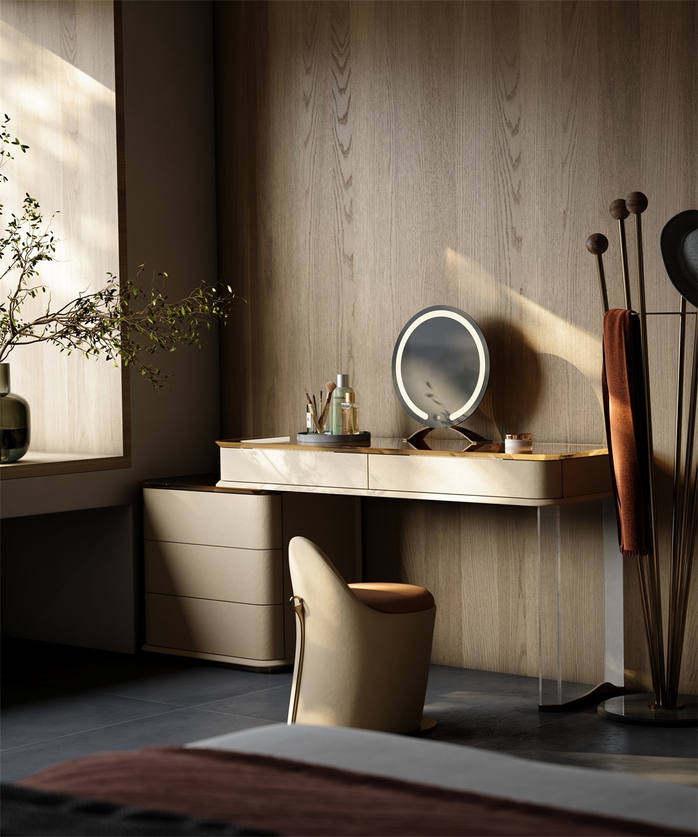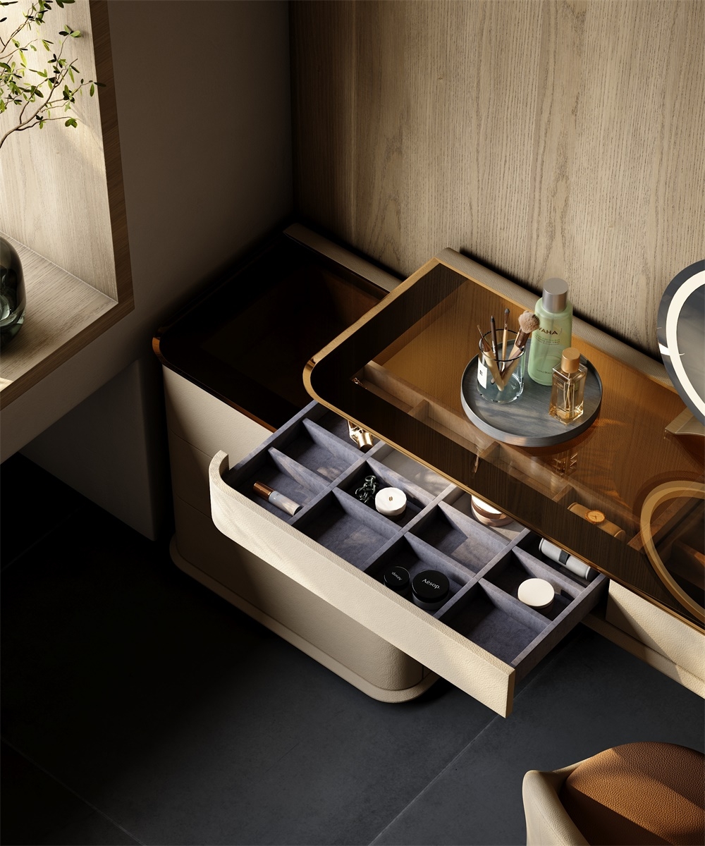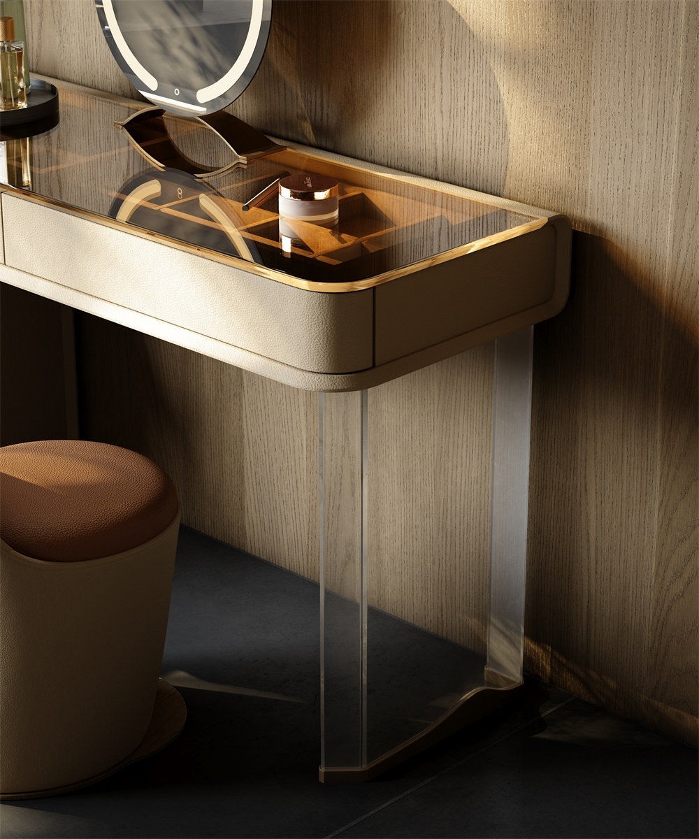 The leather stitching is CNC sewn + hand-trimmed, with a precise stitch length of 0.2mm to fit the cabinet; the joints between metal, acrylic and leather are laser-welded + hand-polished, smooth and burr-free; the circular mirror is matched with the countertop and manually adjusted in angle and brightness to suit beauty, integrating "exquisite detailism" into every makeup structure.