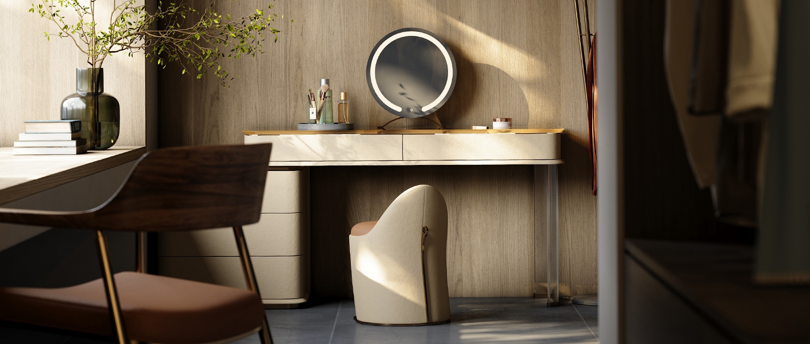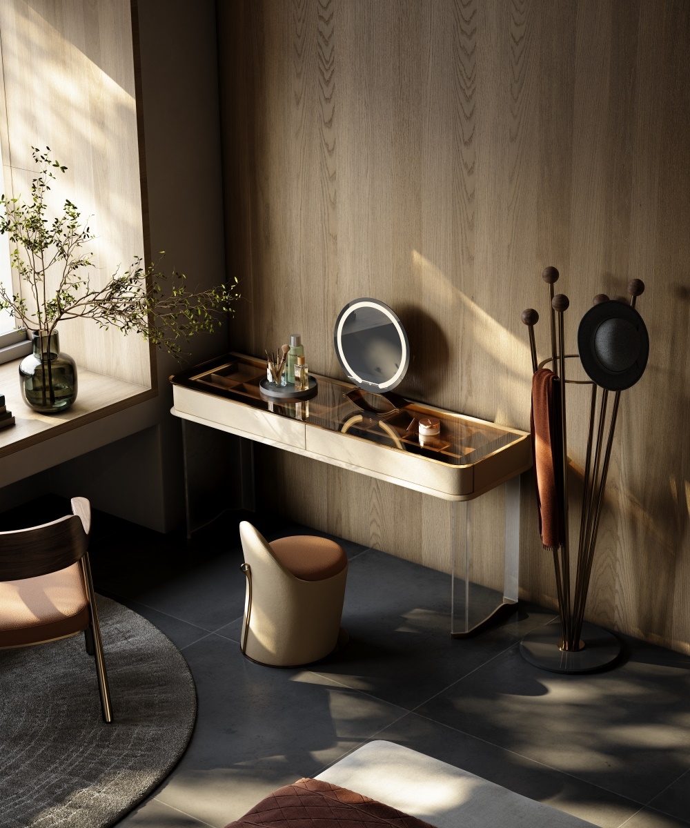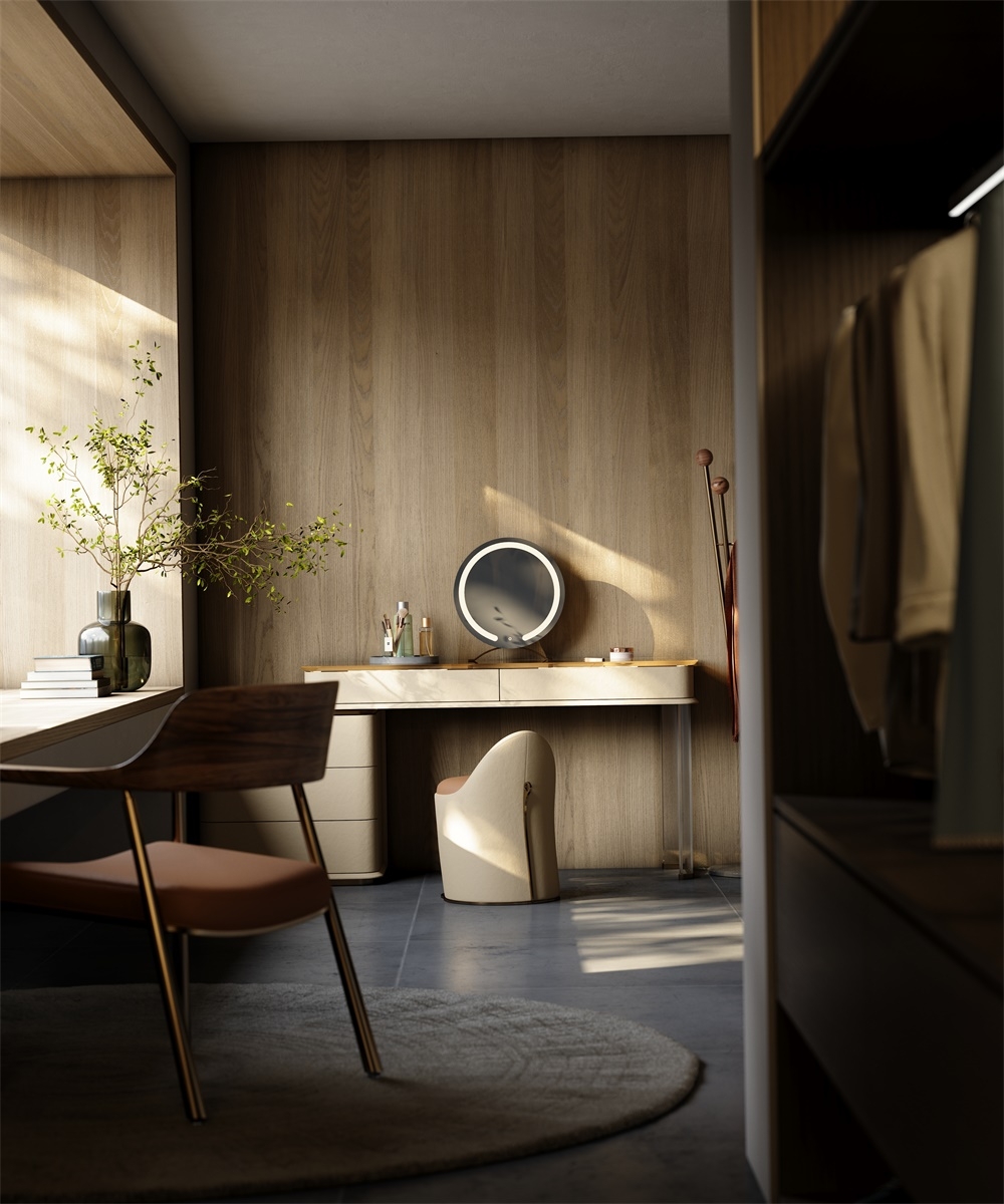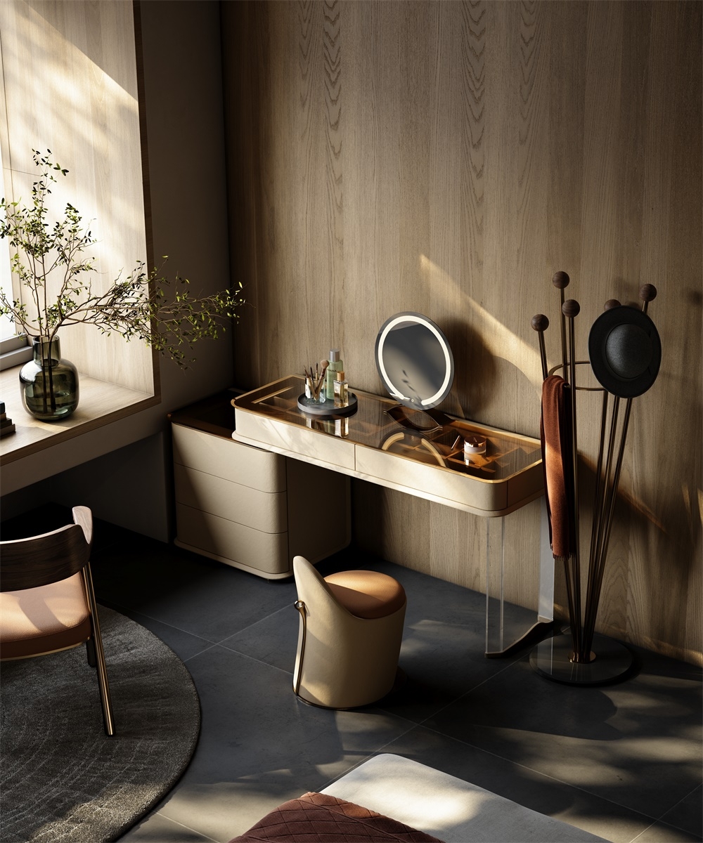The leather stitching is CNC sewn + hand-trimmed, with a precise stitch length of 0.2mm to fit the cabinet; the joints between metal, acrylic and leather are laser-welded + hand-polished, smooth and burr-free; the circular mirror is matched with the countertop and manually adjusted in angle and brightness to suit beauty, integrating "exquisite detailism" into every makeup structure.
