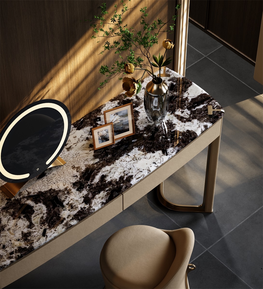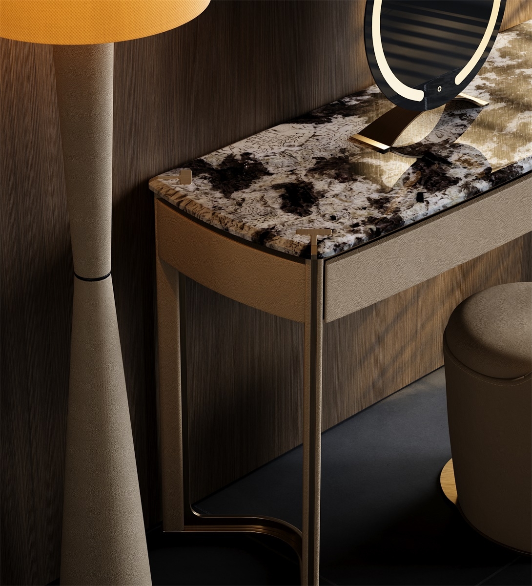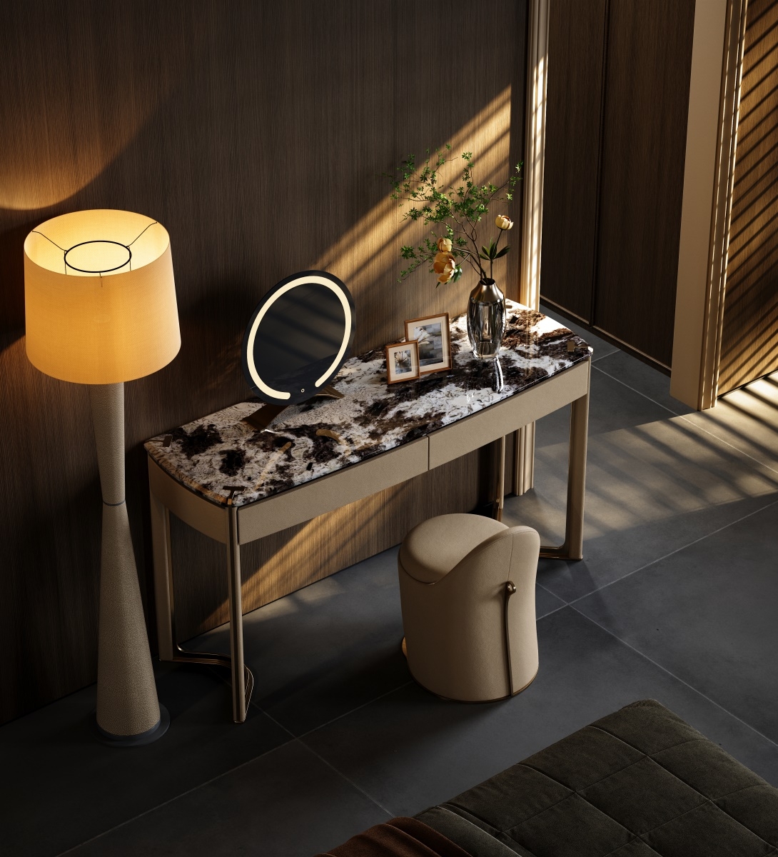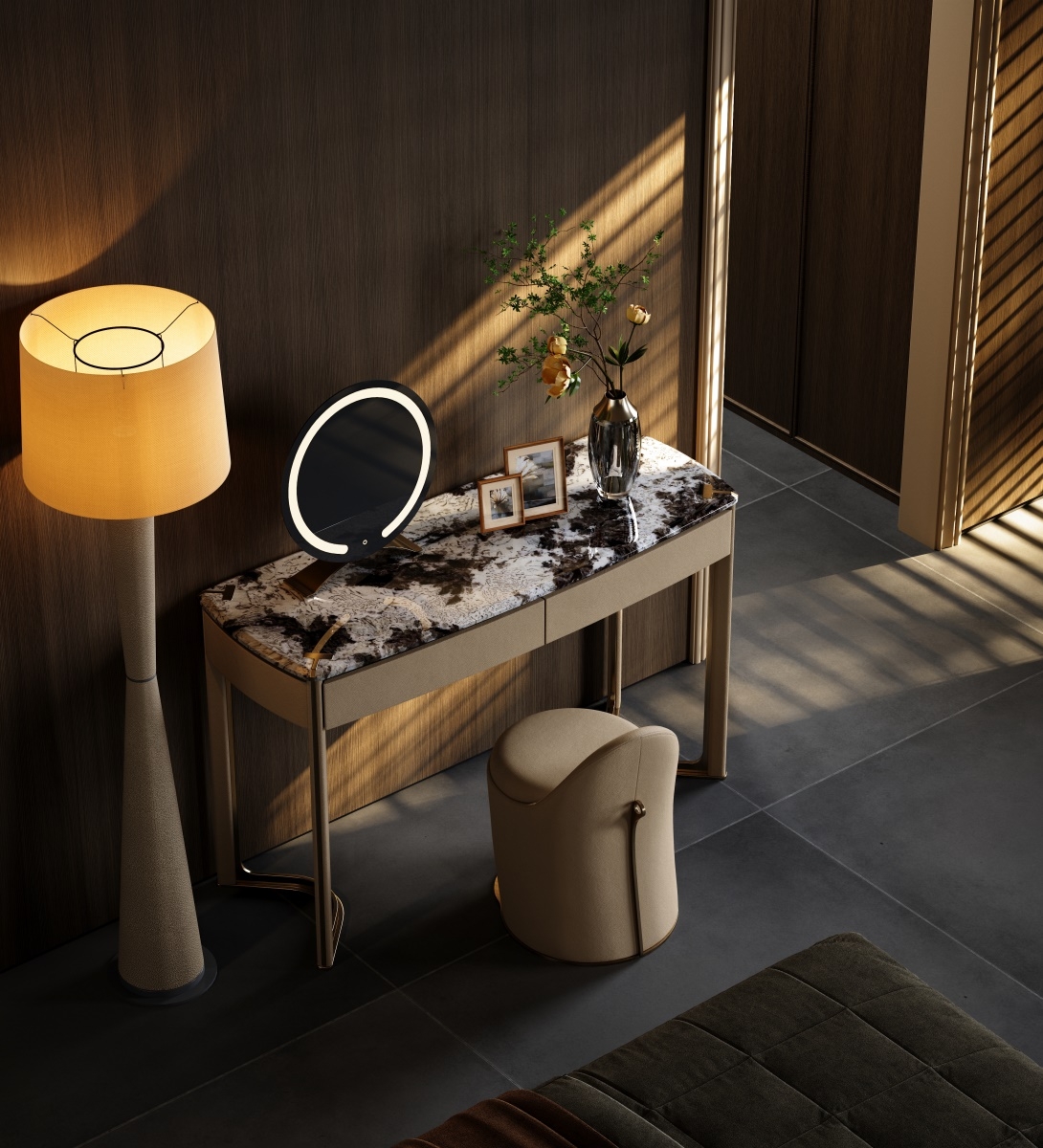 The metal forged T-shaped elements are embedded in the four corners of the luxury stone countertop, showing the exquisiteness and luxury of the dressing table. The minimalist support structure and V-shaped base make the design lines perfect, which is a work of art in the bedroom.