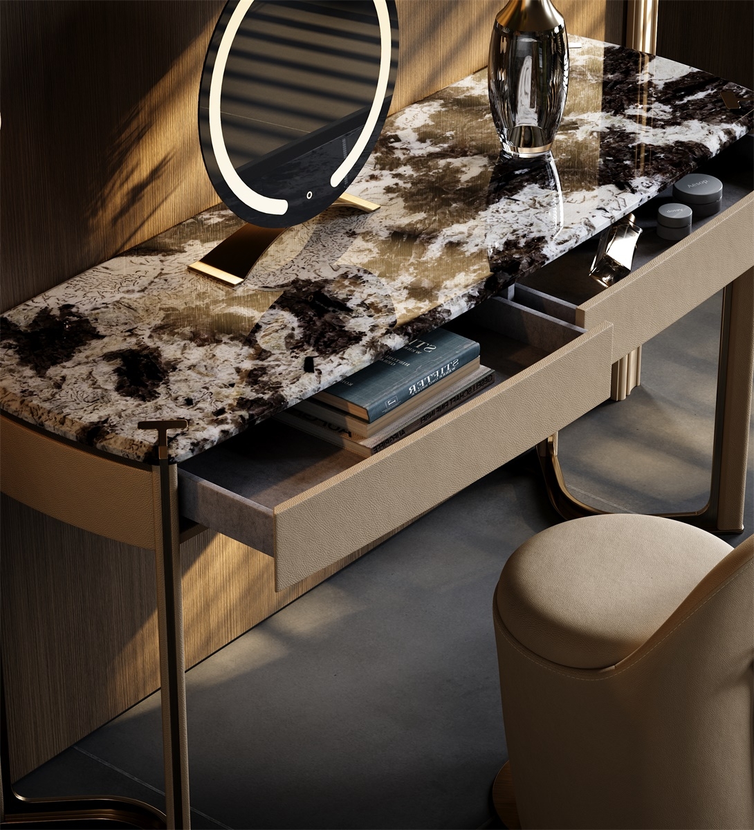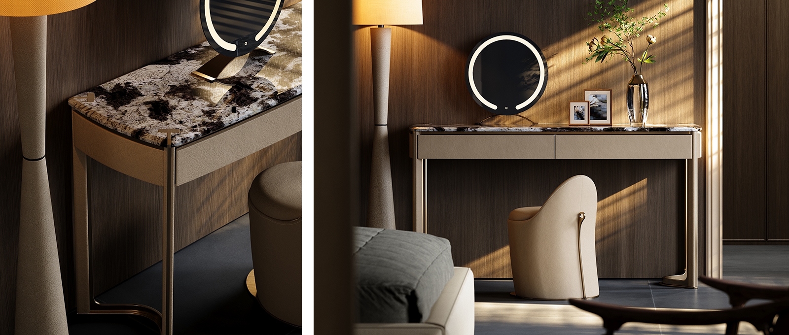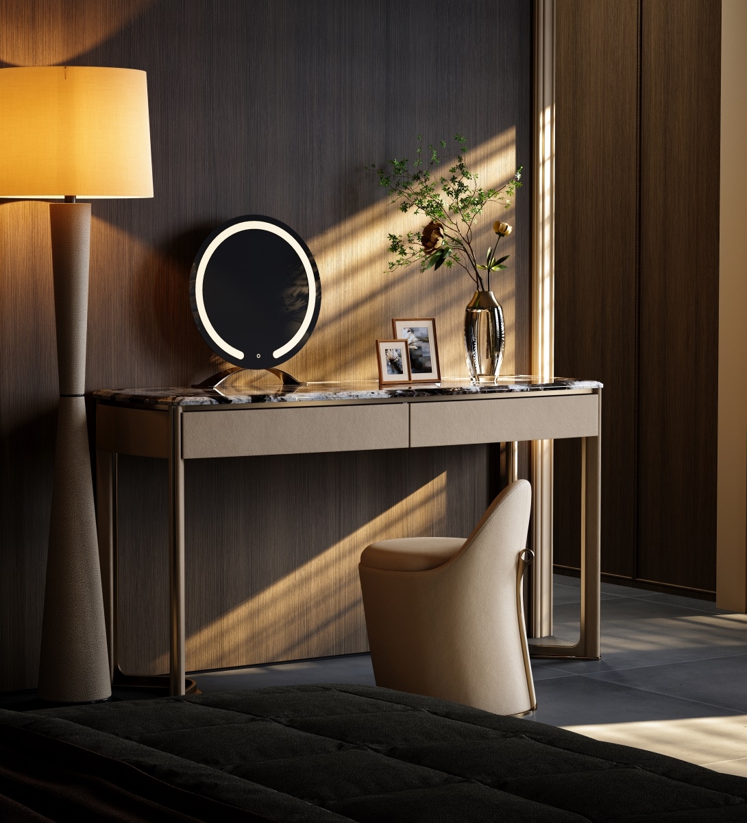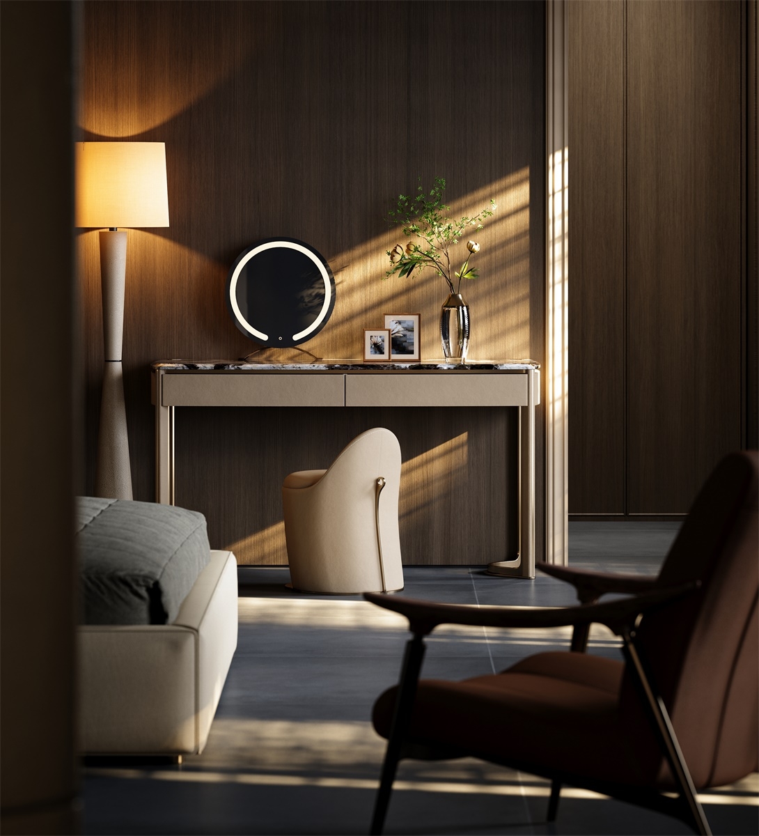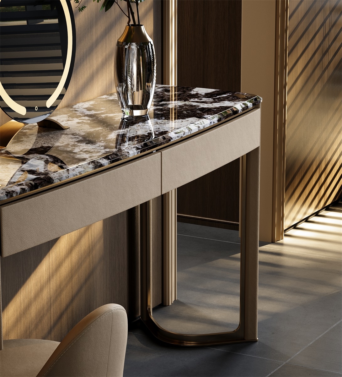 The metal forged T-shaped elements are embedded in the four corners of the luxury stone countertop, showing the exquisiteness and luxury of the dressing table. The minimalist support structure and V-shaped base make the design lines perfect, which is a work of art in the bedroom.