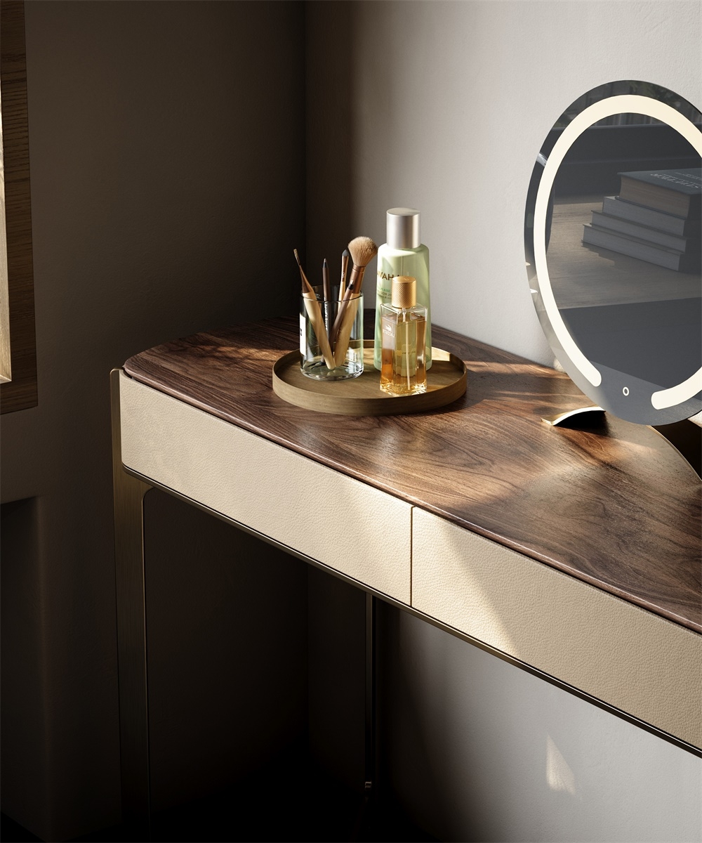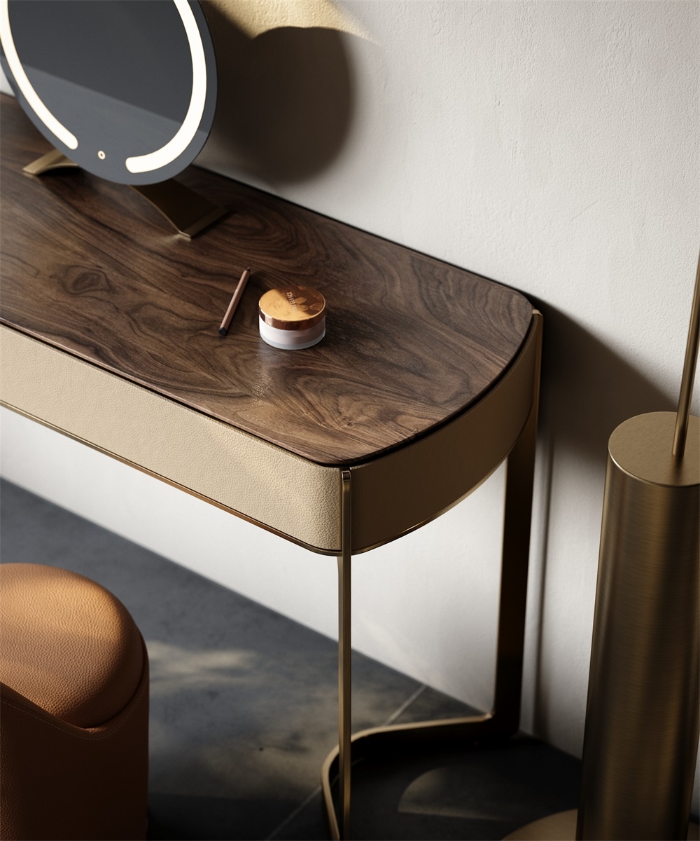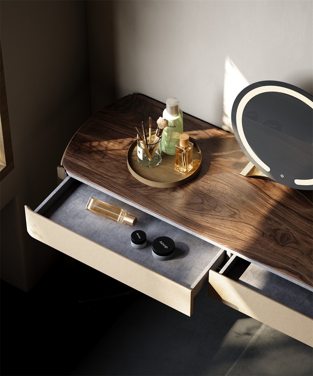The double-drawer cabinet + circular light-filling mirror design breaks the stereotyped dressing table form. The circular mirror accurately fills the light, and the double drawers store skin care products and jewelry to maintain a neat appearance; the combination of "leather cabinet + metal bracket + solid wood table" not only meets the storage needs, but also creates a sense of lightness visually, allowing the beauty area to say goodbye to clutter and return to a refined and healing rest area.