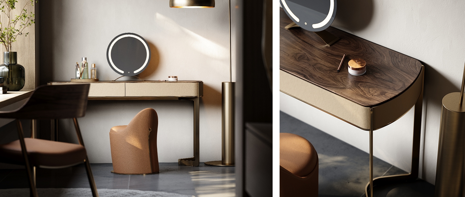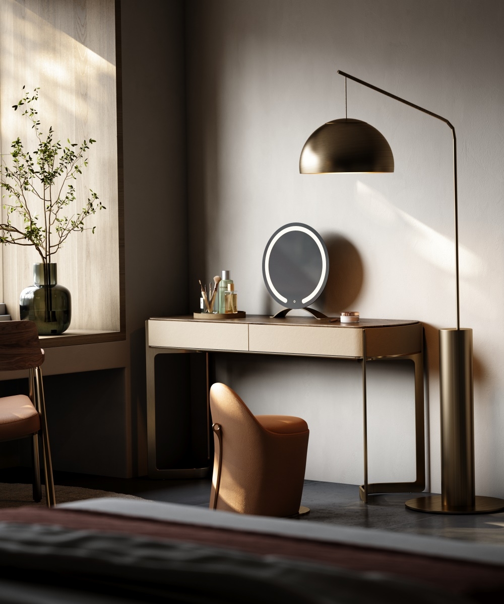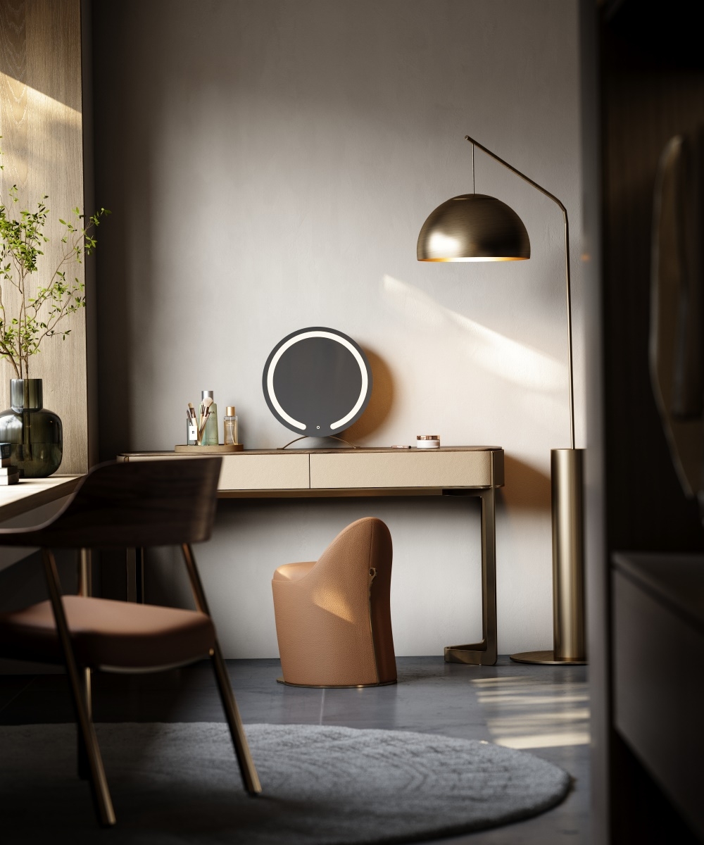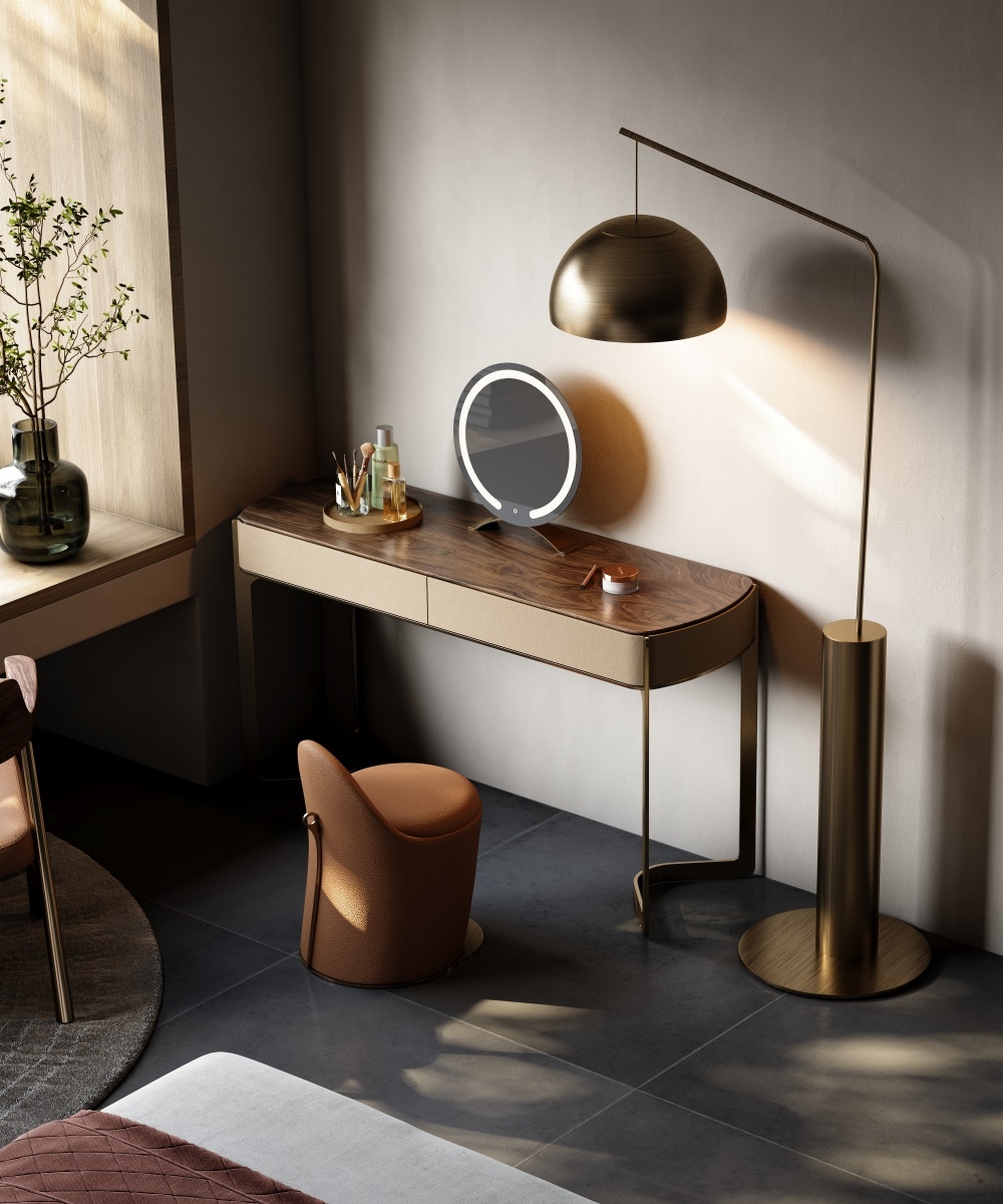 The double-drawer cabinet + circular light-filling mirror design breaks the stereotyped dressing table form. The circular mirror accurately fills the light, and the double drawers store skin care products and jewelry to maintain a neat appearance; the combination of "leather cabinet + metal bracket + solid wood table" not only meets the storage needs, but also creates a sense of lightness visually, allowing the beauty area to say goodbye to clutter and return to a refined and healing rest area.