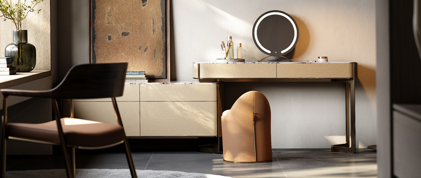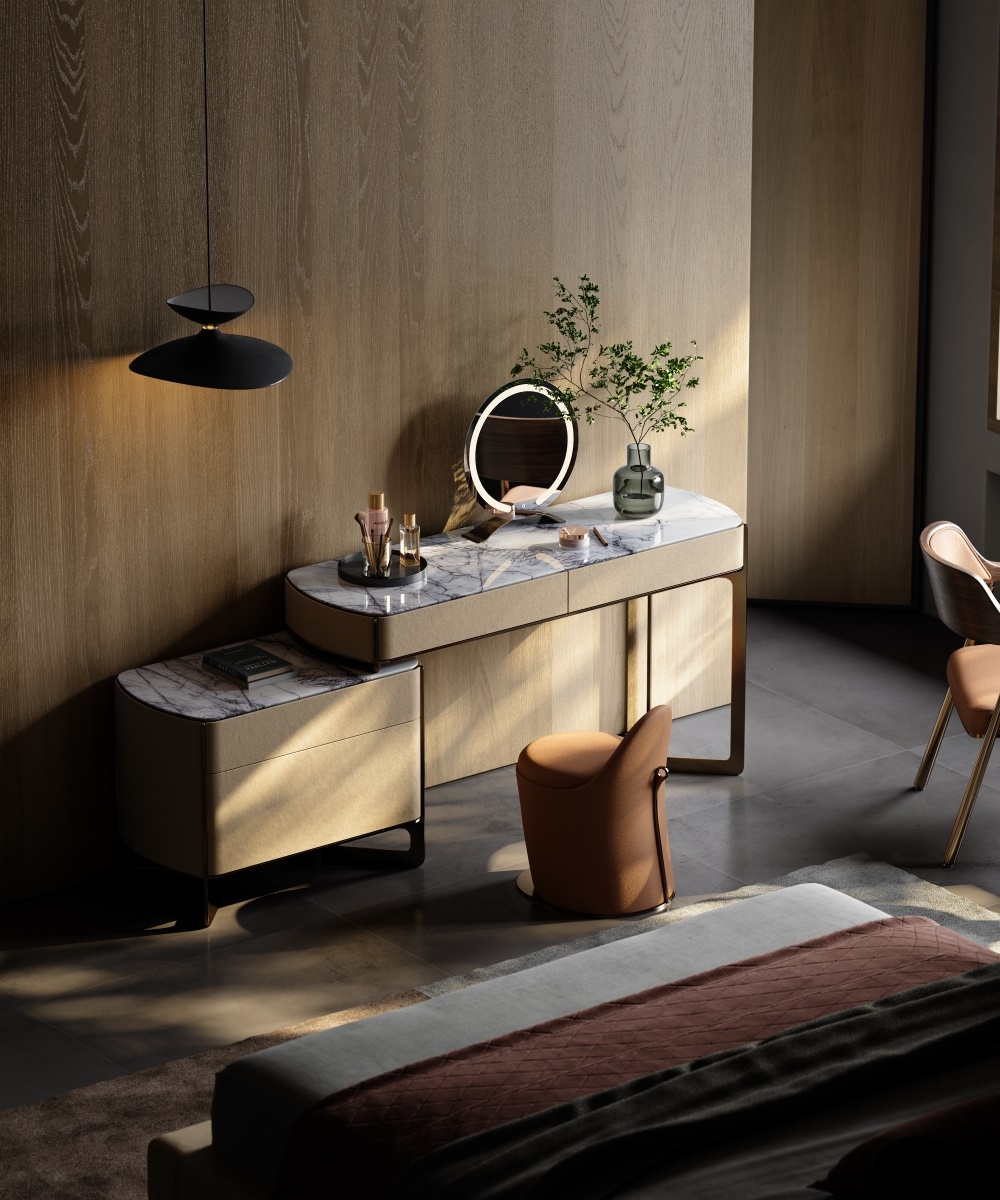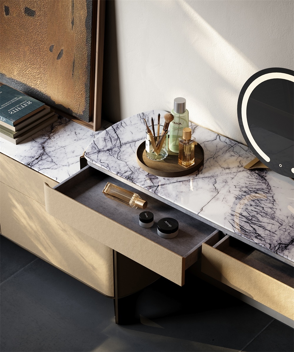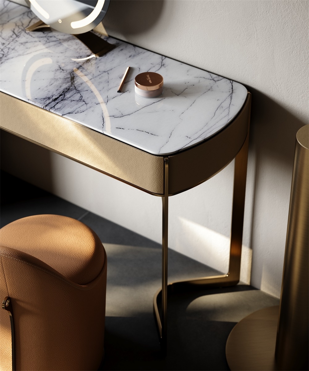 The leather stitching is CNC sewing + manual trimming, with a precise needle distance of 0.2mm to fit the texture; the joints between the metal bracket and various materials are laser-welded + manually polished, smooth and burr-free; the annular mirror is matched with the table top, and is manually adjusted to adapt the angle and brightness to the beauty scene, integrating "exquisite detailism" into every makeup structure.
