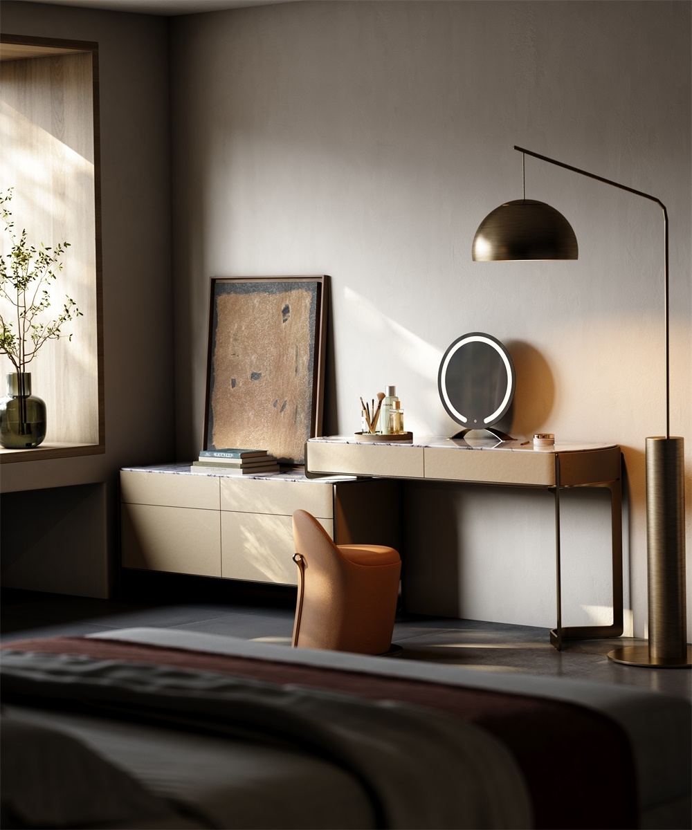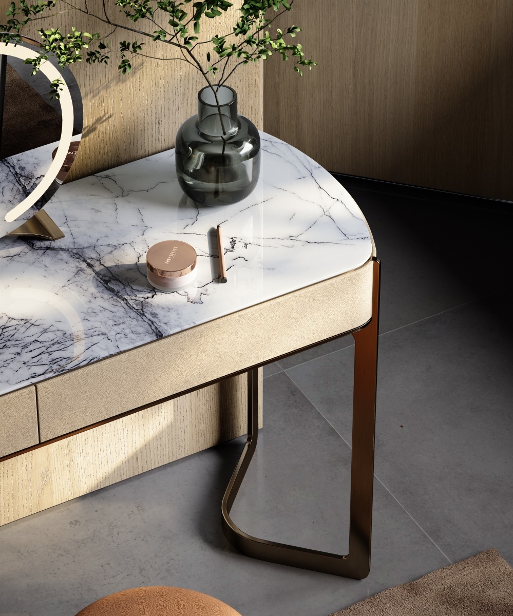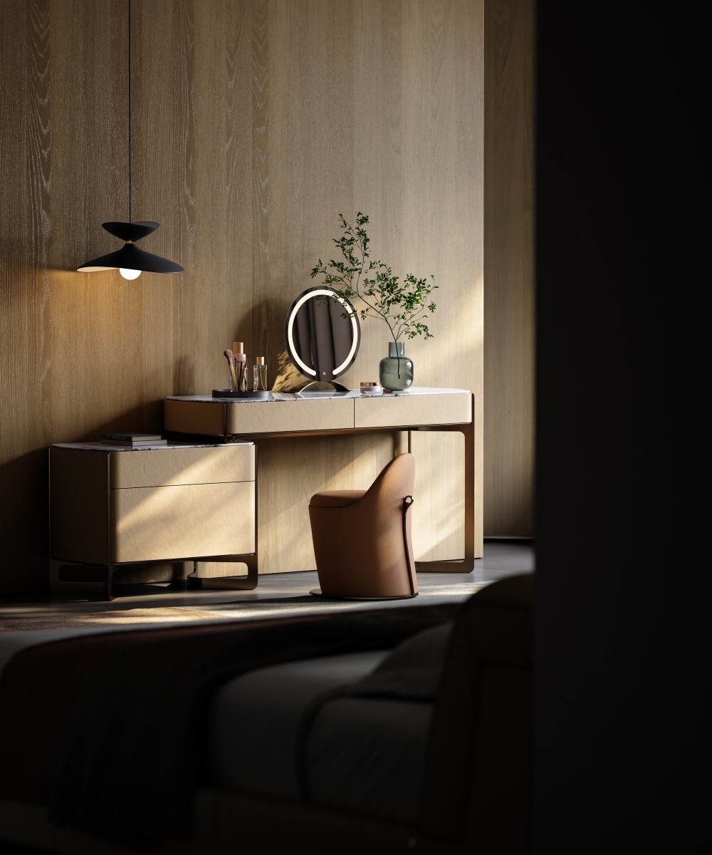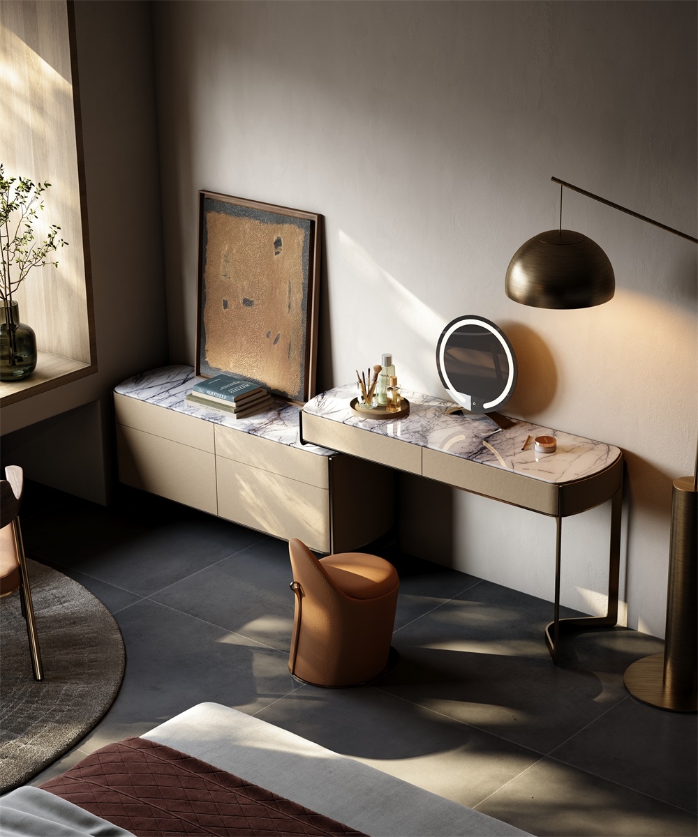 The leather stitching is CNC sewing + manual trimming, with a precise needle distance of 0.2mm to fit the texture; the joints between the metal bracket and various materials are laser-welded + manually polished, smooth and burr-free; the annular mirror is matched with the table top, and is manually adjusted to adapt the angle and brightness to the beauty scene, integrating "exquisite detailism" into every makeup structure.