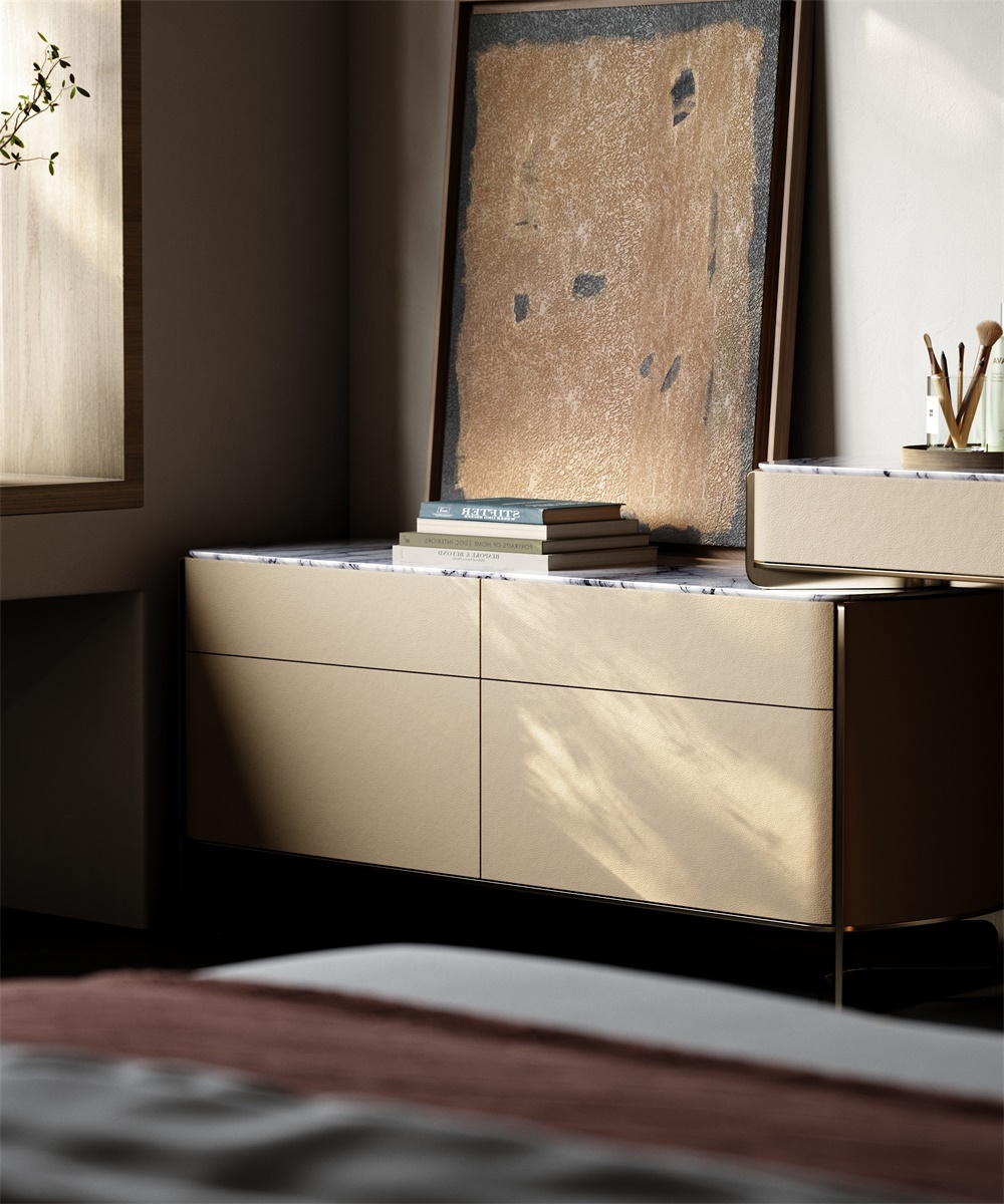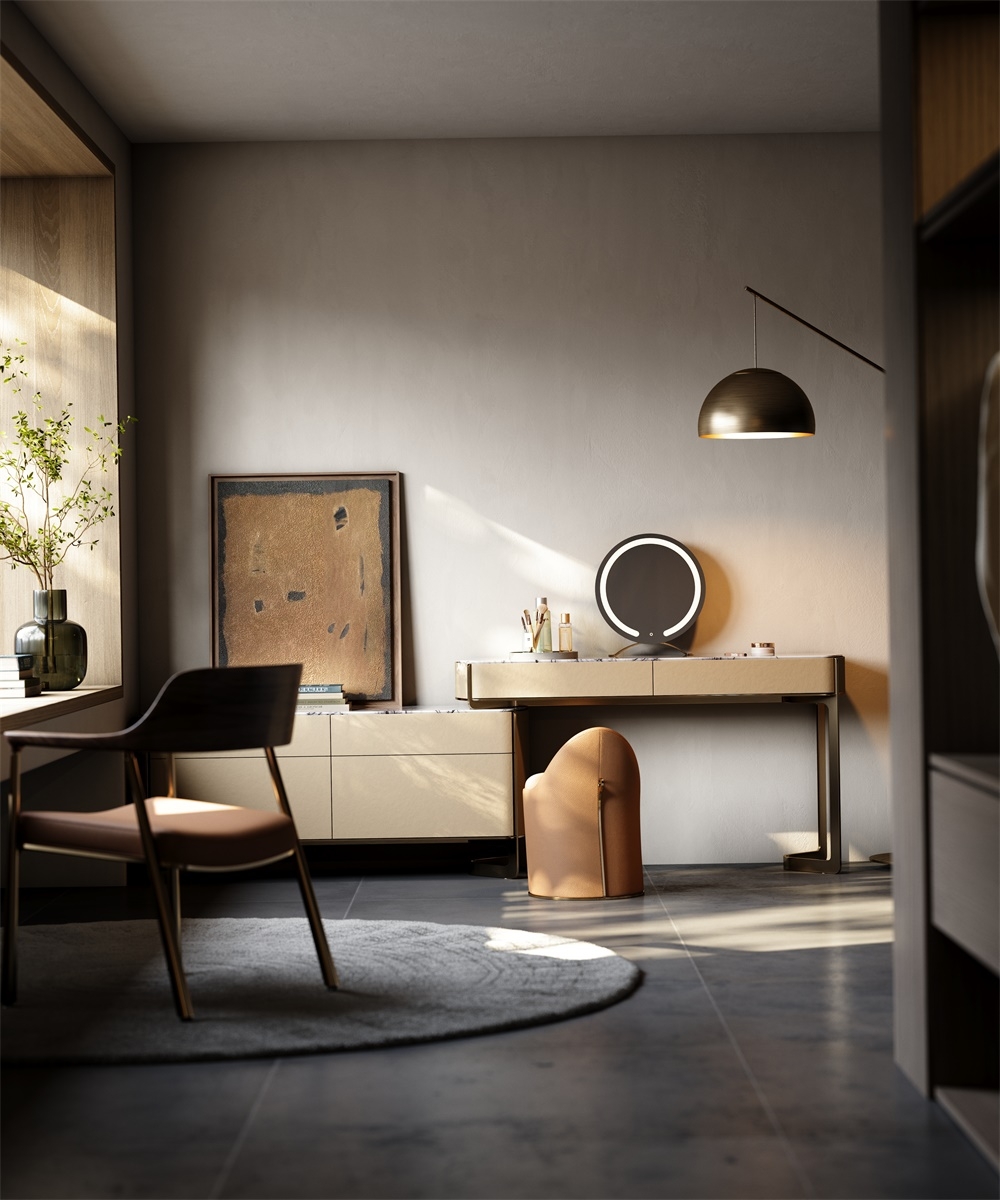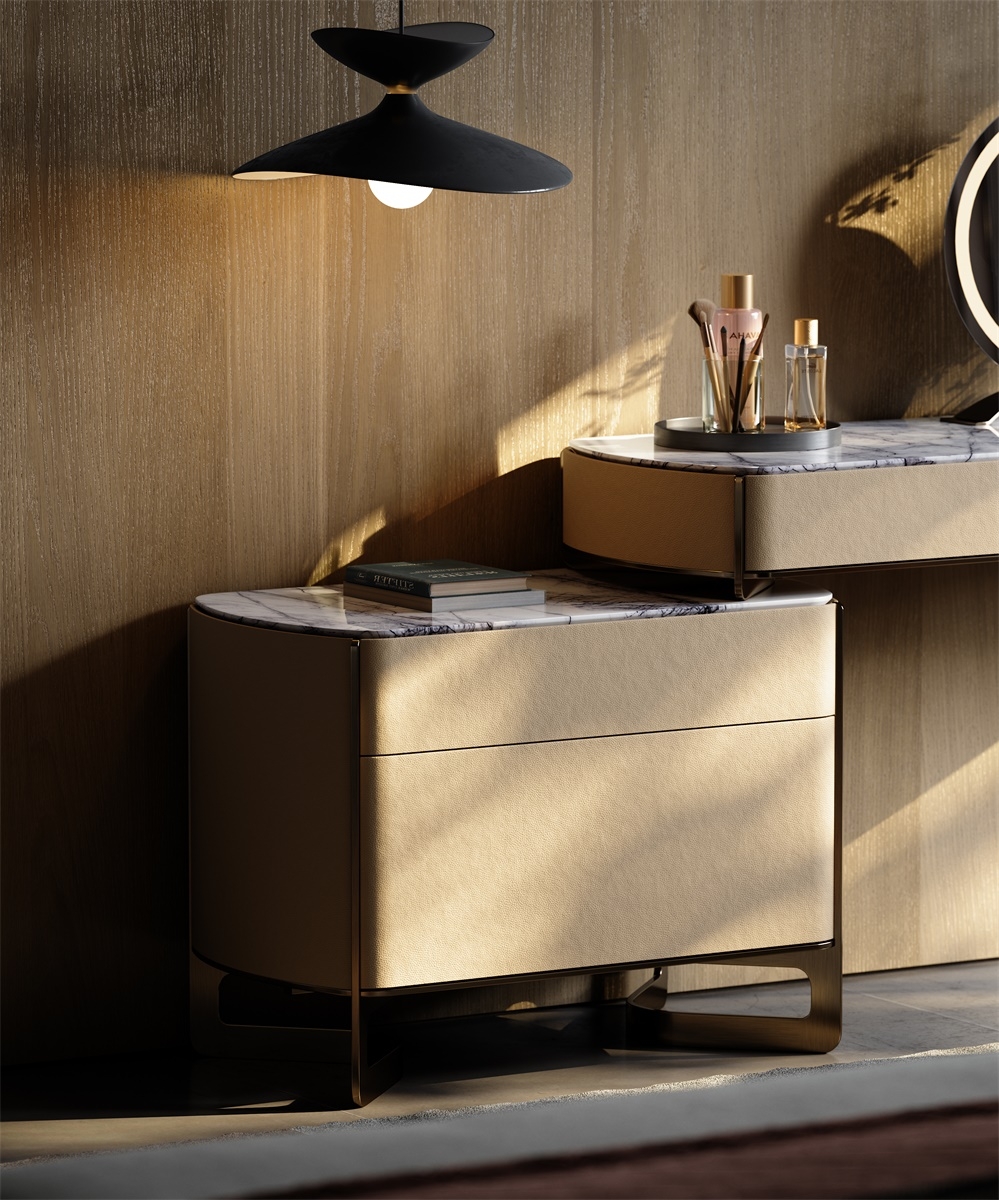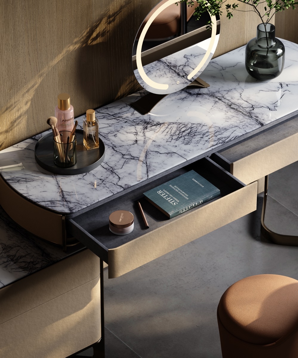 The leather stitching is CNC sewing + manual trimming, with a precise needle distance of 0.2mm to fit the texture; the joints between the metal bracket and various materials are laser-welded + manually polished, smooth and burr-free; the annular mirror is matched with the table top, and is manually adjusted to adapt the angle and brightness to the beauty scene, integrating "exquisite detailism" into every makeup structure.