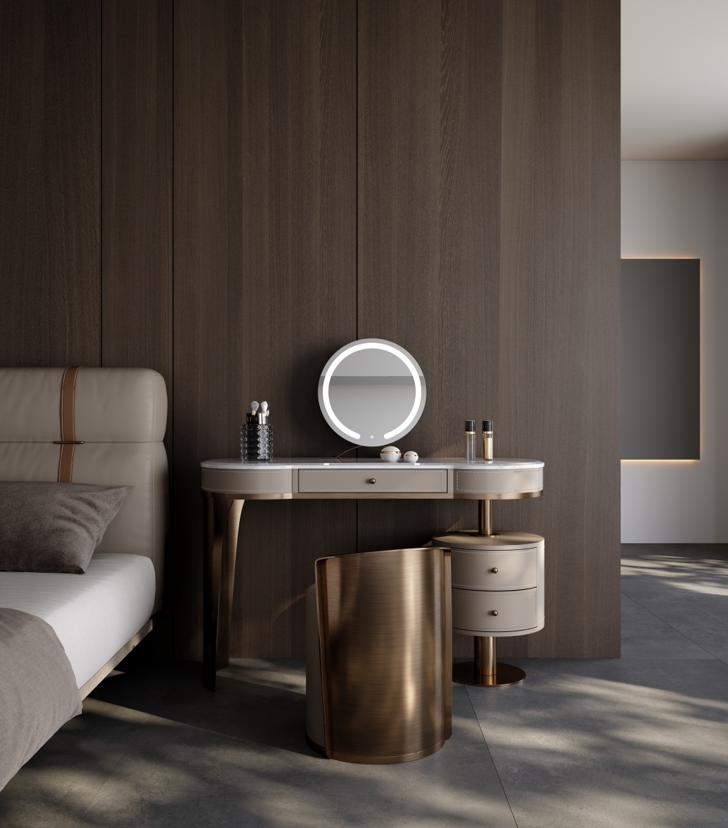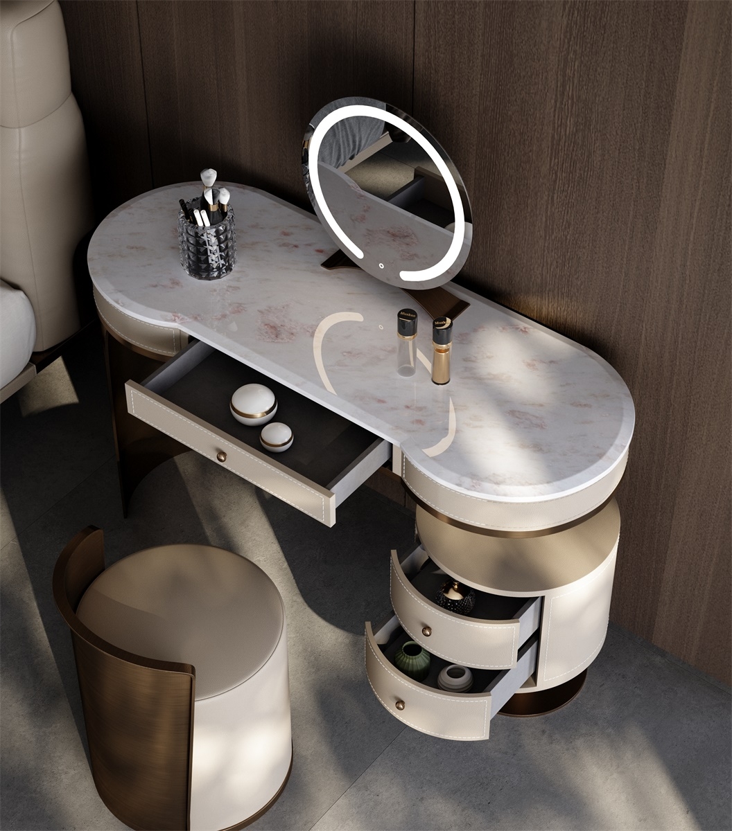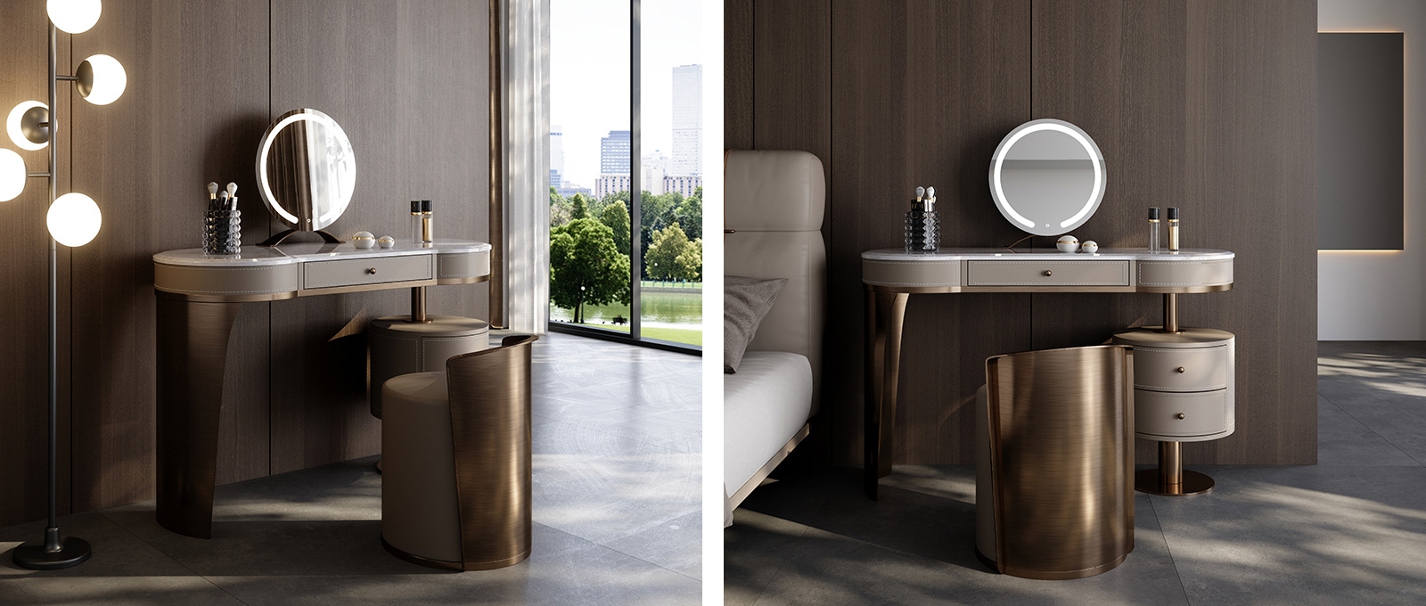 The rounded corner design and exquisite leather edging showcase the designer's ultimate pursuit of details. The circular drawer design gives the makeup stand a three-dimensional and modern feel. Metal curved surface, exhibiting master level craftsmanship.