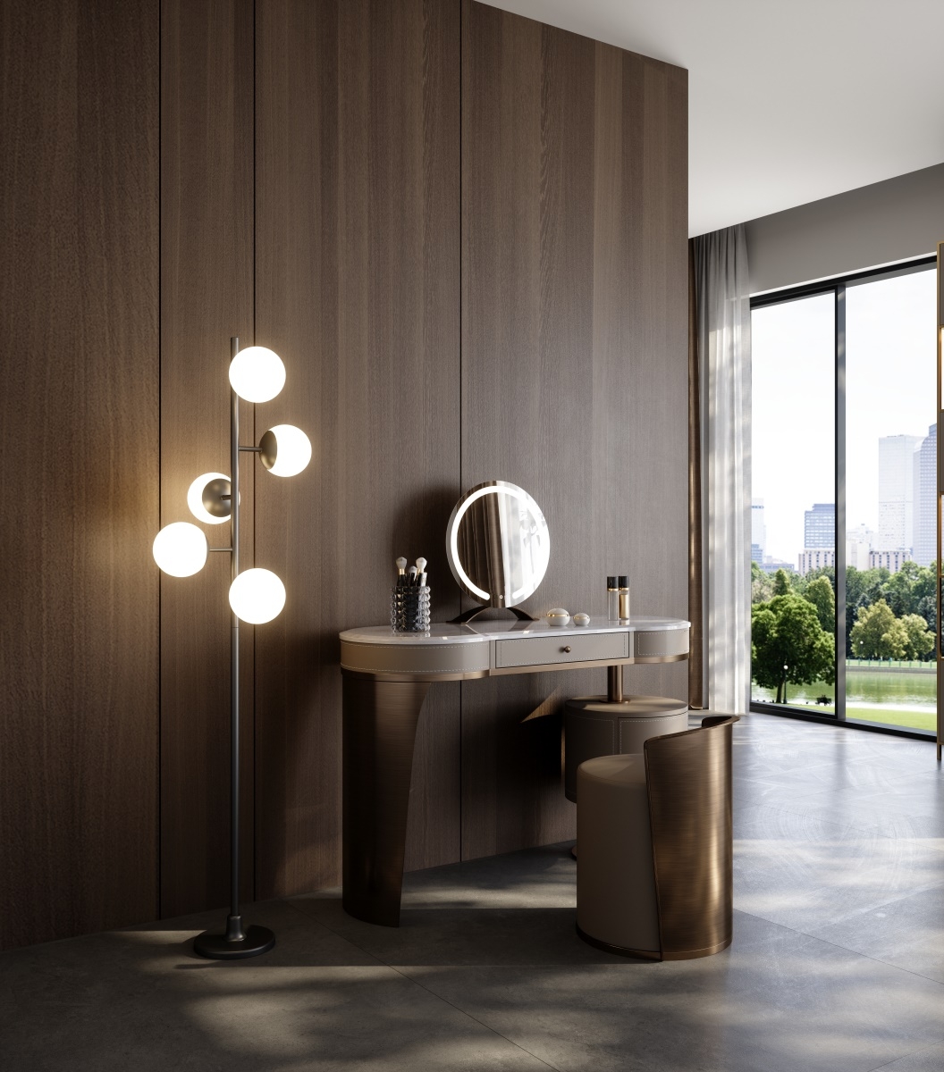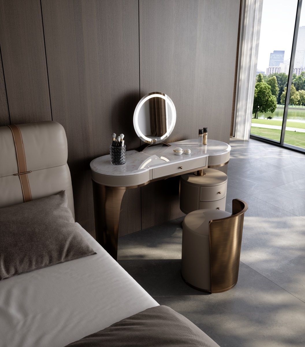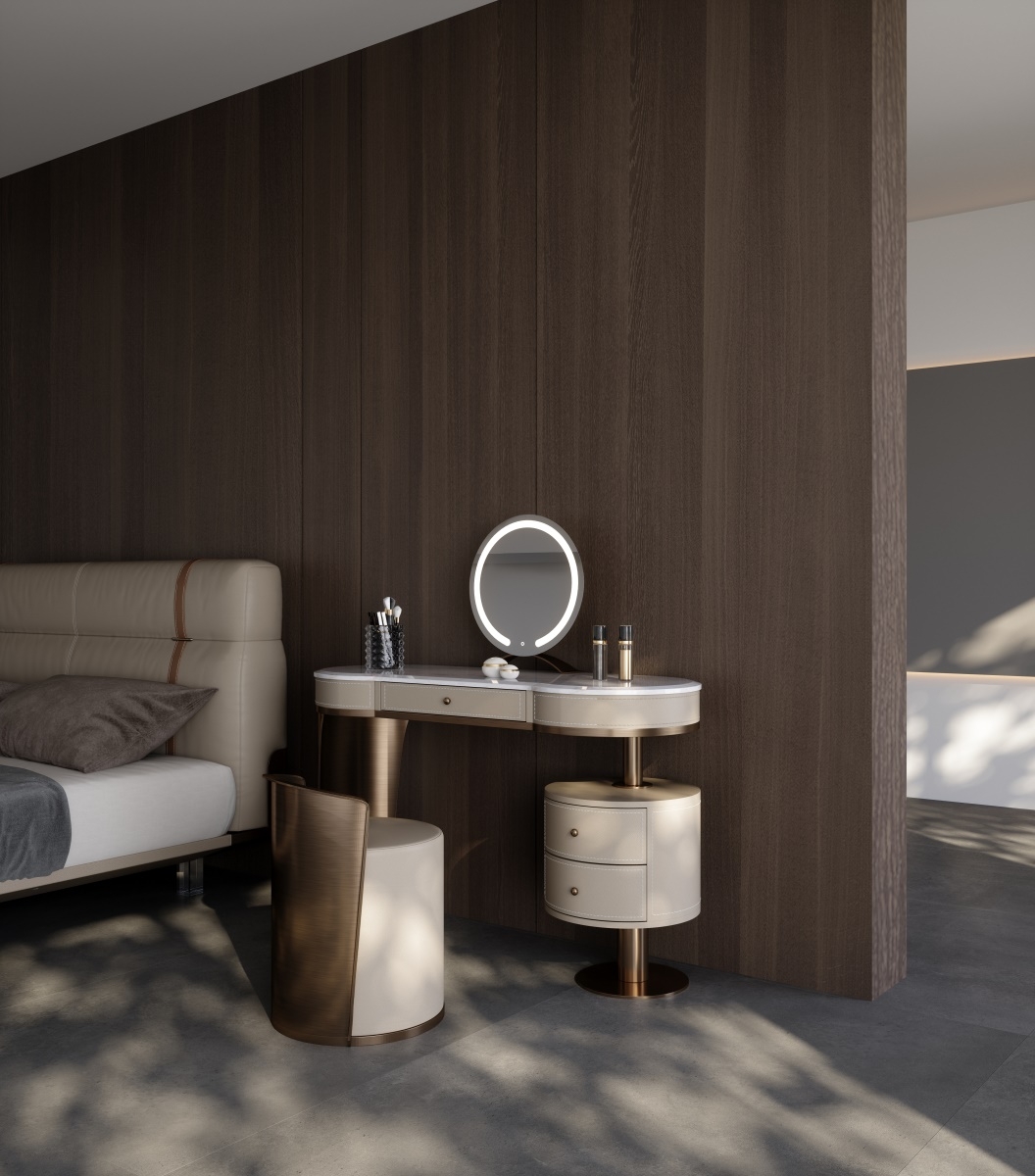 The rounded corner design and exquisite leather edging showcase the designer's ultimate pursuit of details. The circular drawer design gives the makeup stand a three-dimensional and modern feel. Metal curved surface, exhibiting master level craftsmanship.