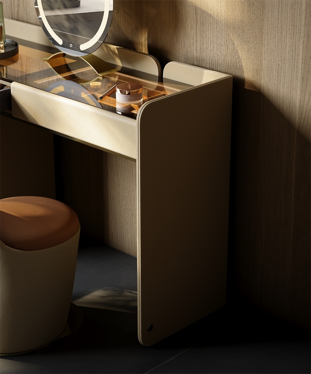 The side panels extend in a symmetrical wing like shape, effectively protecting the desktop from collisions and carefully preventing makeup from accidentally falling off. The cabinet and makeup stand are ingeniously integrated to create ample storage space, allowing various makeup products to be organized in an orderly manner, both aesthetically pleasing and practical.