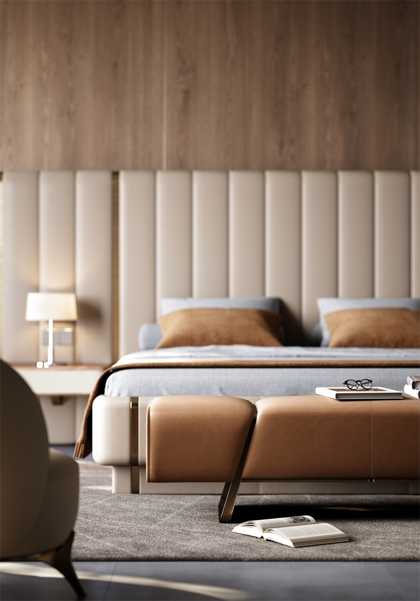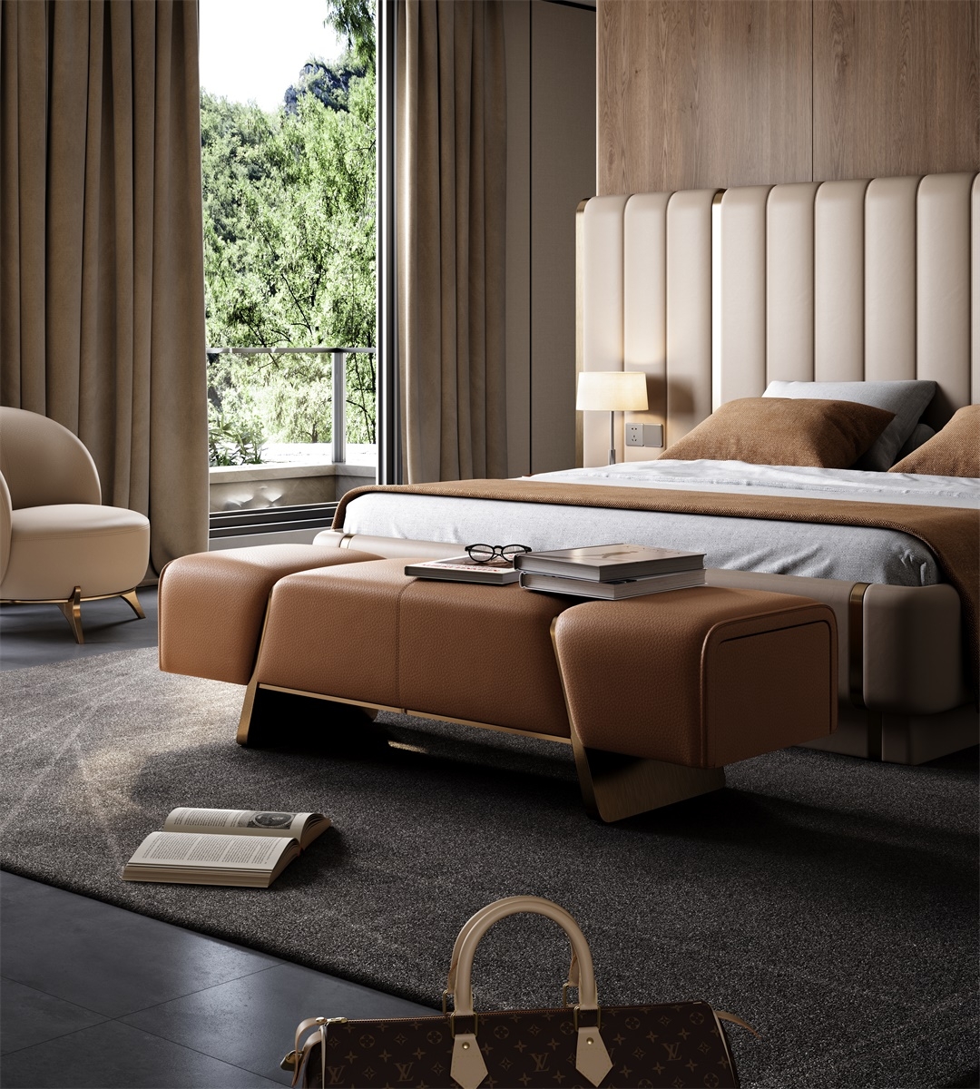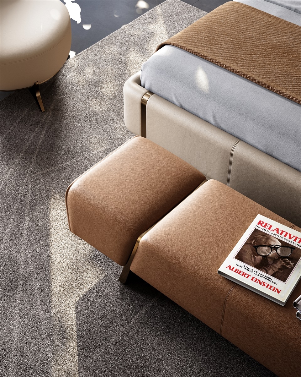 The support structure made of pure metal is firmly embedded in both sides of the bed end stool, forming a hard and soft visual effect with the soft leather, like a bridge at the end of the bed guarding the dream time.
