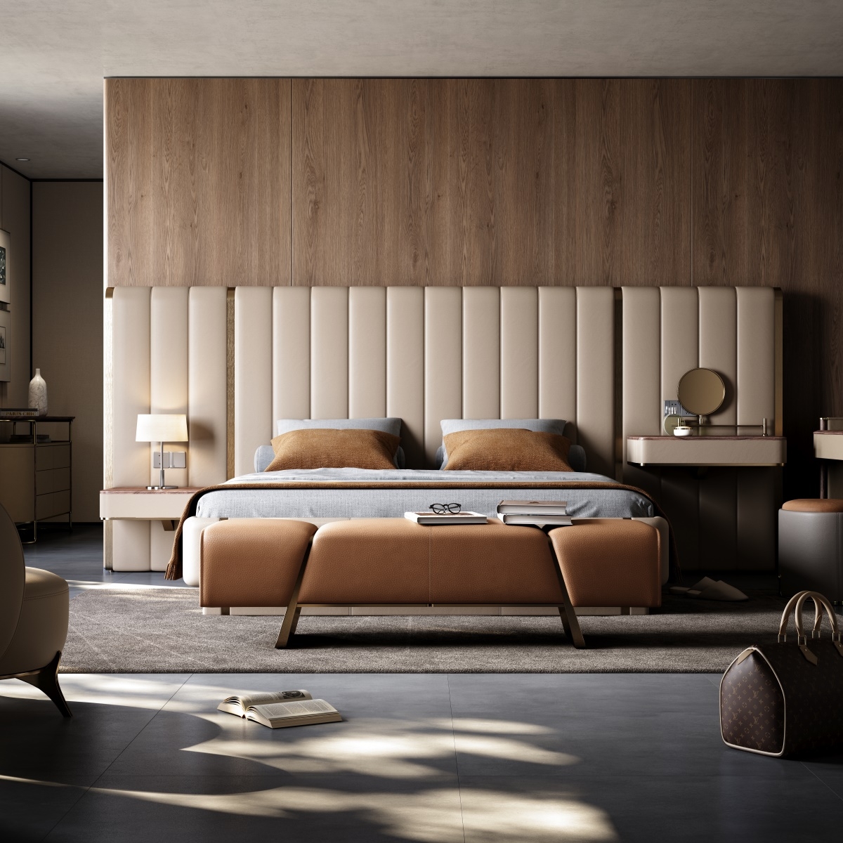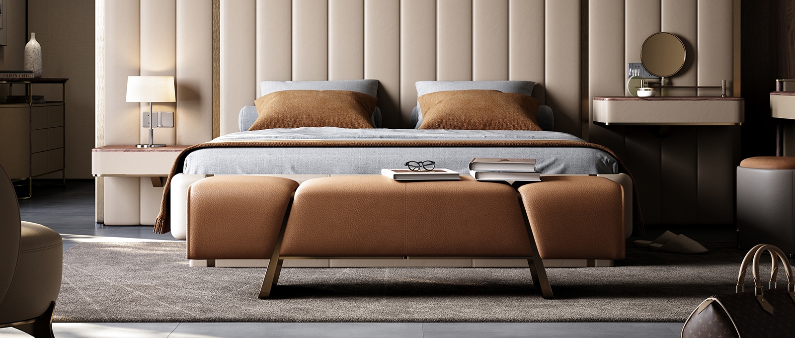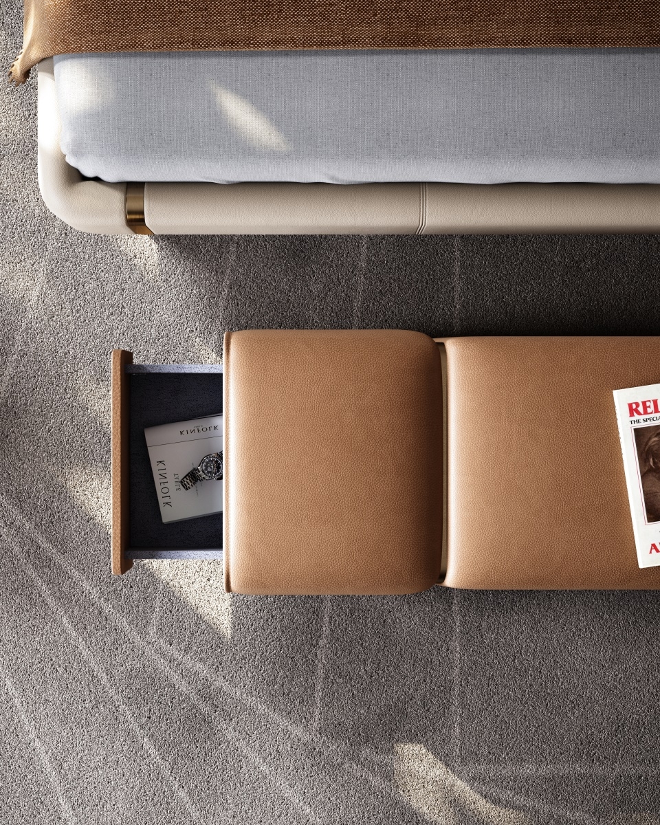 The support structure made of pure metal is firmly embedded in both sides of the bed end stool, forming a hard and soft visual effect with the soft leather, like a bridge at the end of the bed guarding the dream time.