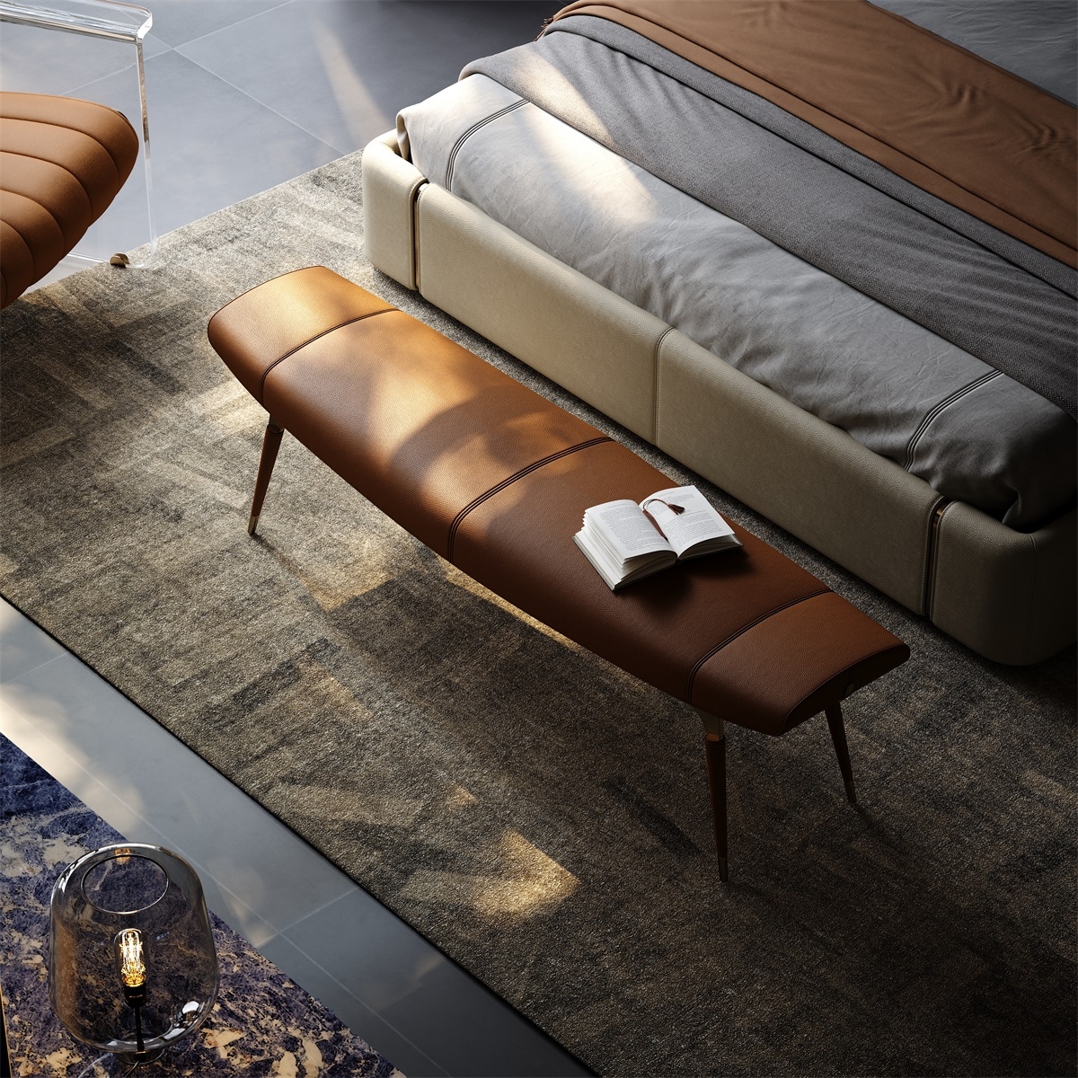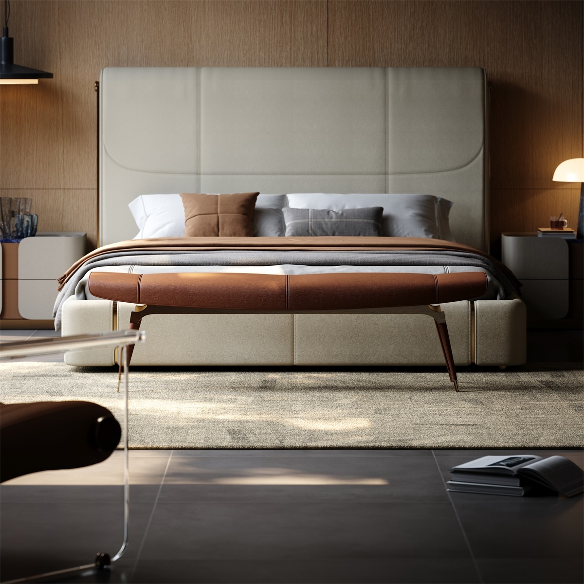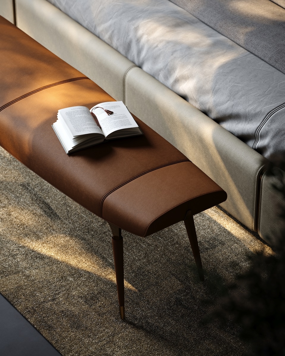 in design, providing stable load-bearing while creating a strong visual contrast with the storage volume.