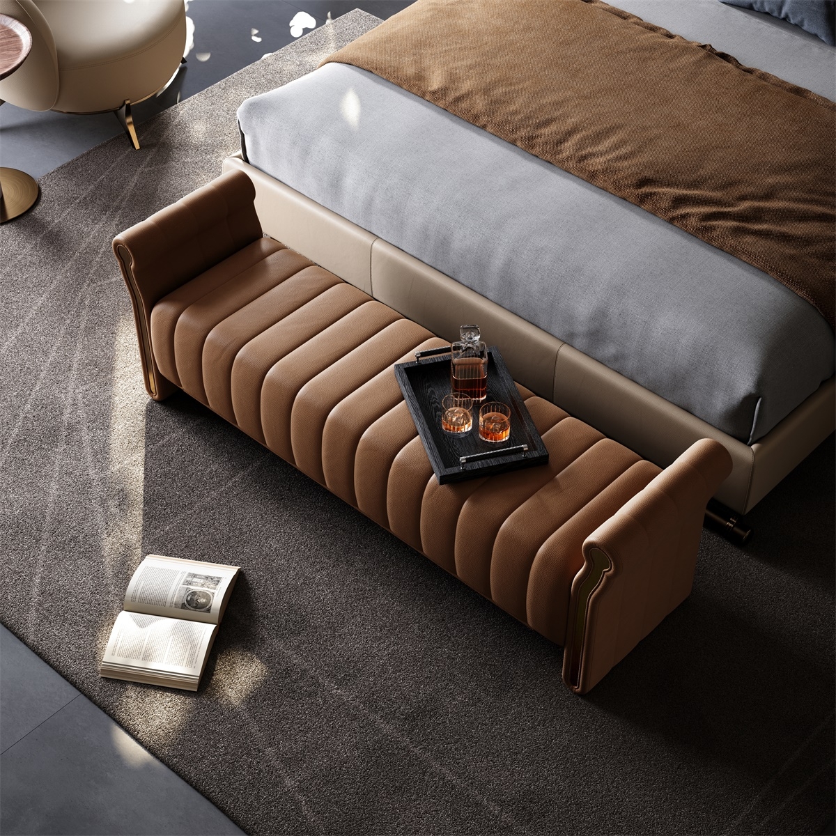 Tufted Leather Bench with Scroll Arms Vintage - Style Brown Leather Ottoman