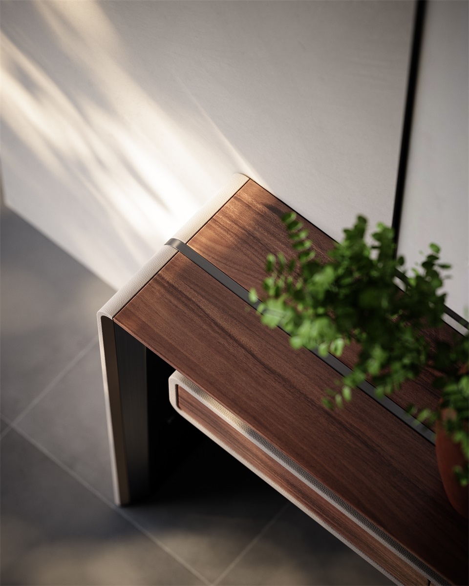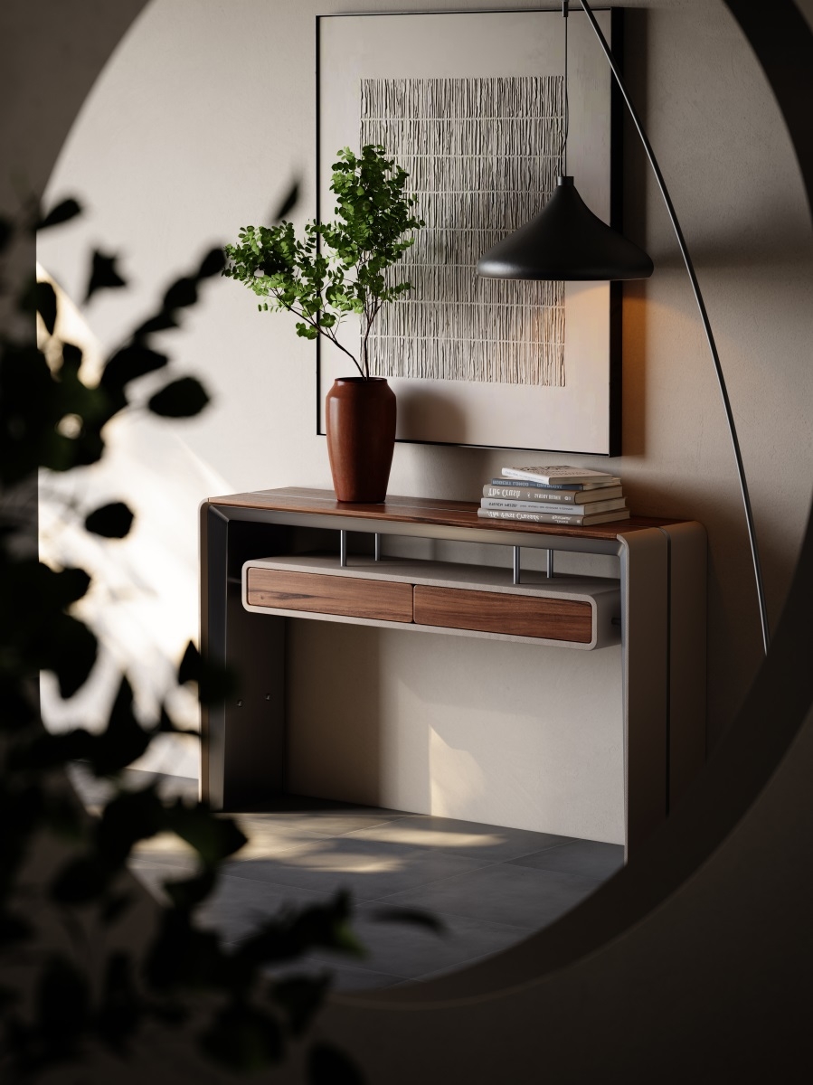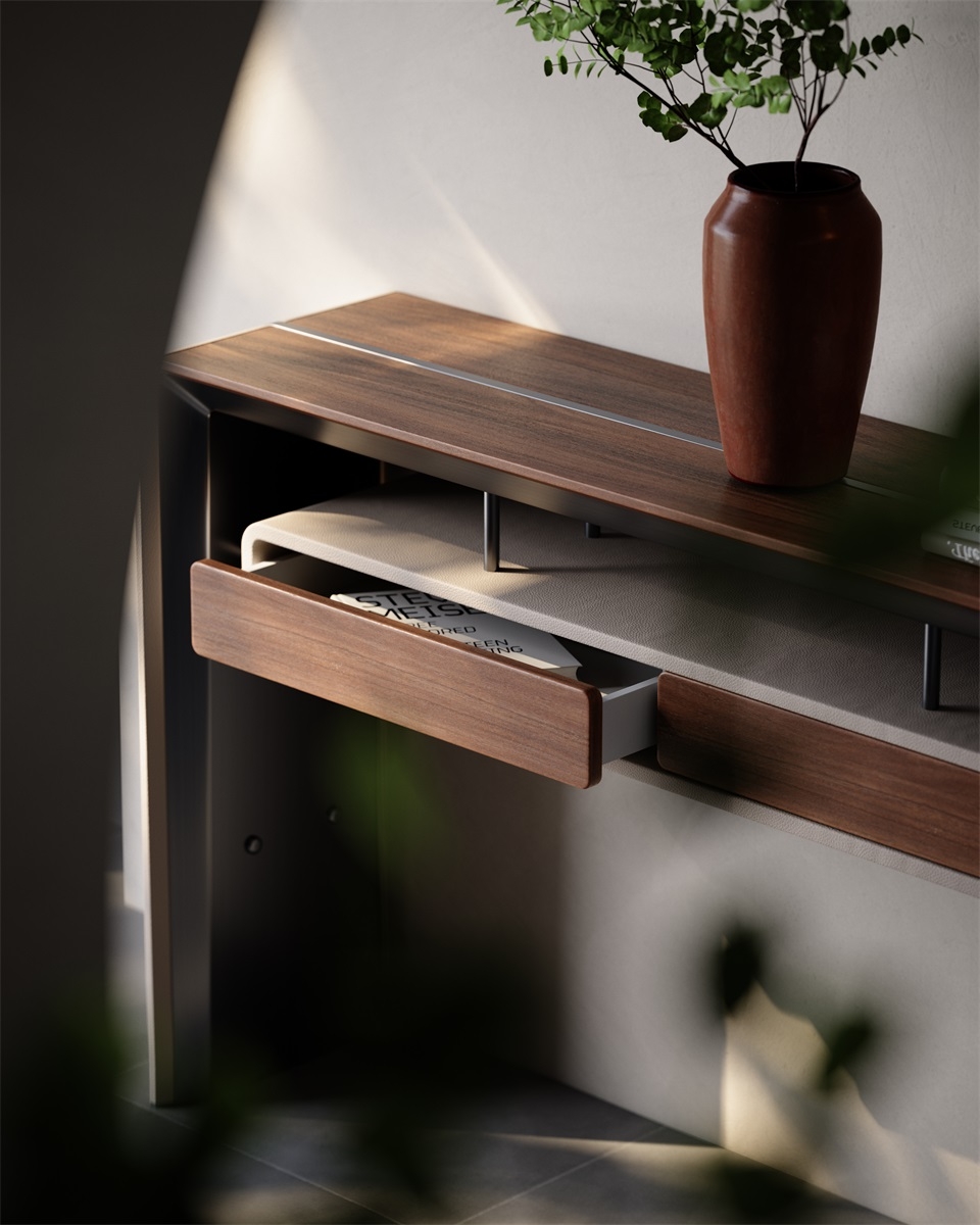 No need to compete with other beauties, at the top of Kunlun, one can fully display the style of a king. Entering the field of vision with a majestic and majestic posture, concealing the mind of the master craftsman, although not showing the mountains or dew, but hiding the universe inside.Elevate your space with this exquisite console table. Crafted with a rich wooden top and sleek metal frame, it features elegant drawers for storage. Topped with a stylish vase and curated books, it's a perfect blend of functionality and high - end design, ideal for entryways or living areas.