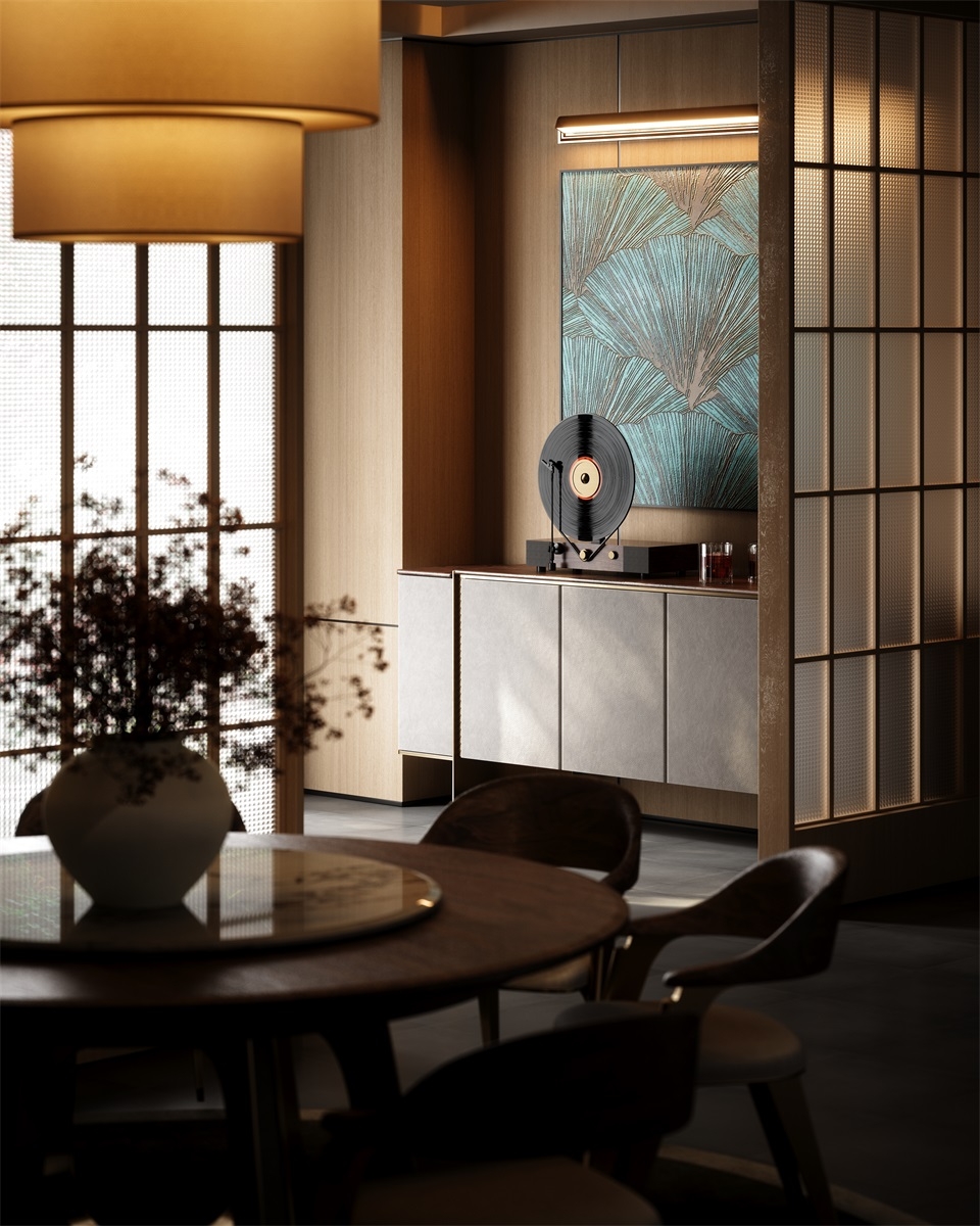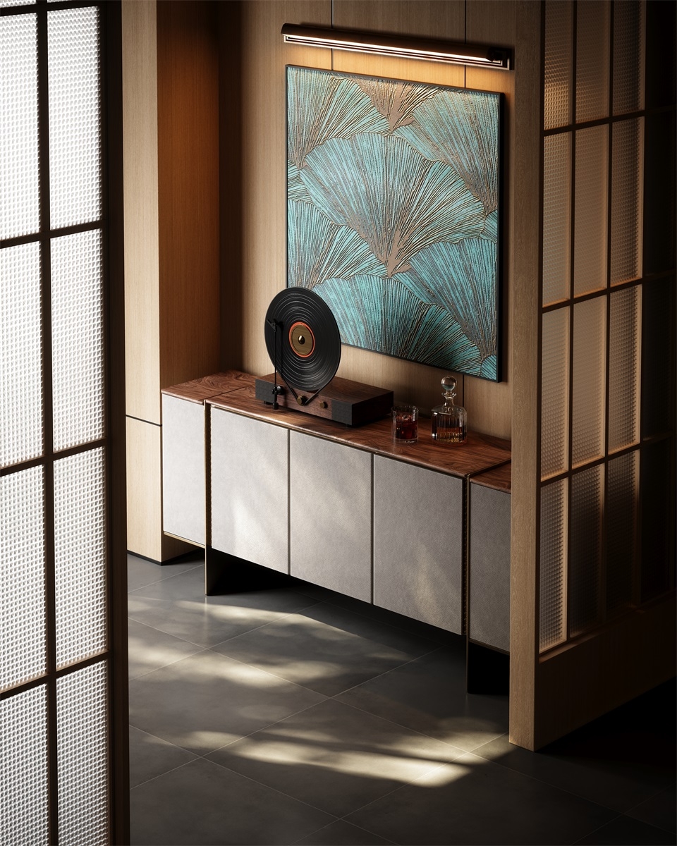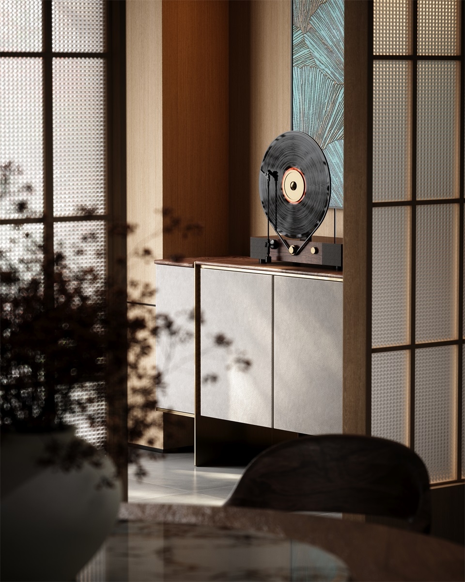 Retro - style sideboard with vinyl record player, luxury living room decor