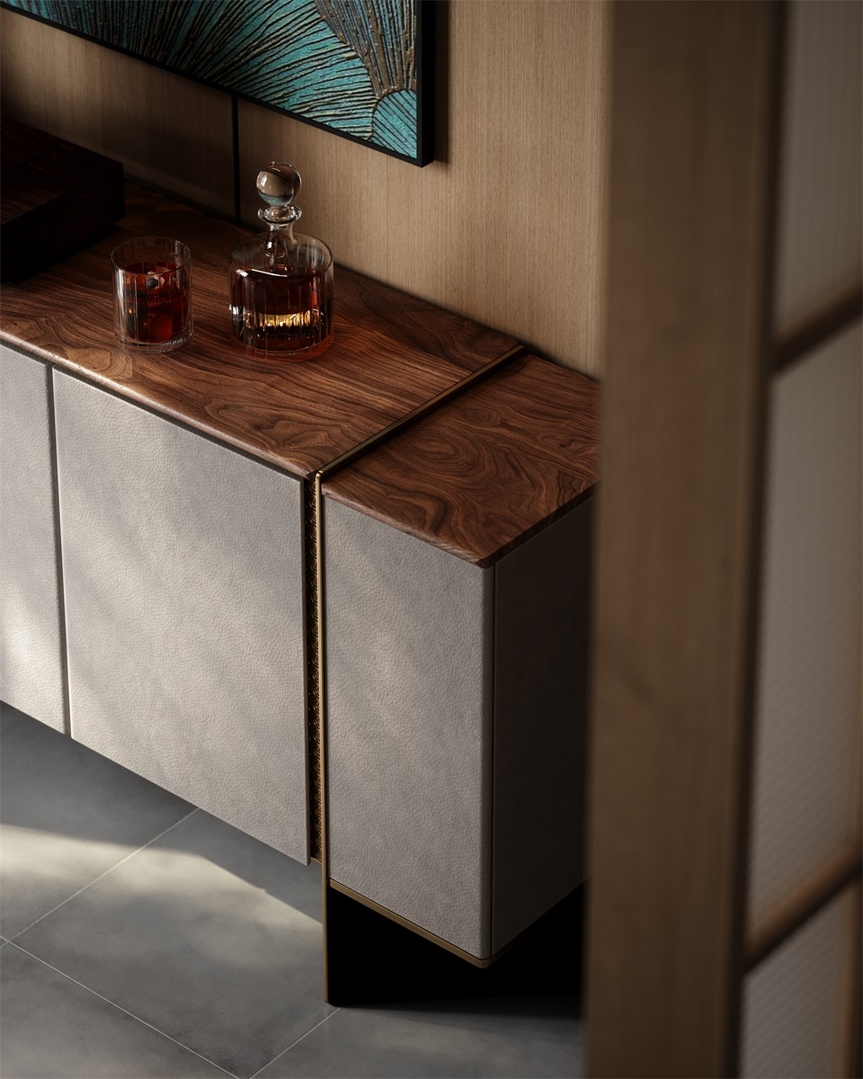 Leather - wrapped sideboard with metal accents, luxury home bar furniture