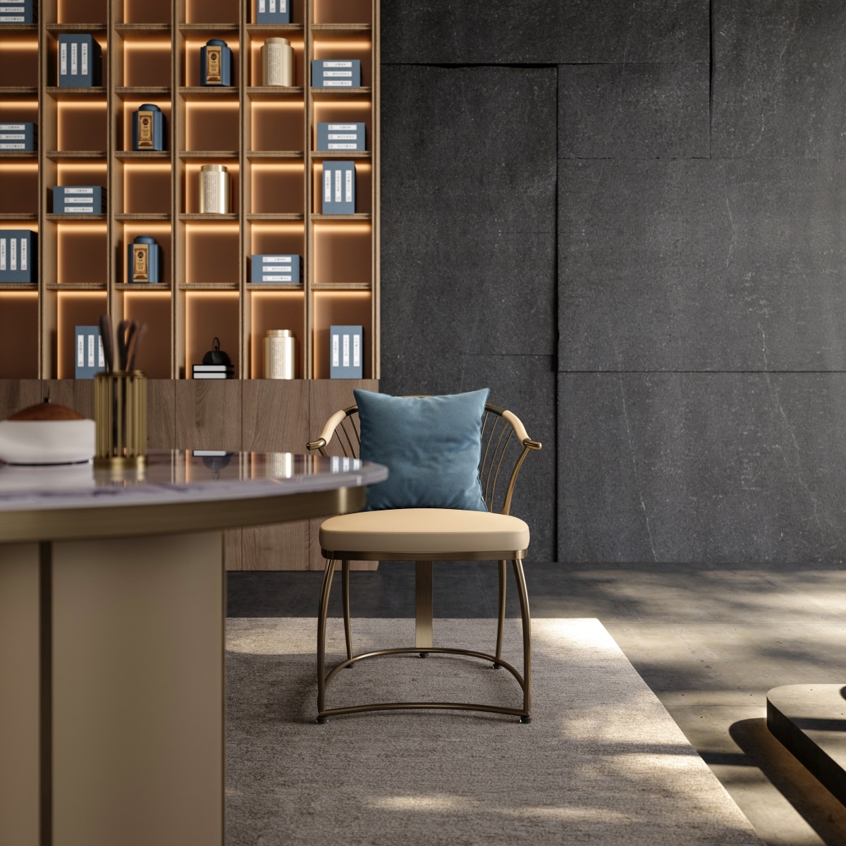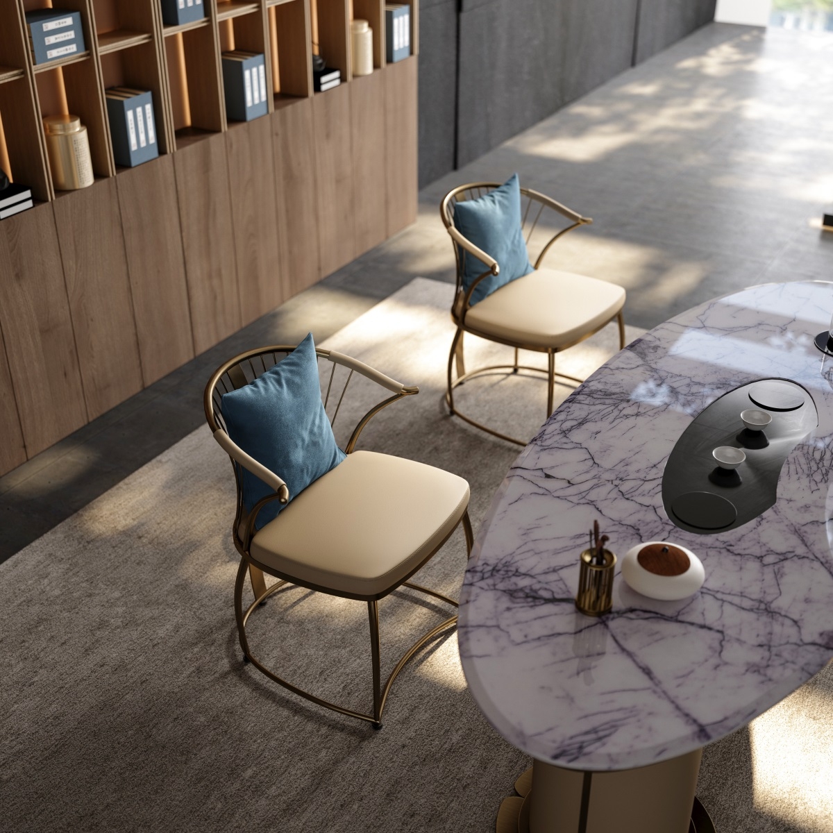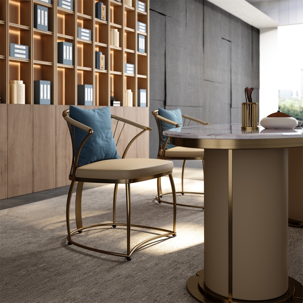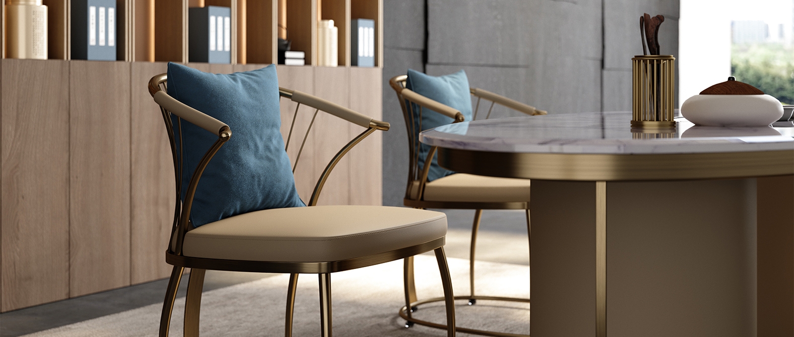 Joy is a life attitude. True happiness lies in ordinary life. Keep a happy heart and turn it into beautiful notes.Combines beige upholstered seat with metallic bronze - toned metal frame. Creates a refined, modern look.The curved, slatted backrest adds artistic flair and breathability.
