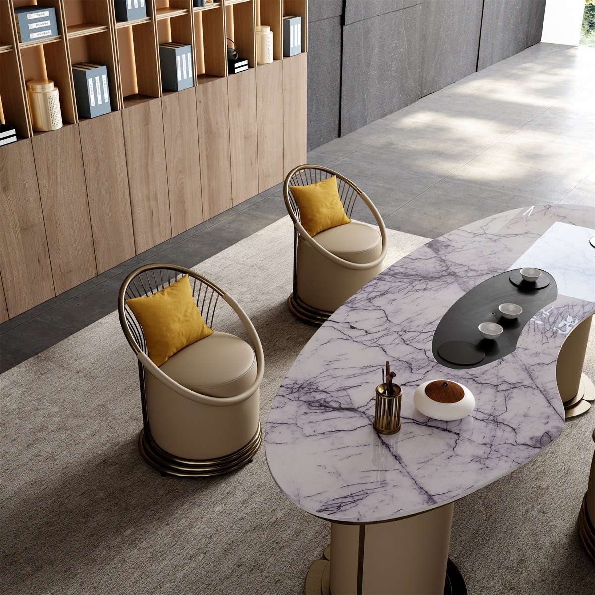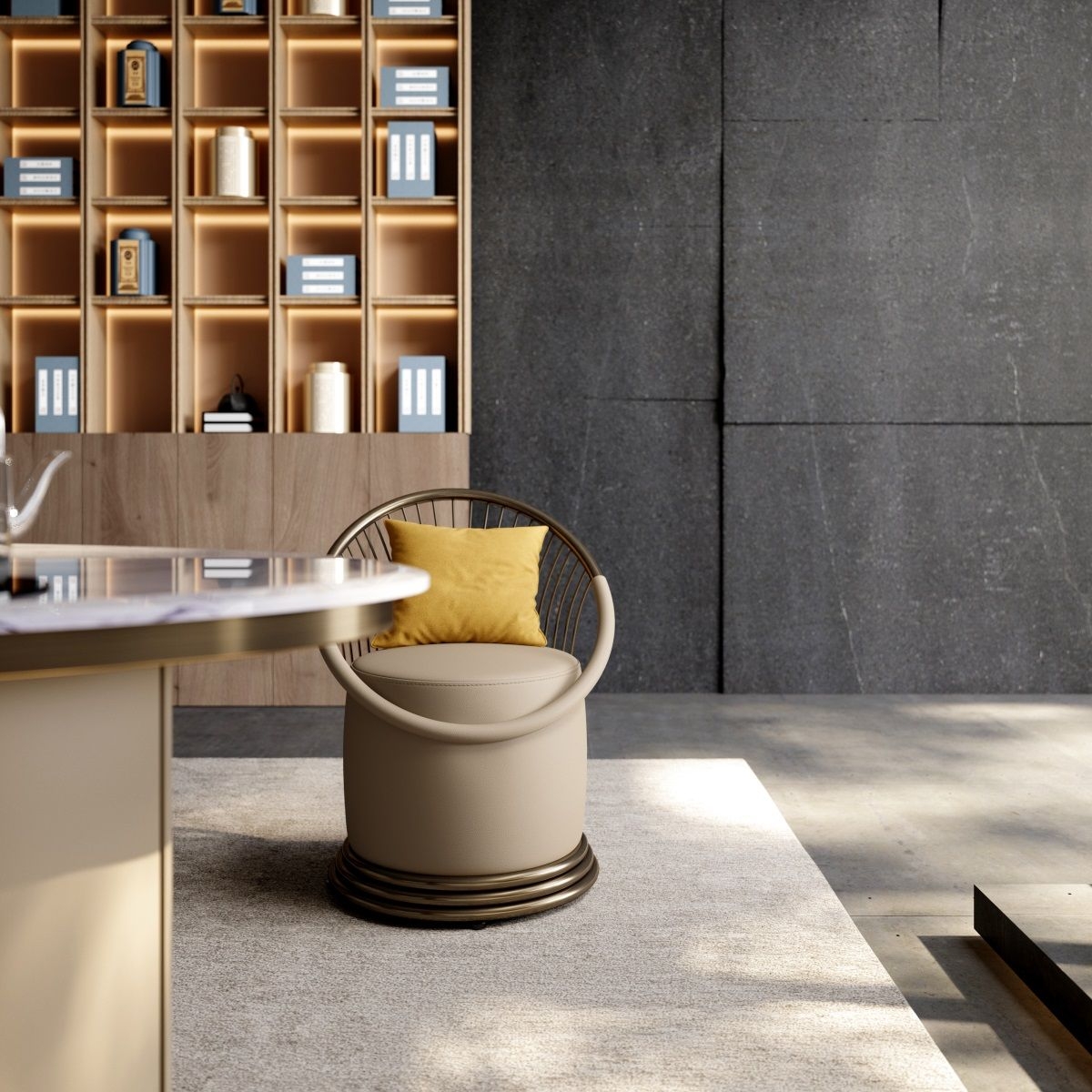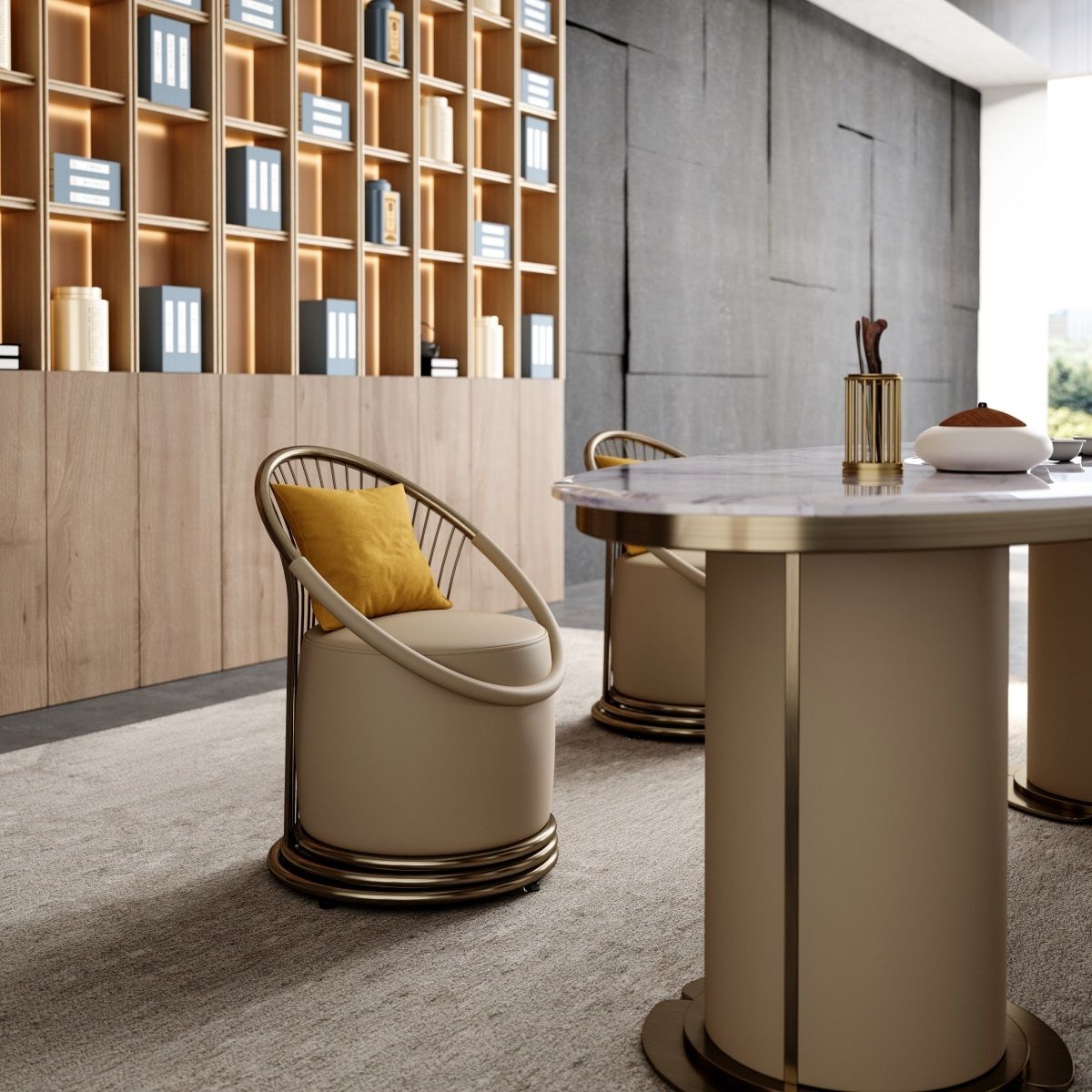 Yue is an attitude towards life, and true happiness lies in ordinary life. Maintaining a happy heart turns into beautiful notes.Indulge in the luxury of this barrel - shaped armchair. Upholstered in smooth, beige leather, it offers a plush and inviting seat. The curved, metallic bronze frame adds a touch of opulence, while the vibrant, mustard - colored cushion brings a pop of color and extra comfort.Perfect for a chic lounge area or as a statement piece in any high - end interior, this chair combines style and relaxation seamlessly.