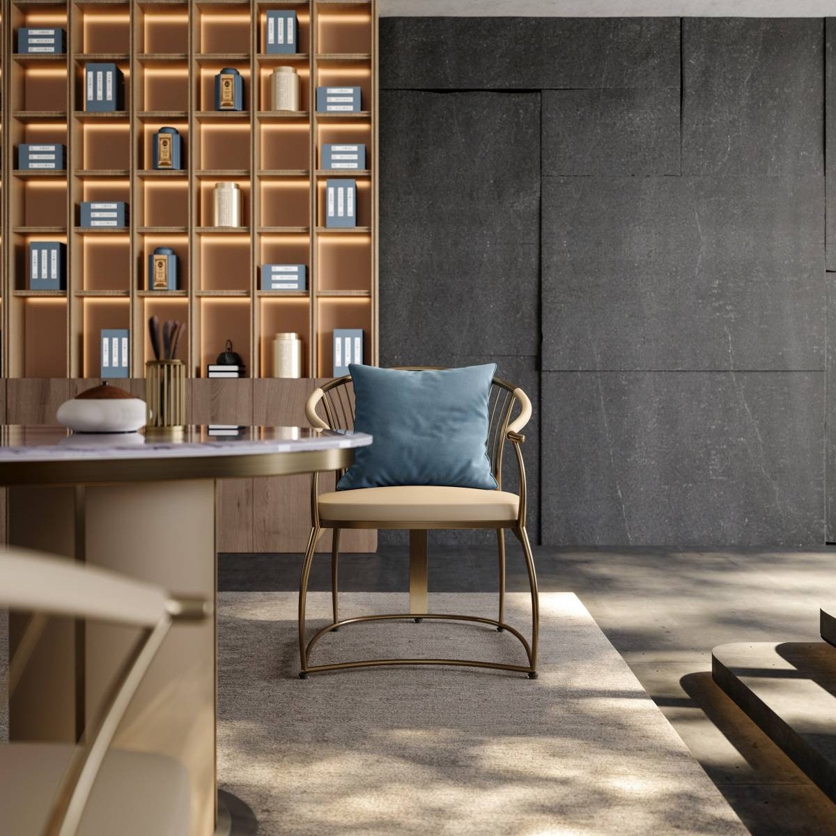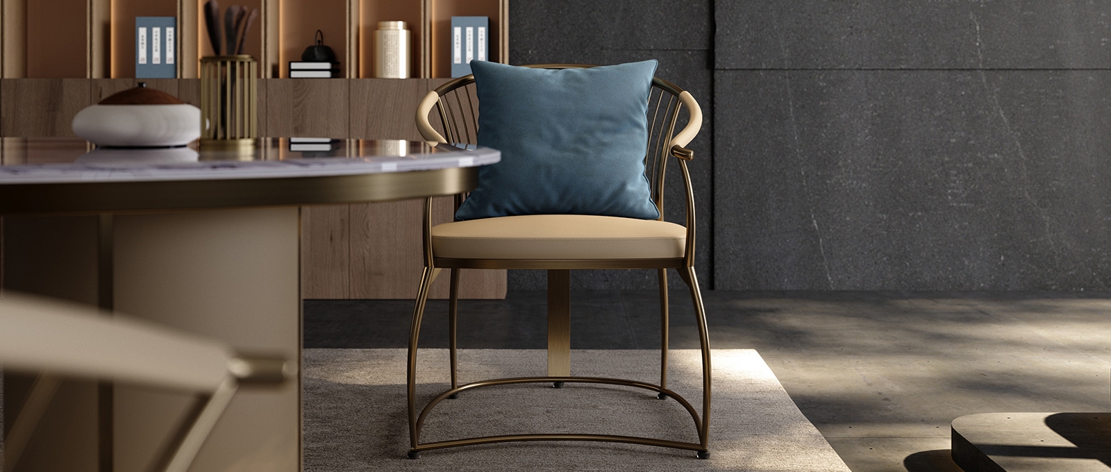 The design of the armchair perfectly blends modernity with traditional elements. The backrest is composed of vertical metal strips, which are both lightweight and rhythmic. The chair seat is made of soft cushioning material, providing just the right amount of comfort.