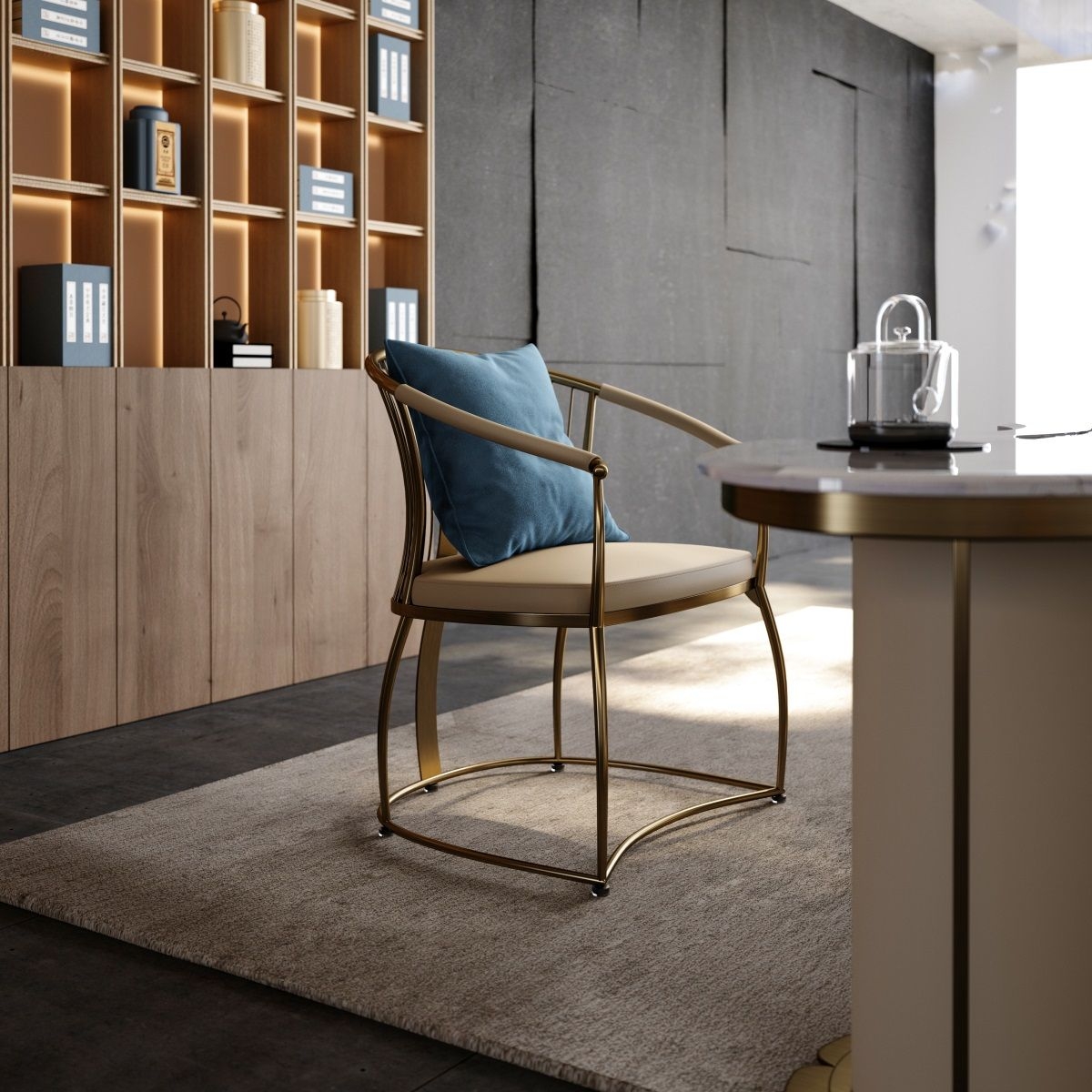 Yue is an attitude towards life, and true happiness lies in ordinary life. Maintaining a happy heart turns into beautiful notes.Elevate your space with this stunning armchair. The frame, crafted from polished bronze - toned metal, features an elegant, curved design. Upholstered in soft, beige leather on the seat and armrests, it offers both comfort and a touch of luxury.Perfect for a modern living room or as a statement piece in any refined interior, this chair blends contemporary style with timeless elegance.