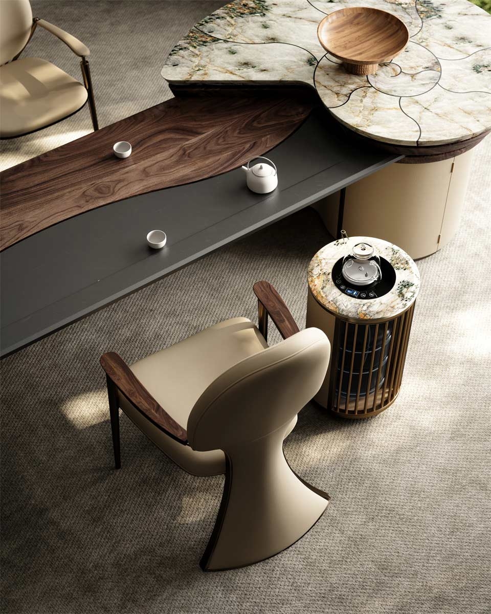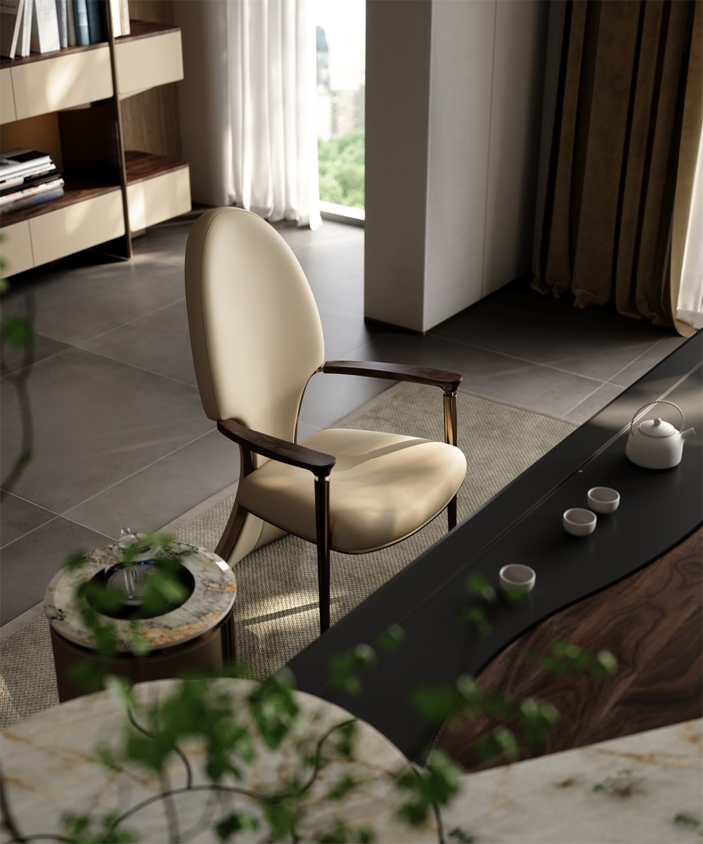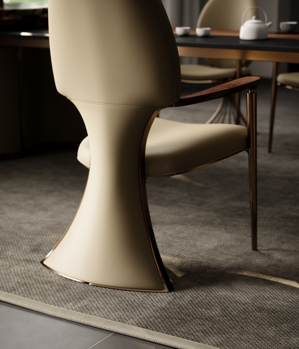Incorporating elegant tailcoat elements into the backrest of the chair, the elliptical shape of the backrest is smooth and provides strong support for the human body. Two upright metal pillars resemble scepters, creating a grand atmosphere for both the user and the tea room space.