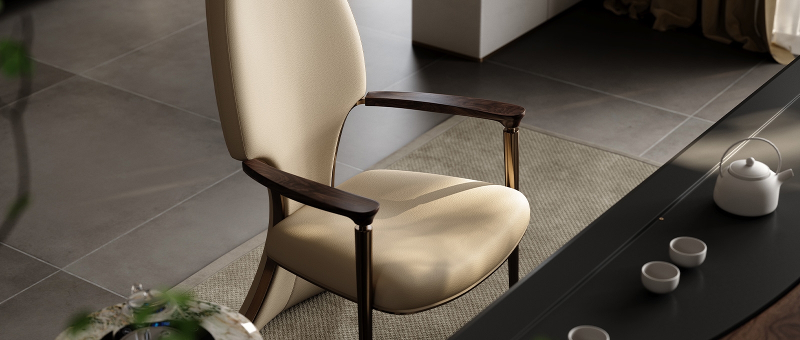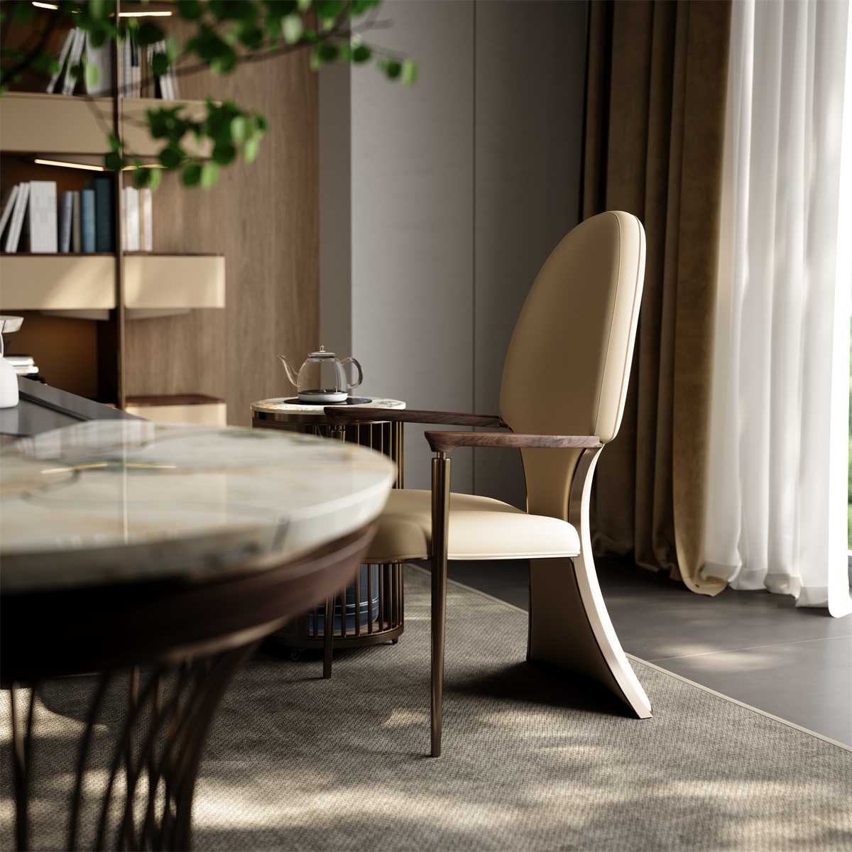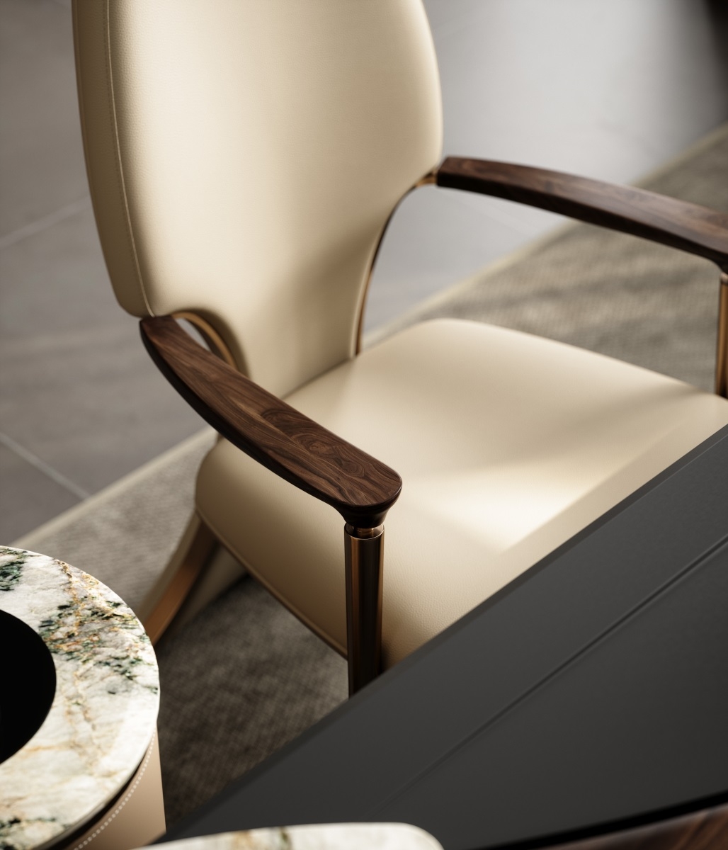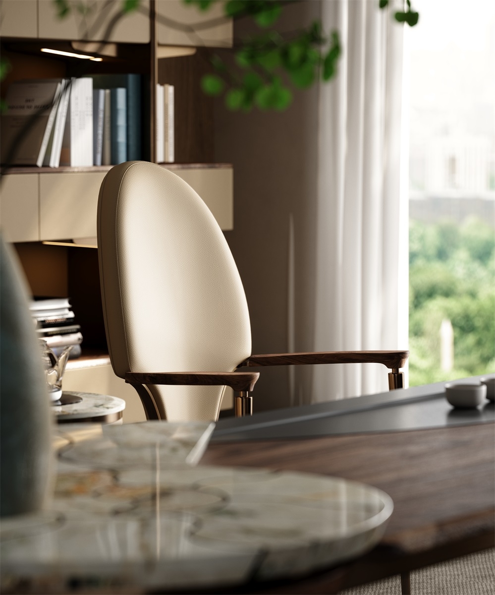 Incorporating elegant tailcoat elements into the backrest of the chair, the elliptical shape of the backrest is smooth and provides strong support for the human body. Two upright metal pillars resemble scepters, creating a grand atmosphere for both the user and the tea room space.