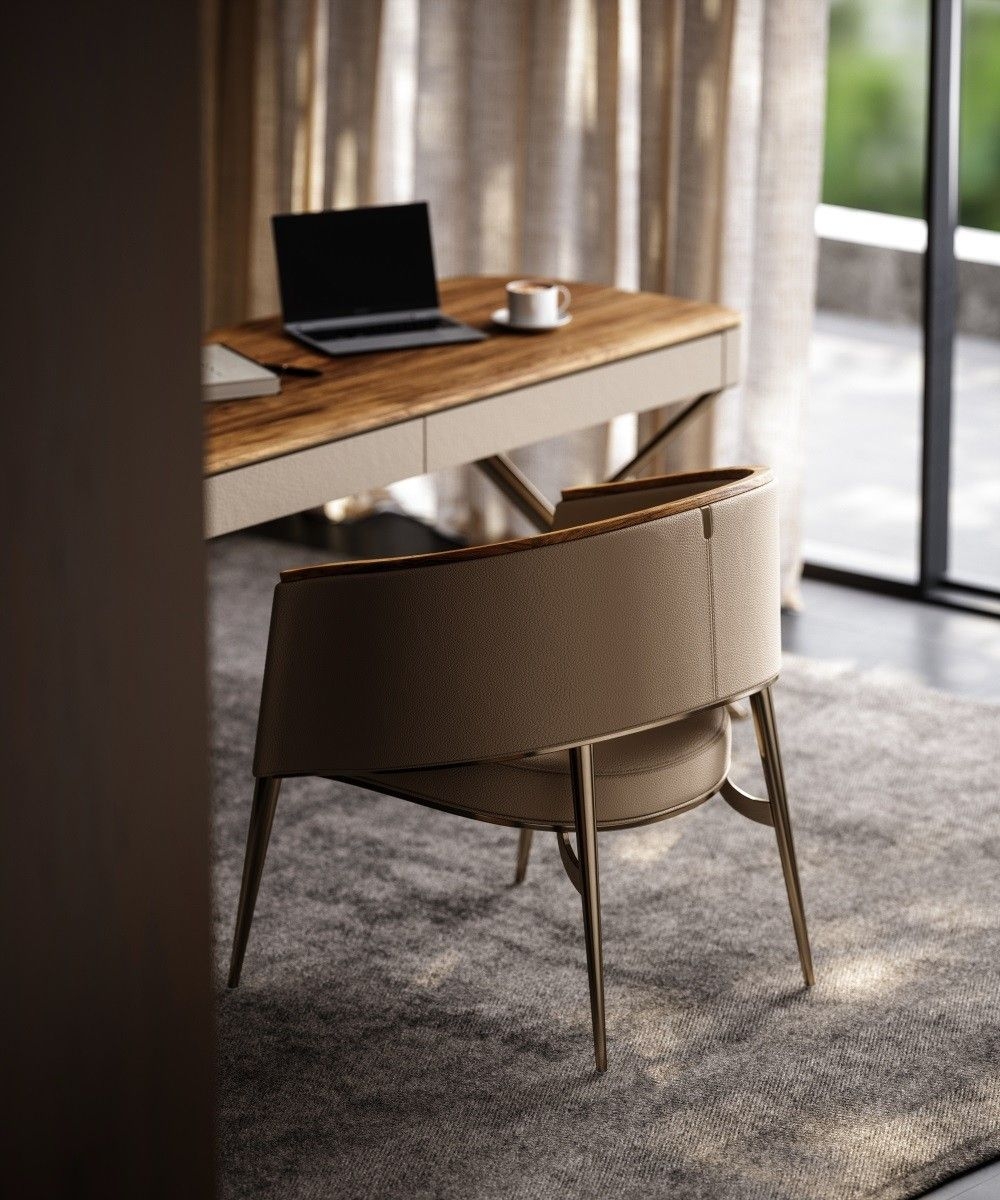 The design of the columns brings a more stable and artistic structure to the building. The modern minimalist style is used to reshape the shape, symbolizing love and responsibility.Luxury Material Mix:Combines beige leather upholstery, wooden armrest trim, and metallic legs. Creates an upscale, refined look.