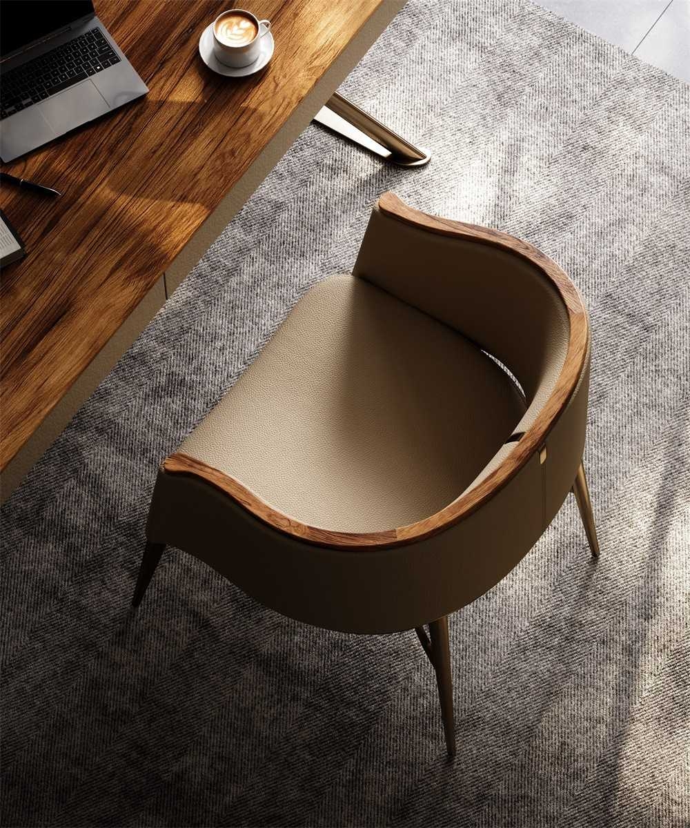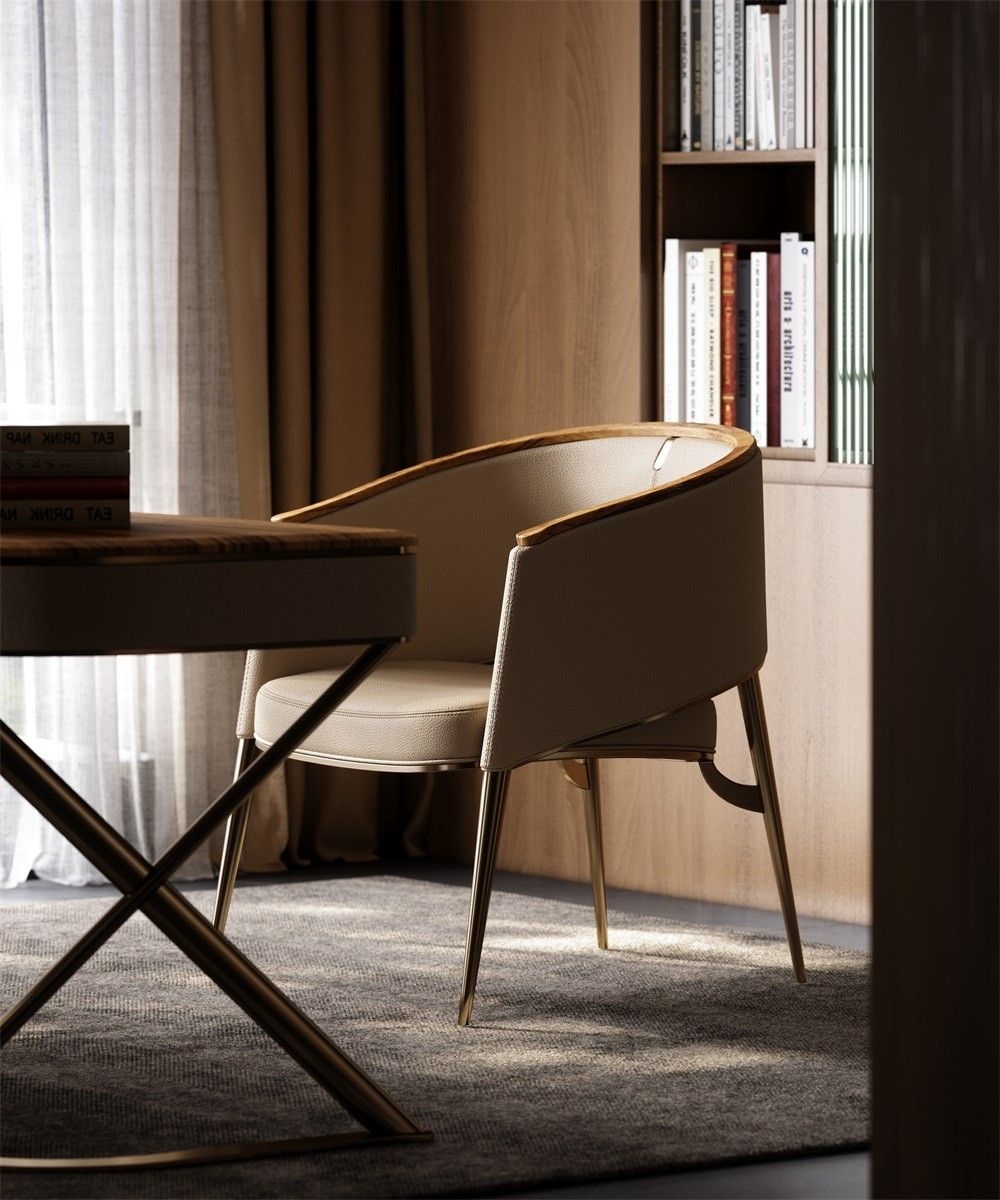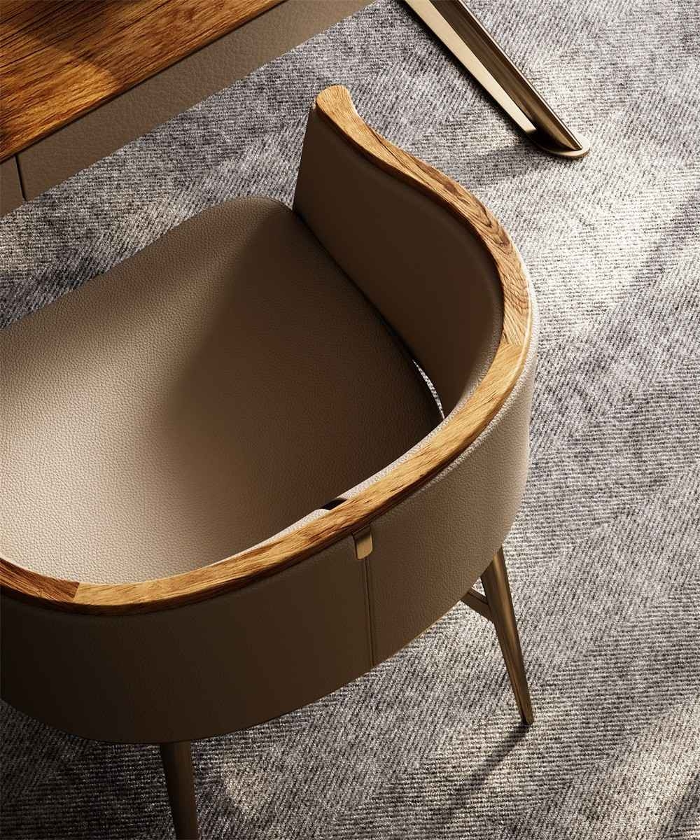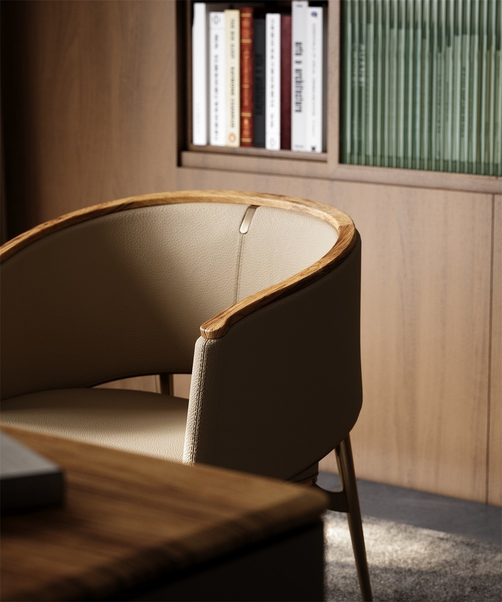The high back design of the chair has a slight arc, which not only adds a visual sense of fluidity, but also effectively supports the back. The perfect combination of wood and cushions at the armrests not only retains the natural warm texture, but also increases the comfort of use.