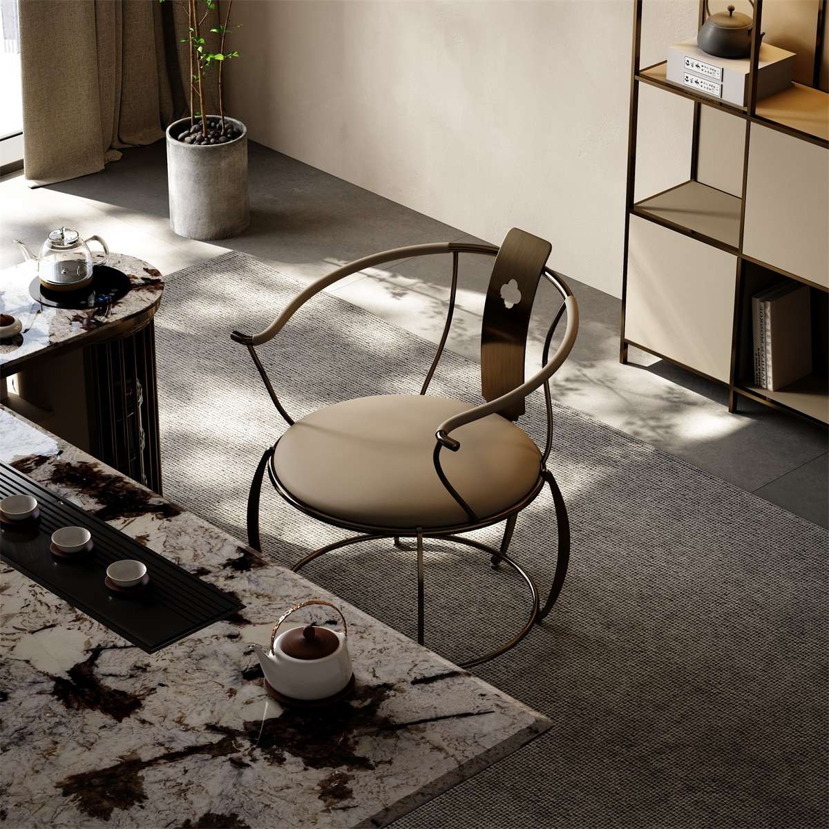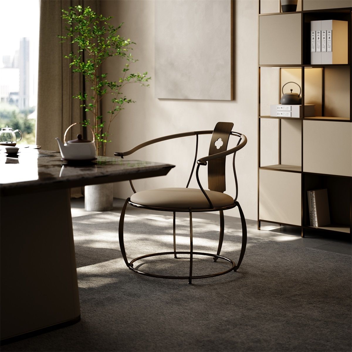 Joy is a life attitude. True happiness lies in ordinary life. Keep a happy heart and turn it into beautiful notes.Artistic Design Elements:Features a metal frame with curved lines, a wooden backrest with a cutout, and a beige upholstered seat. Blends modern and traditional aesthetics.