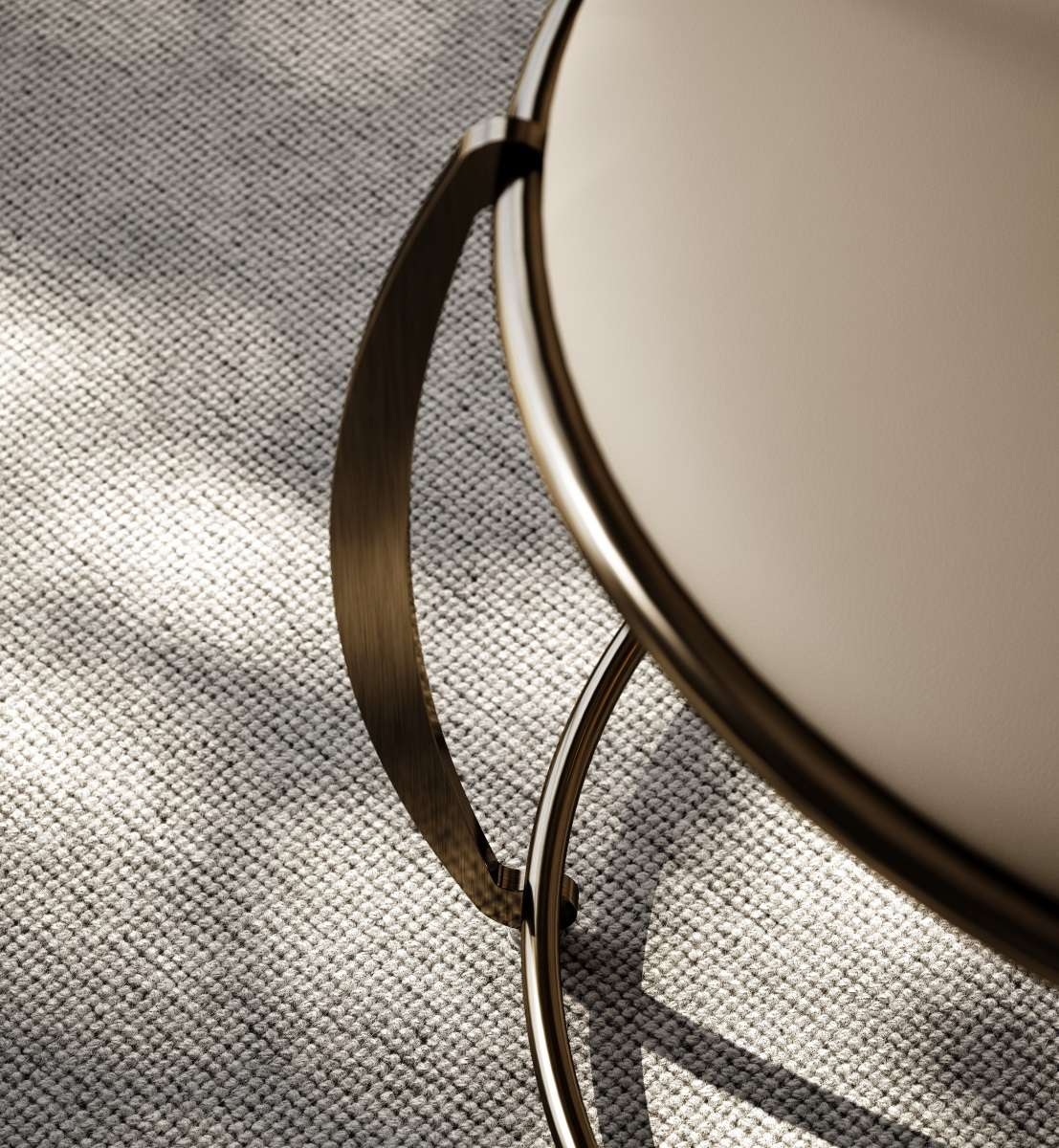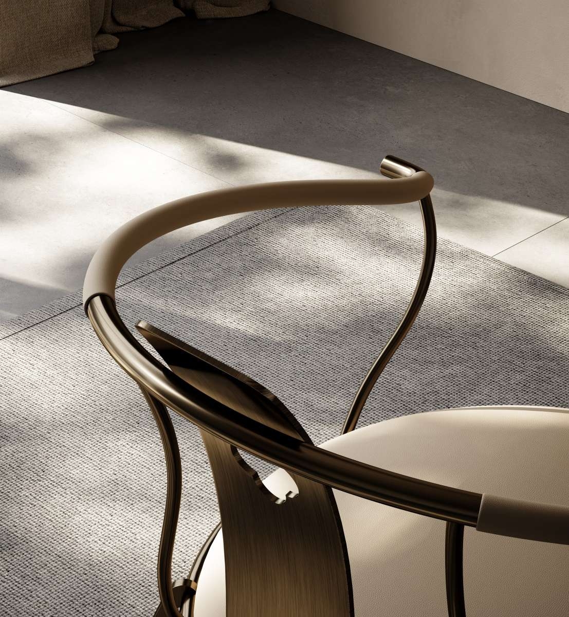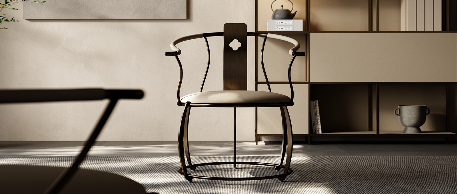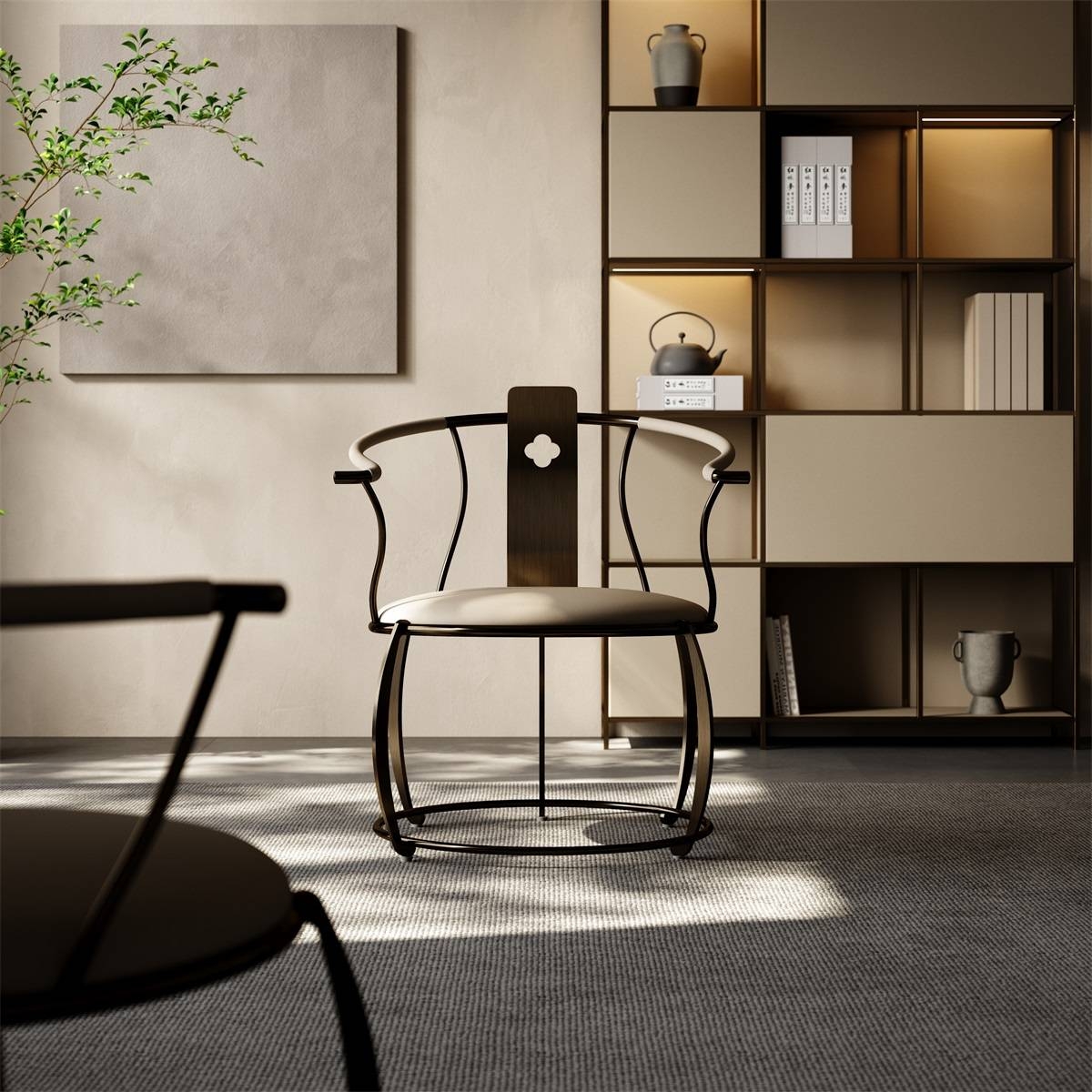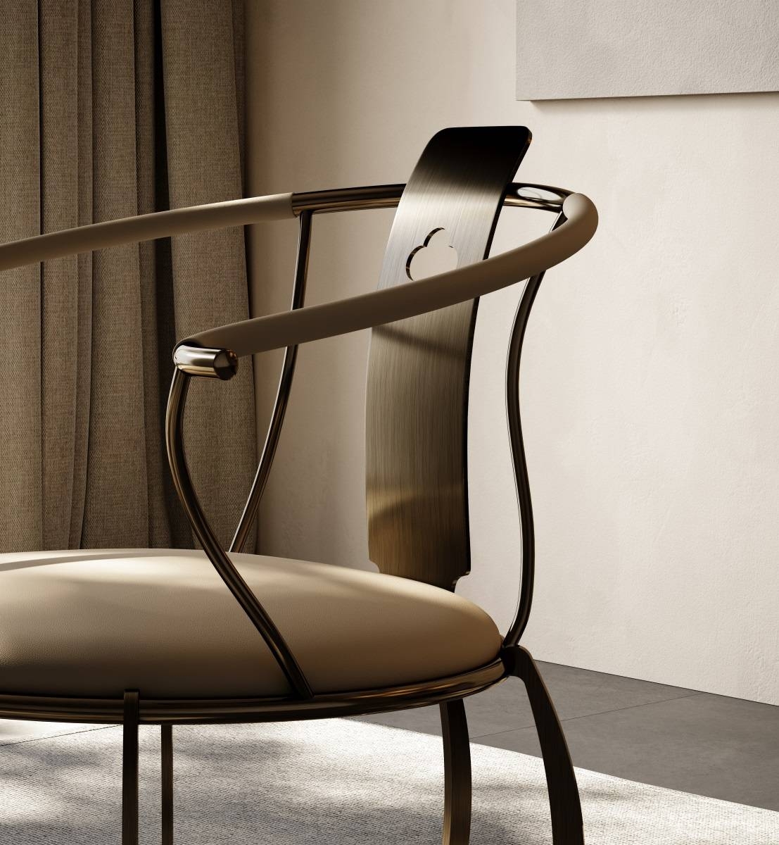 The center of the backrest adopts an elongated curved design, and the hollowed-out four-leaf clover pattern on the top adds a sense of fashion. The arc lines of the metal frame expand slightly at the base to form a drum-shaped circular structure, which is visually full and stable.
