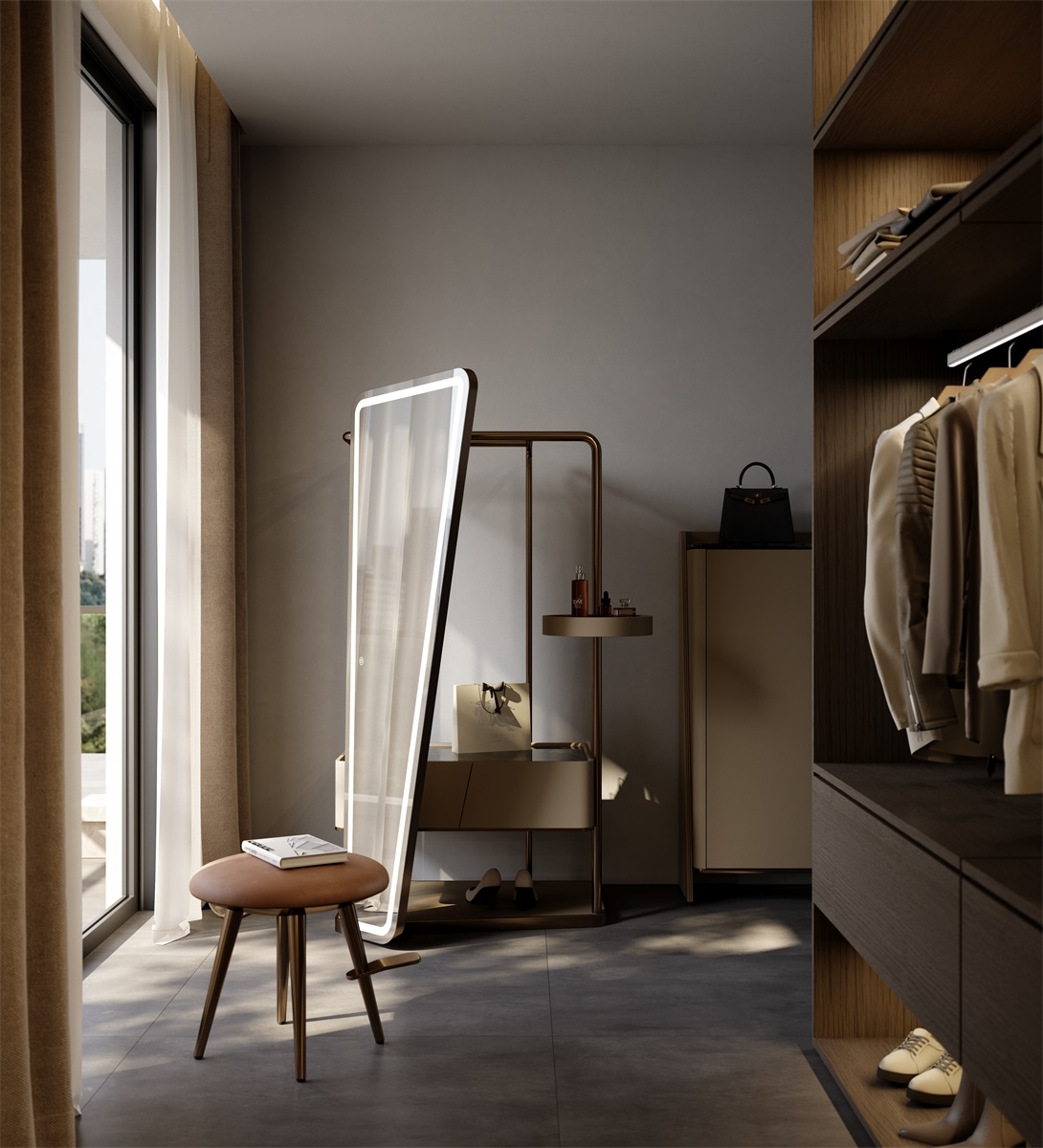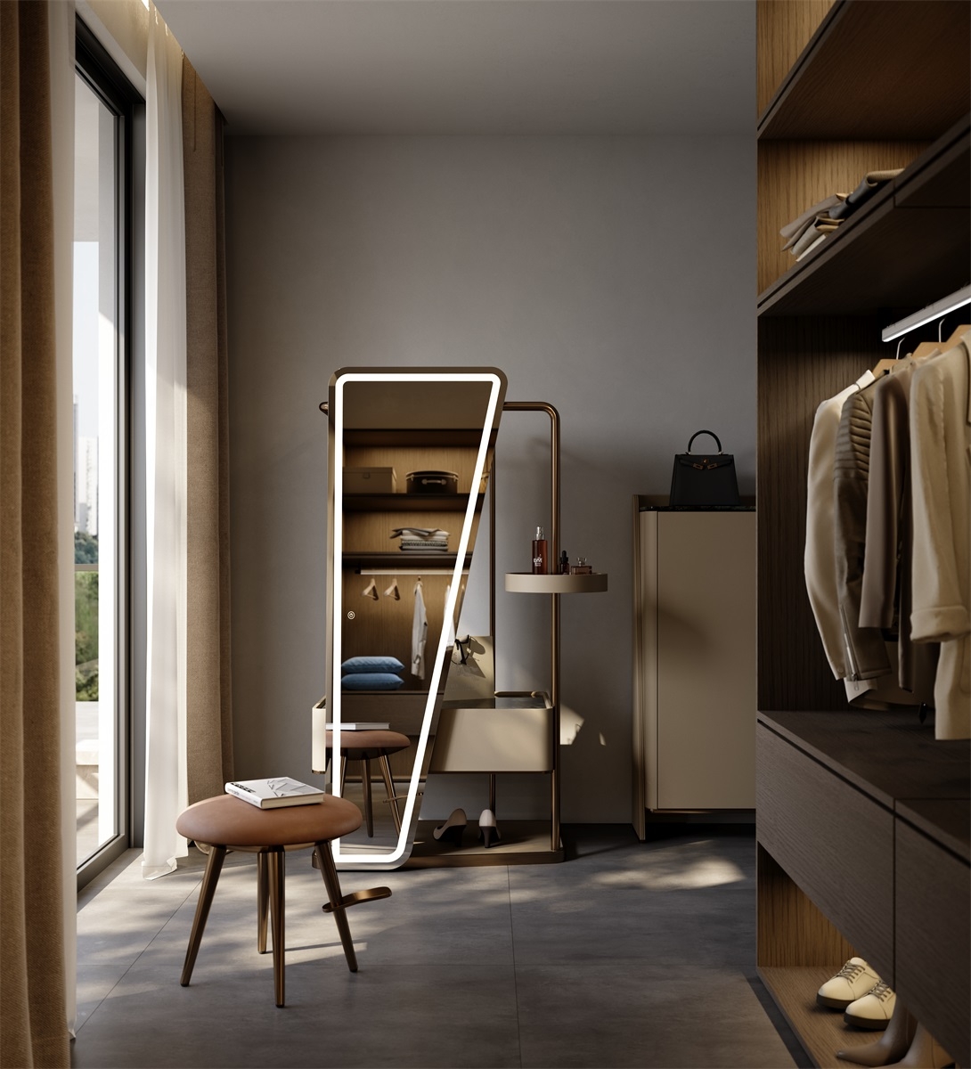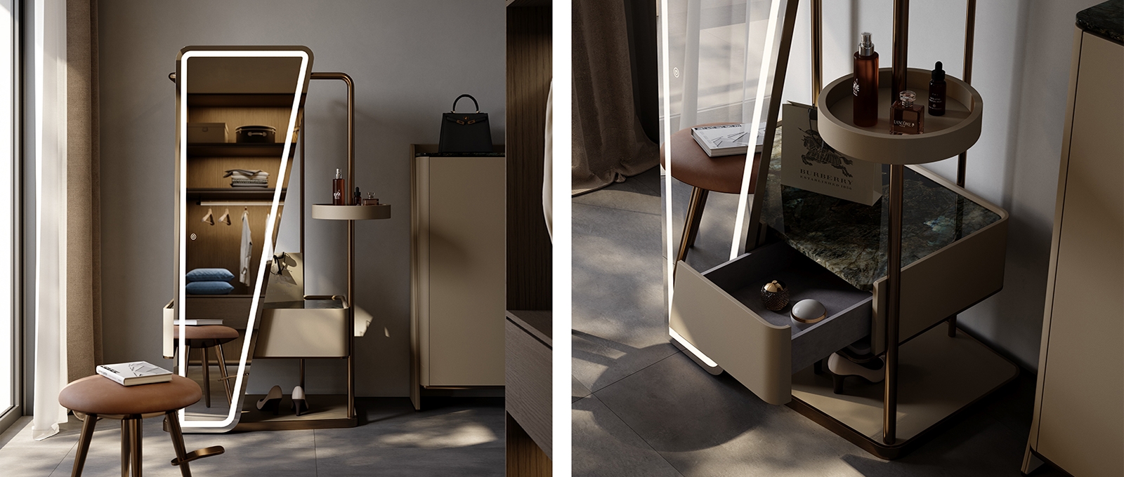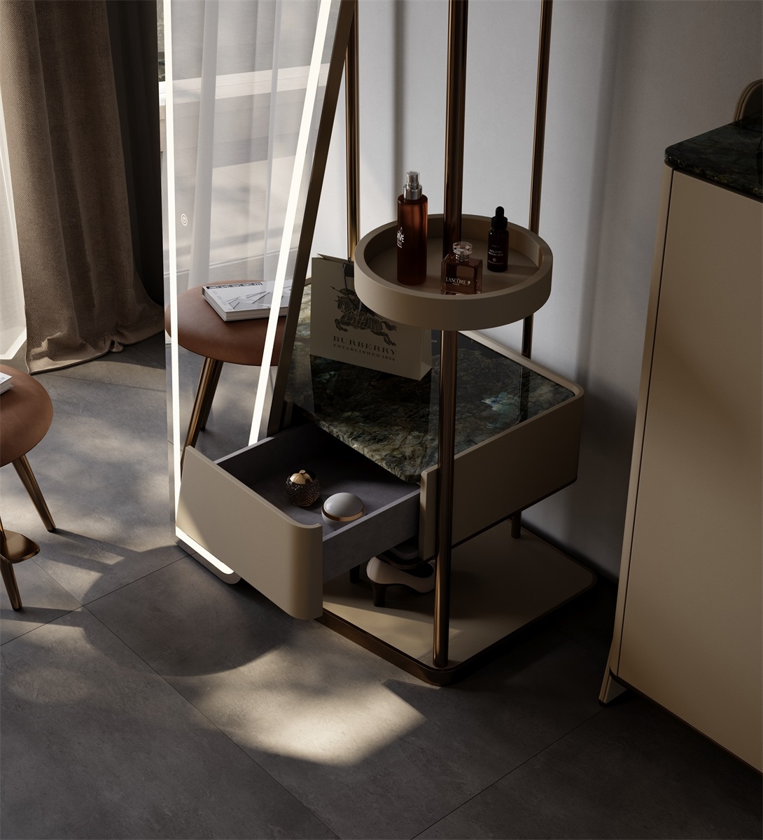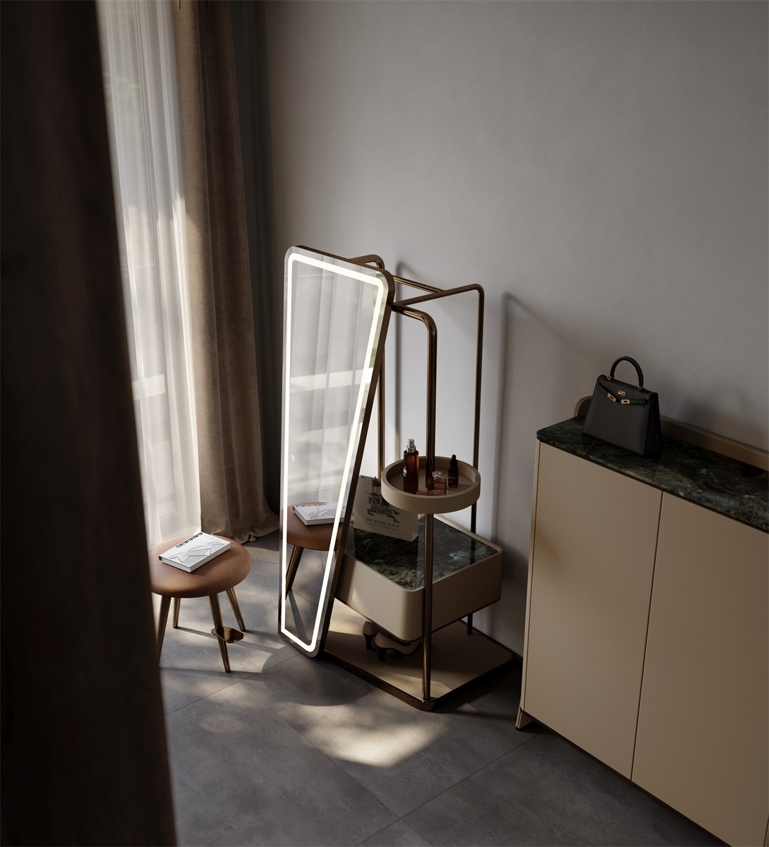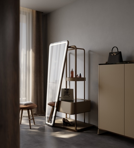 Unique Asymmetric Silhouette: Features a bold, tilted mirror design with a sleek LED - lit border. The mix of neutral tones (gray mirror, beige storage, bronze frame) creates a modern, luxury - driven look—ideal for elevating entryways, dressing rooms, or bedrooms.Brand Highlight: Showcases a “Burberry” shopping bag, hinting at high - end lifestyle integration. Perfect for fashion - forward spaces, blending functionality with aspirational branding.