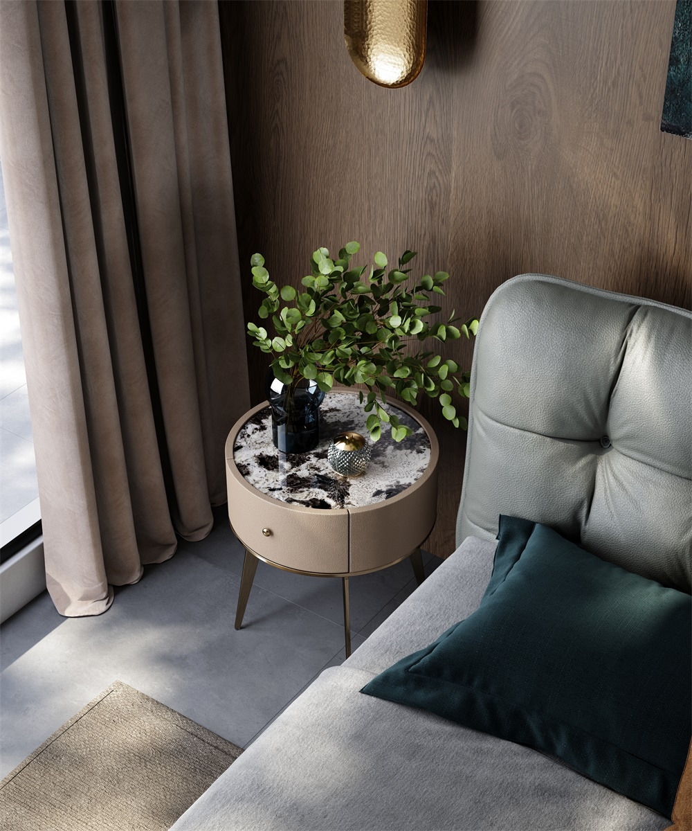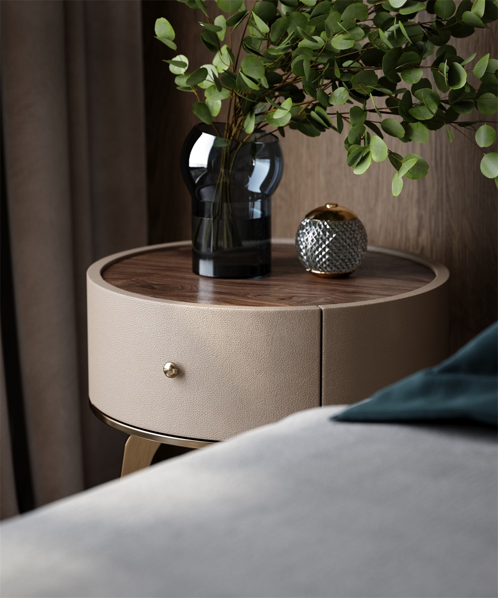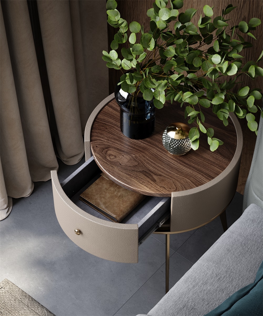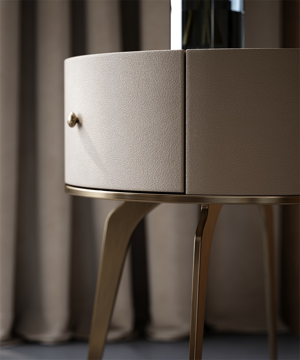 The top of the large coffee table is made of solid walnut wood, with natural texture like traces of time. It is hand-polished and painted with wood wax oil, making it warm and shiny. The cabinet body is covered with soft leather, and the light beige color is delicate and skin-friendly. It is soft to the touch and wear-resistant after an ecological tanning process. The frame of the small round table is matched with bronze metal.