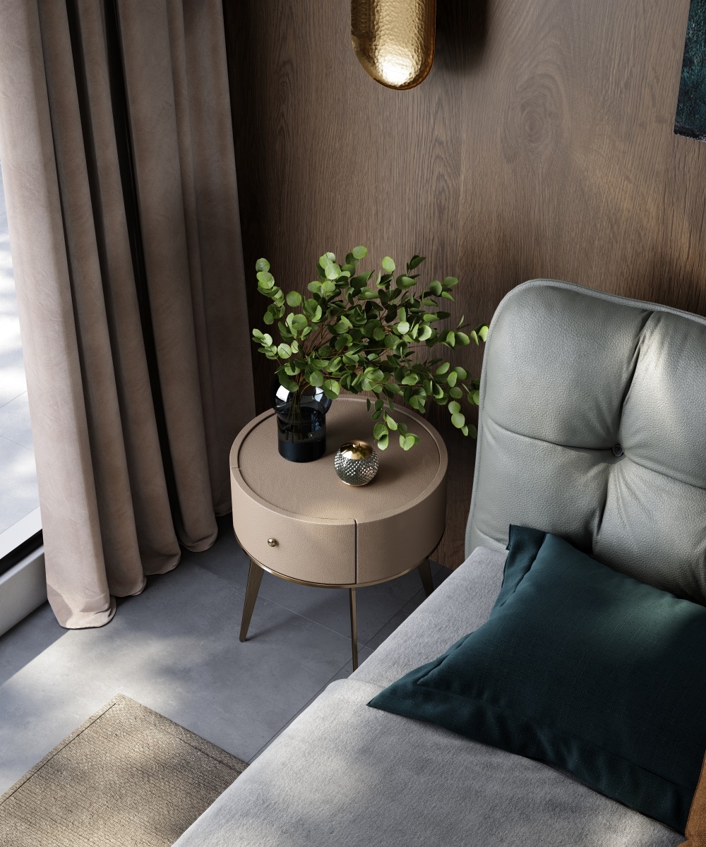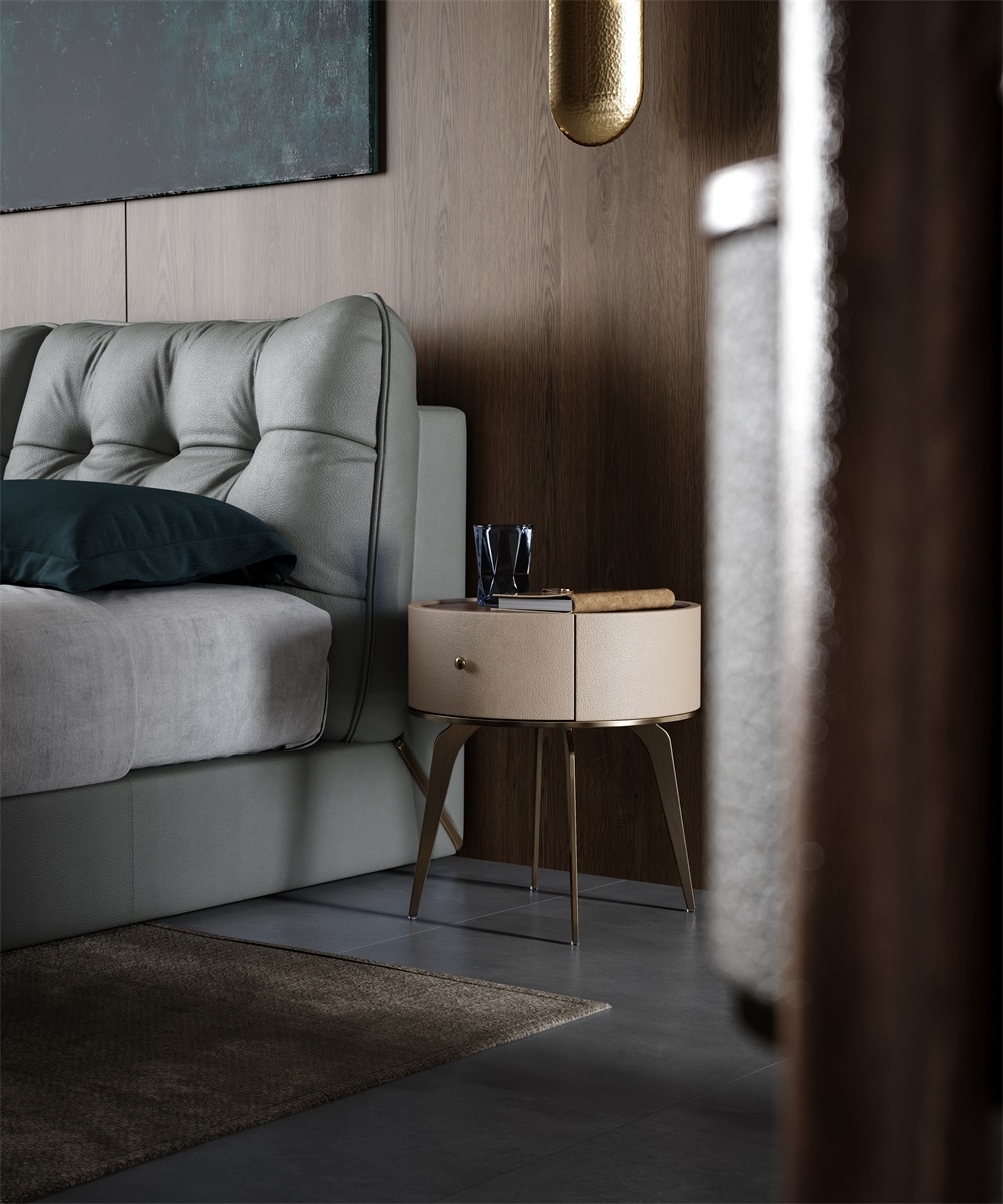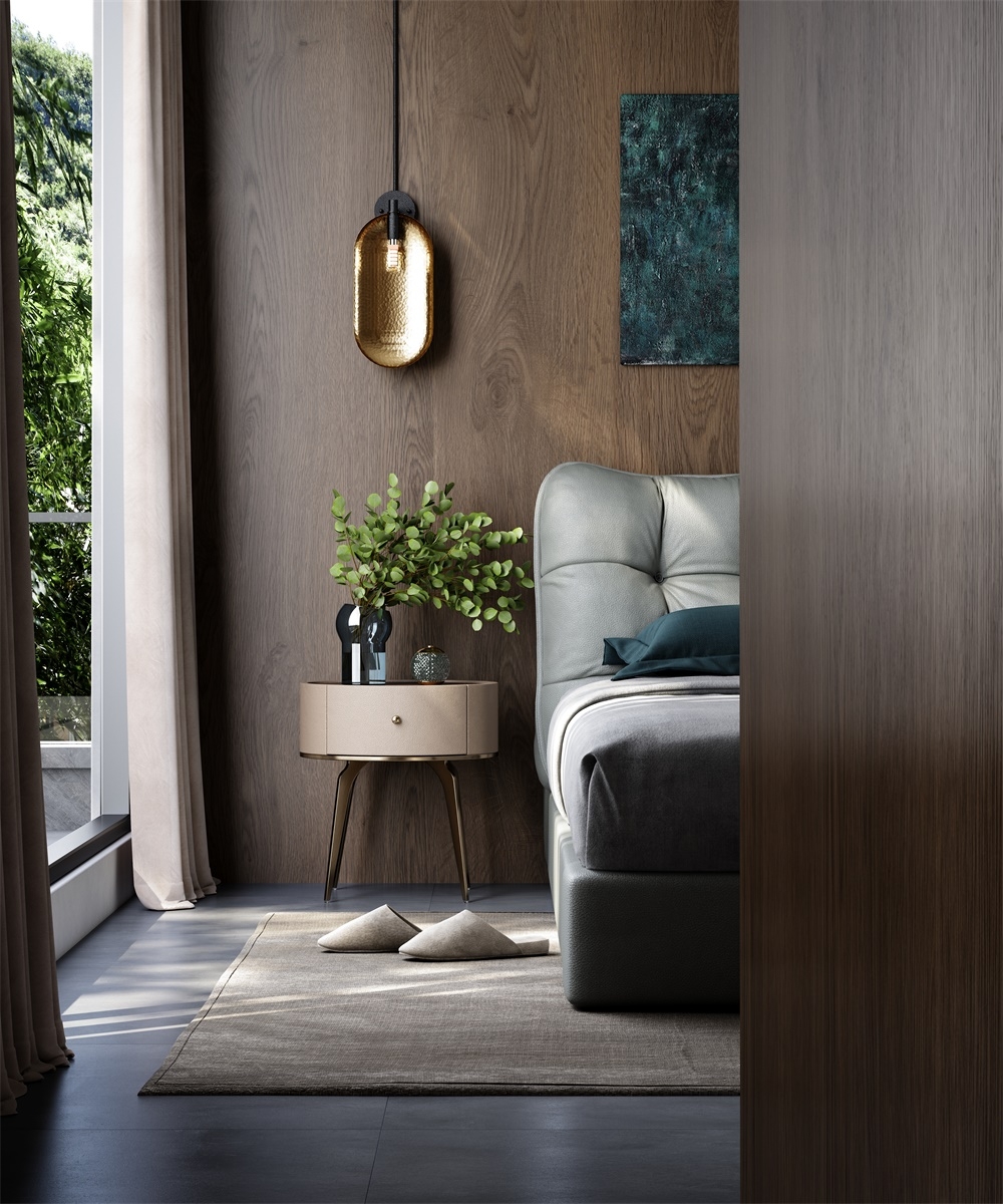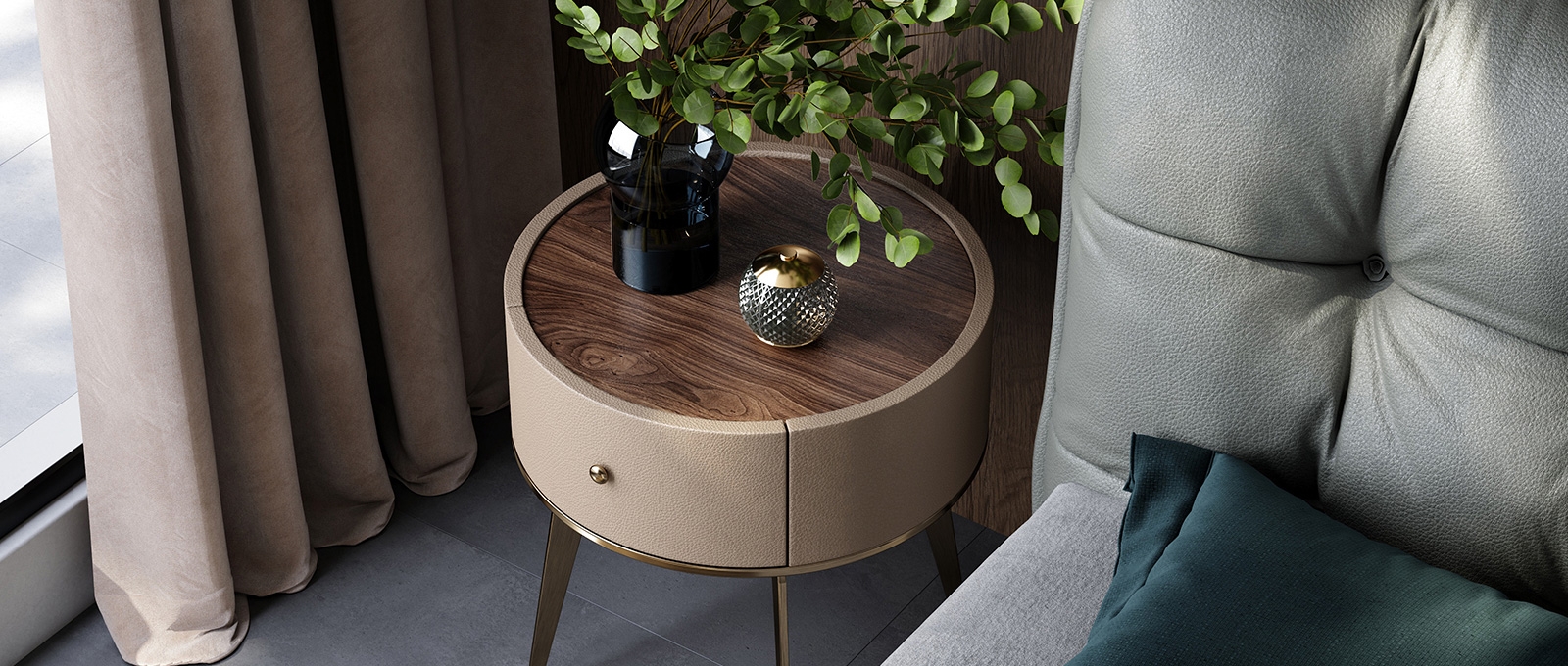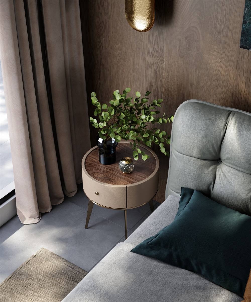 The top of the large coffee table is made of solid walnut wood, with natural texture like traces of time. It is hand-polished and painted with wood wax oil, making it warm and shiny. The cabinet body is covered with soft leather, and the light beige color is delicate and skin-friendly. It is soft to the touch and wear-resistant after an ecological tanning process. The frame of the small round table is matched with bronze metal.