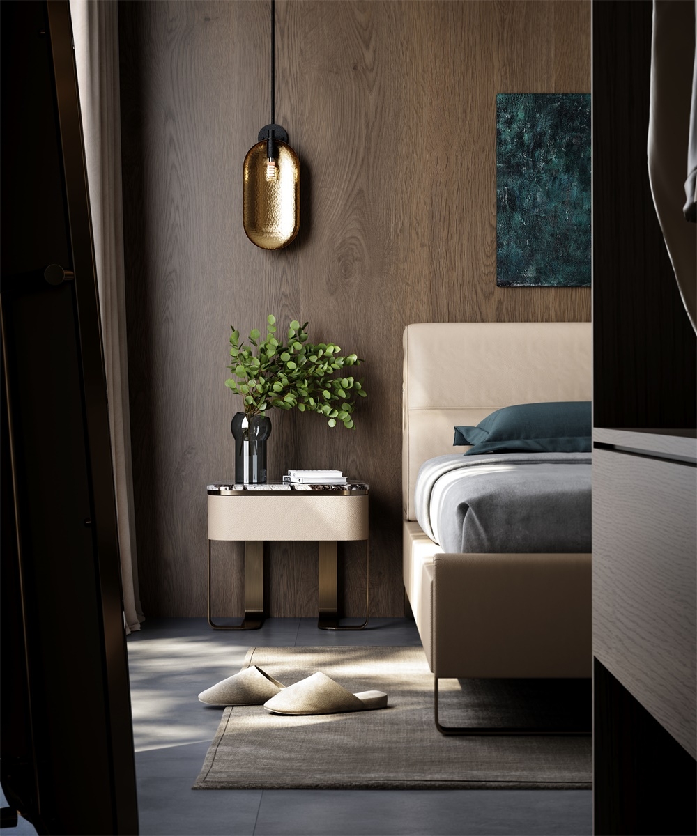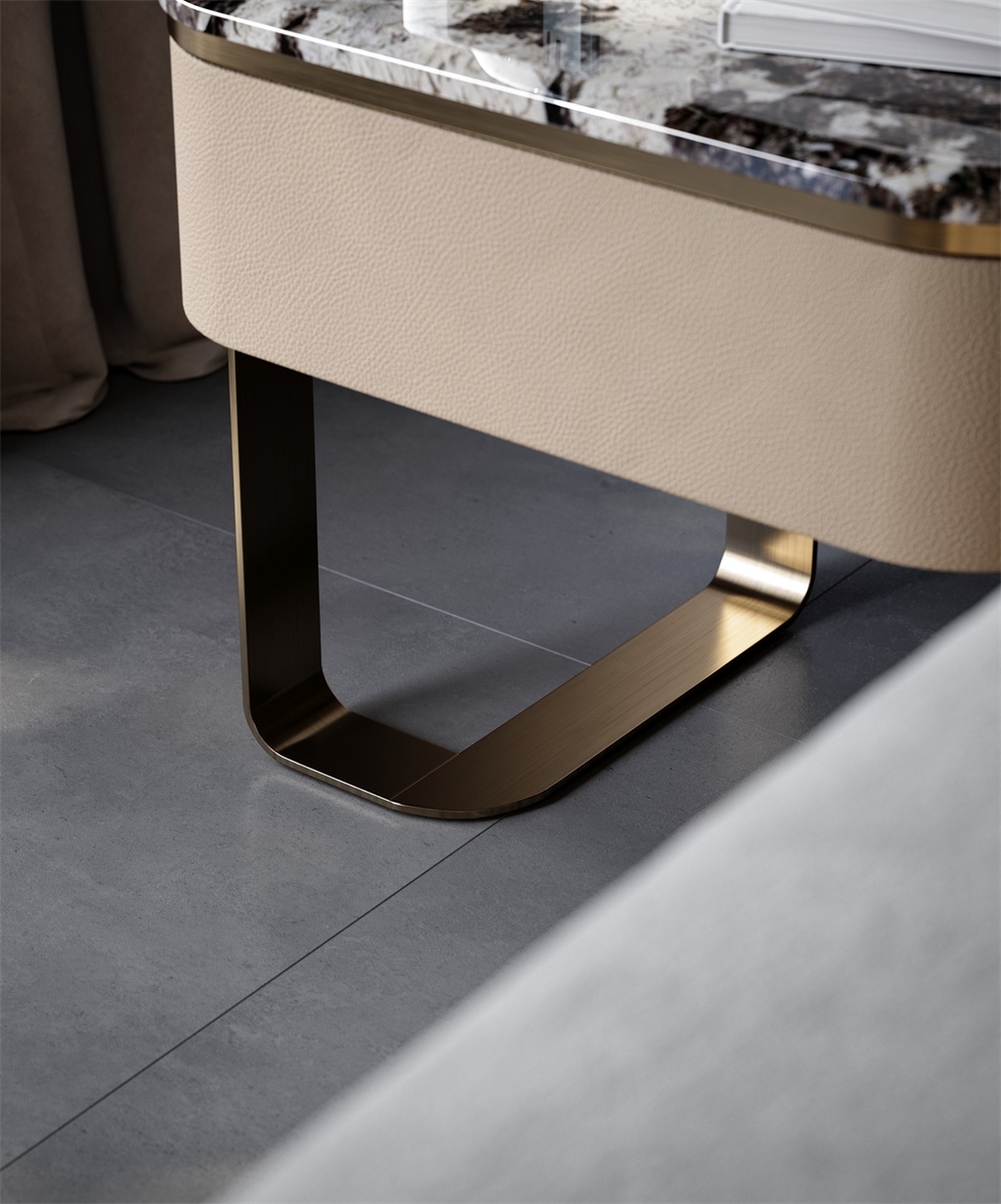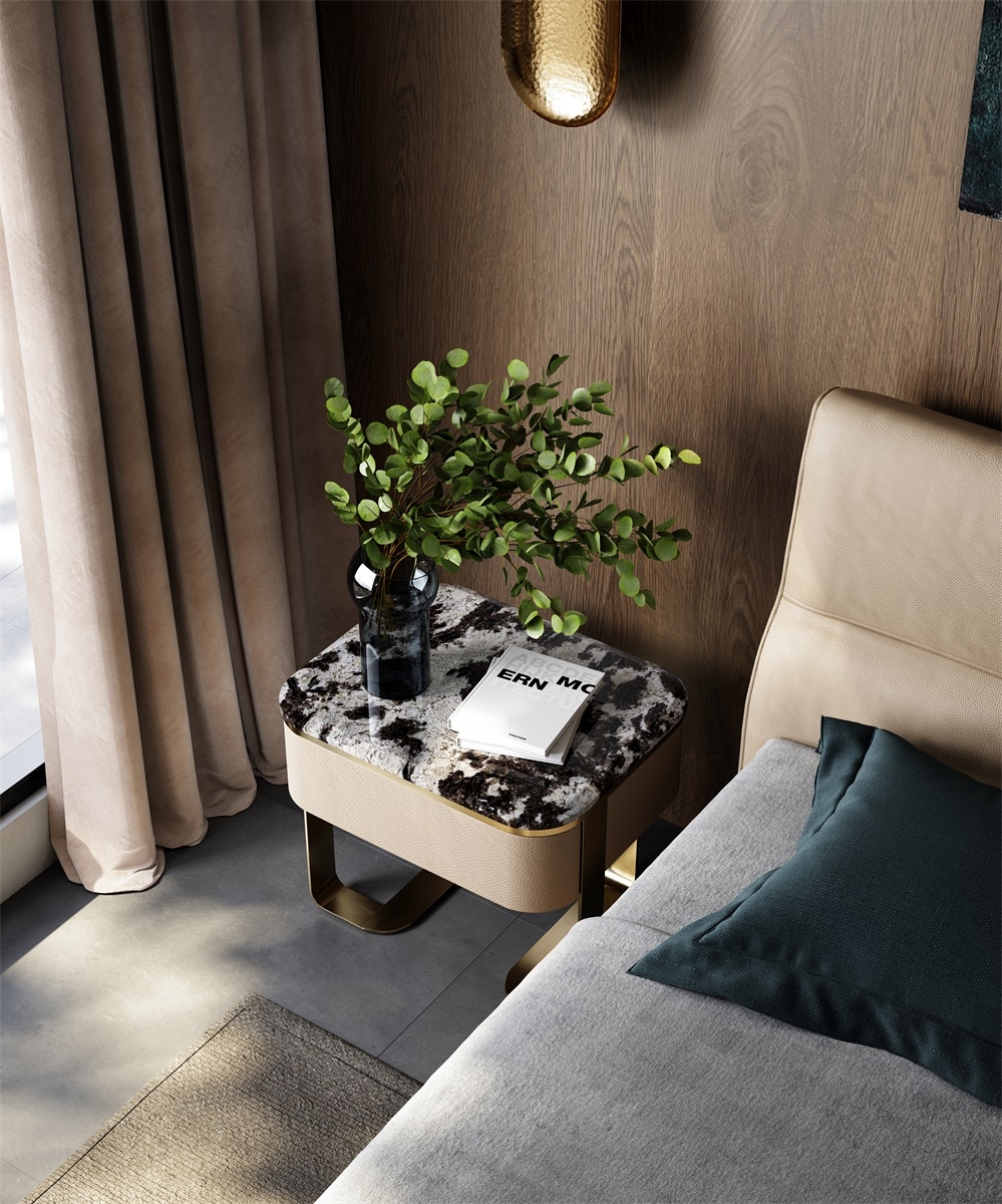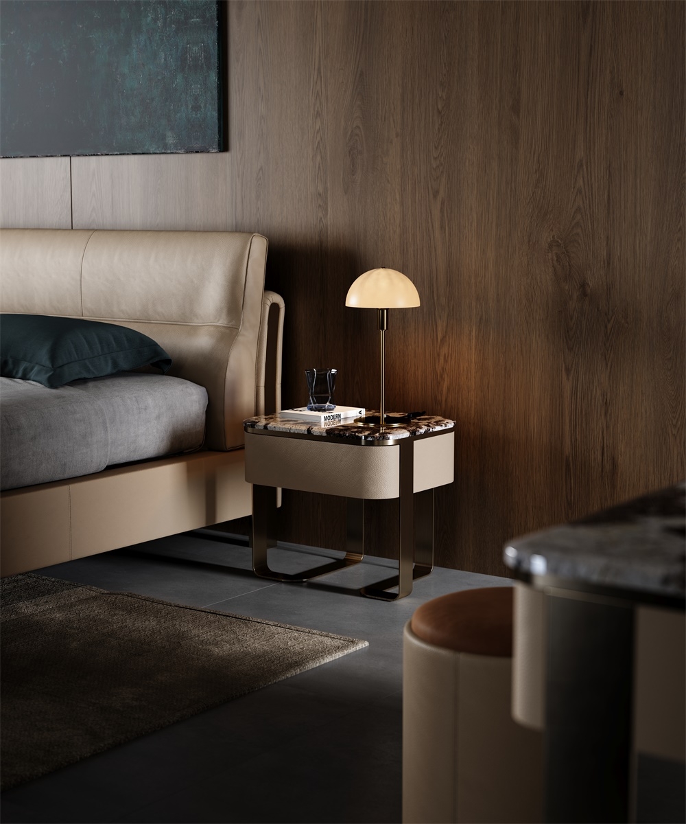 The geometric design of rectangular frame + curved table top breaks the stereotyped lines and adapts to various home styles; the open table top can meet the needs of temporary storage, such as water cups, books, and aromatherapy. The combination of "leather soft cover + metal bracket" not only ensures stability, but also creates a sense of lightness visually, making the side table move from "monotonous storage" to "aesthetic display"