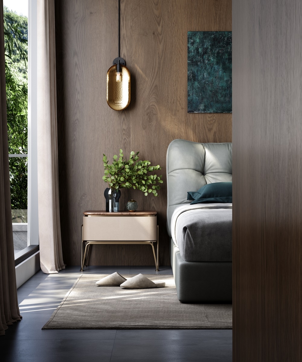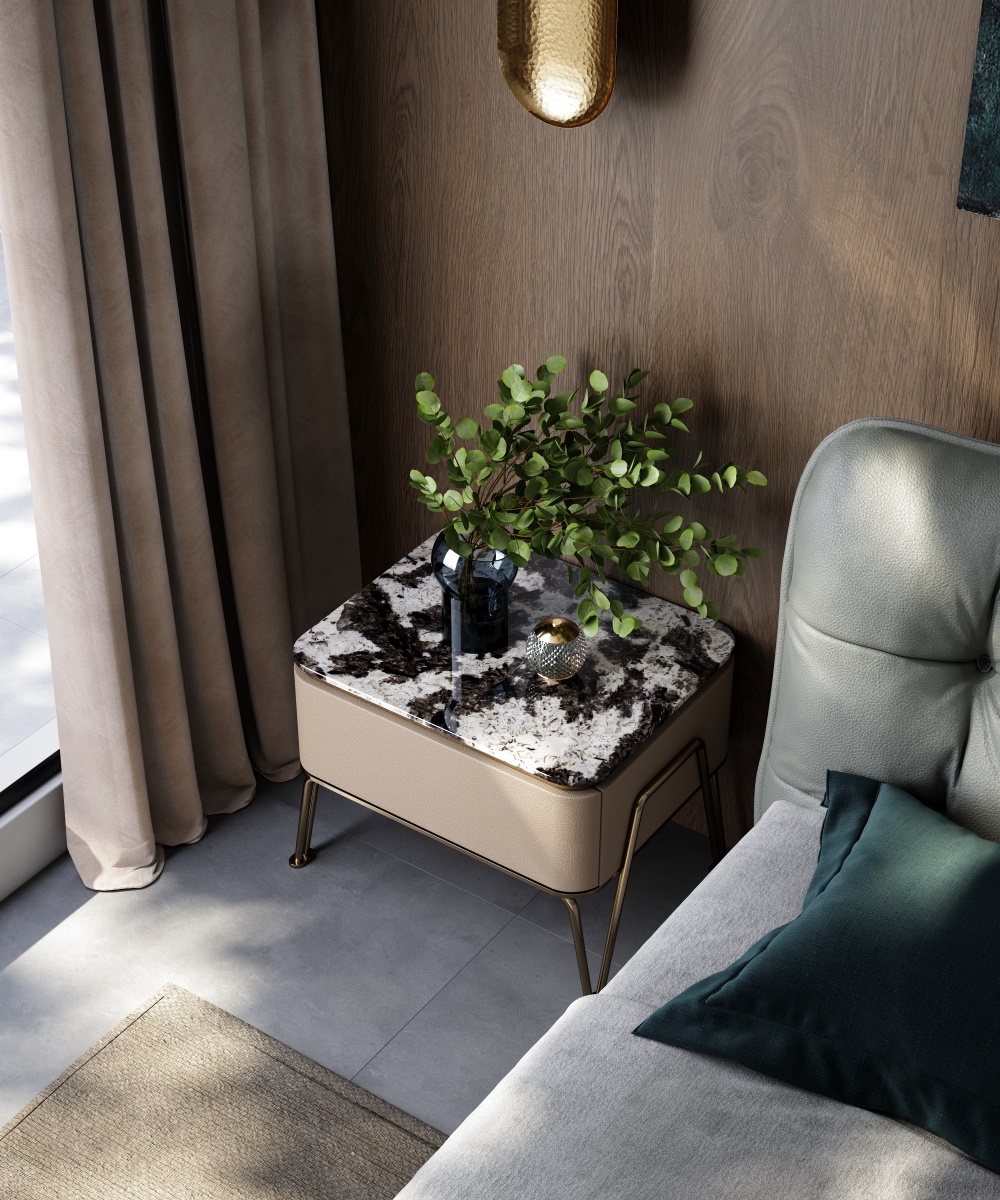 The geometric lines are highly artistic, and the thin metal base is delicately placed on one side, presenting a beautiful combination of reality and virtuality. The square and rounded shape adds a touch of elegance to the entire bedroom.