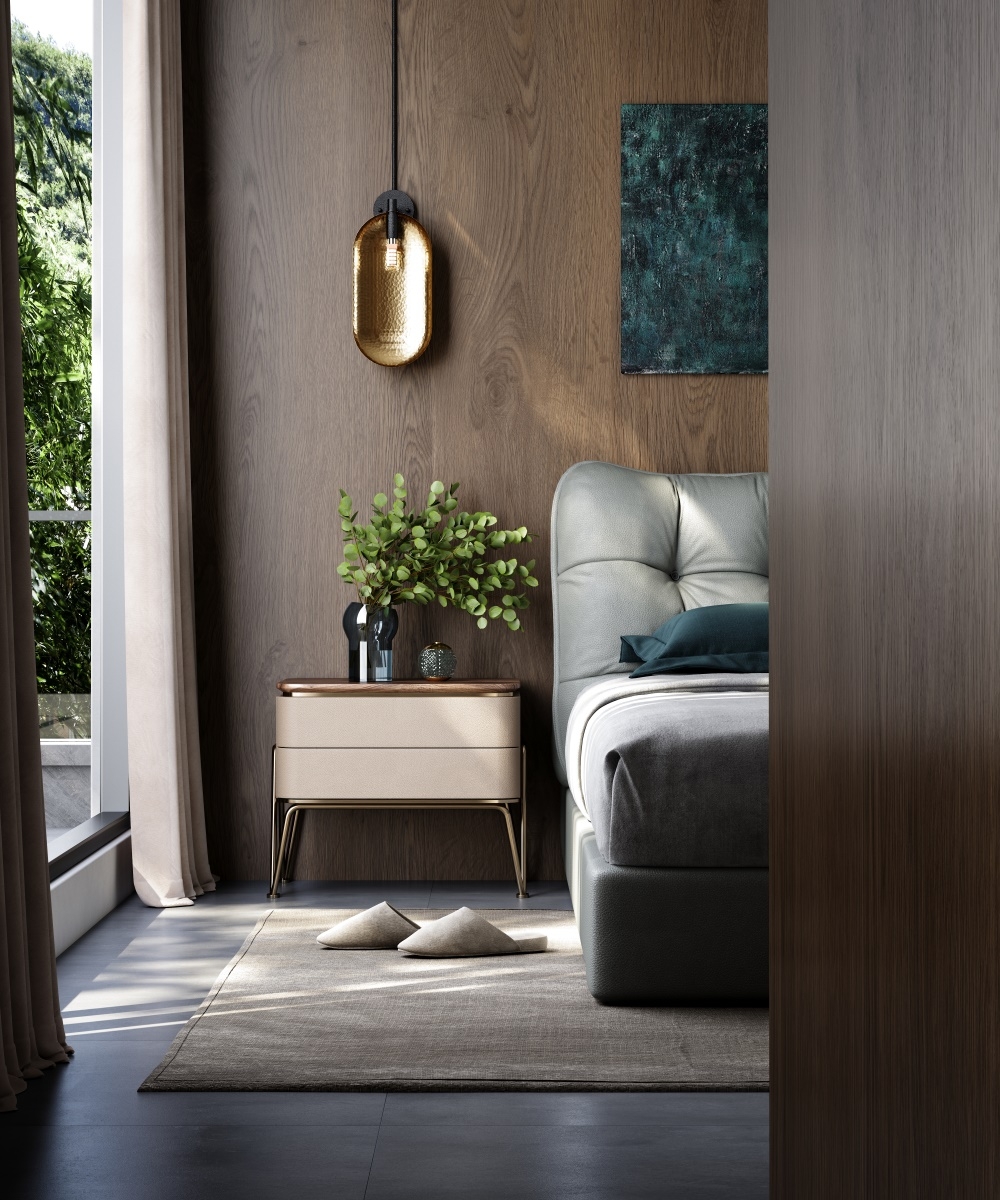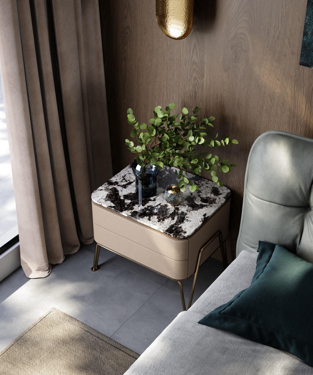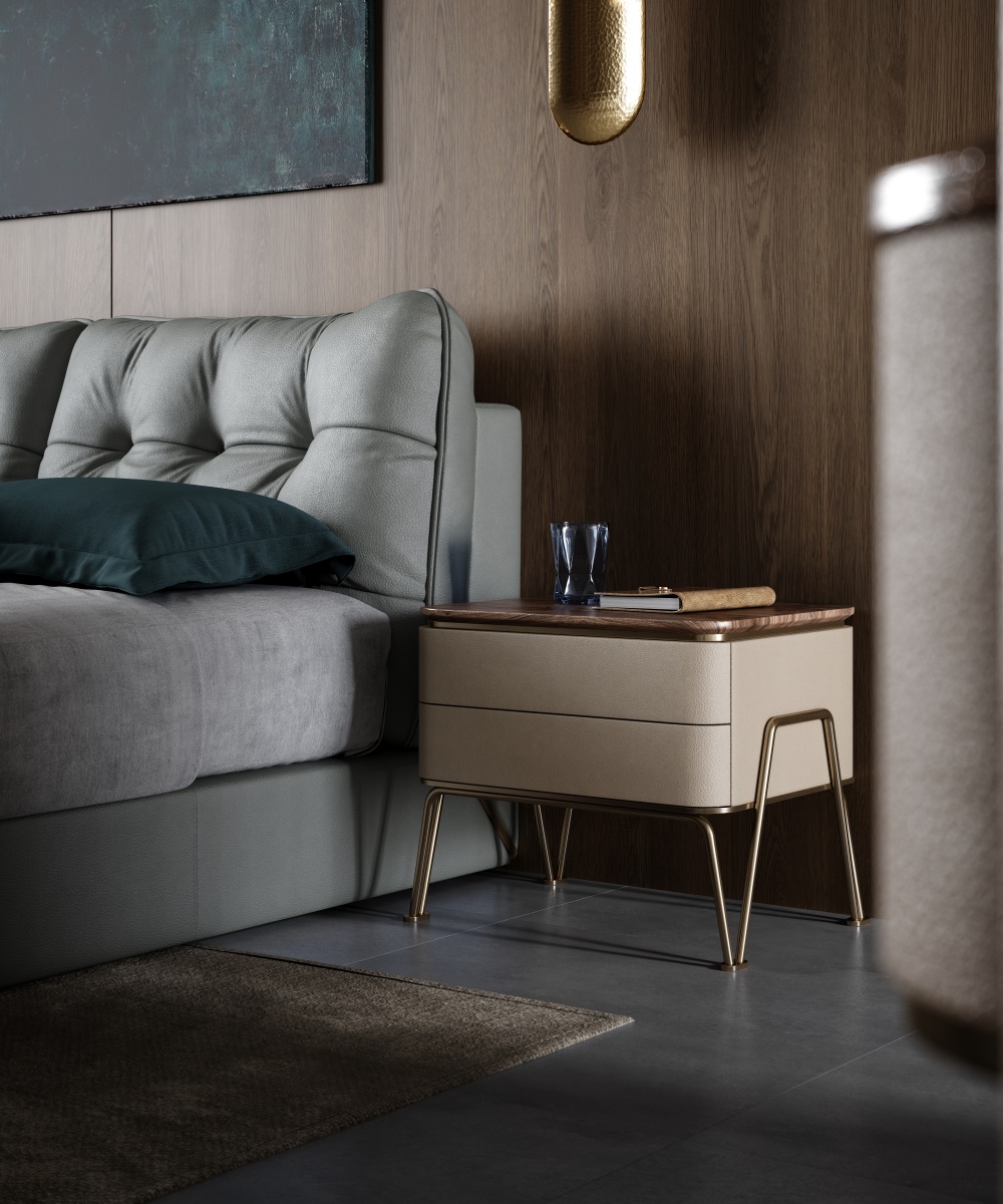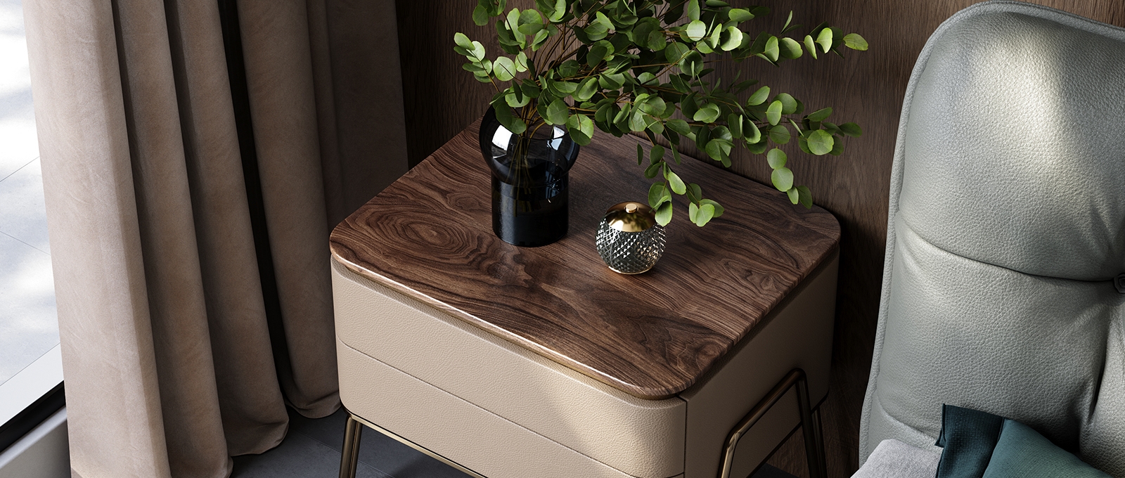The cabinet body is upholstered in genuine leather. The light beige leather is delicate and skin-friendly. After the ecological tanning process, it feels warm and is wear-resistant and stain-resistant. The frame and countertop are made of metal + solid wood. The exquisite luster of the metal complements the natural texture of the solid wood. The combination of the three weaves a gentle texture base for the bedroom, injecting a warm atmosphere into the sleeping space.