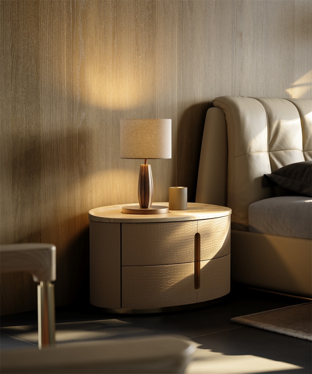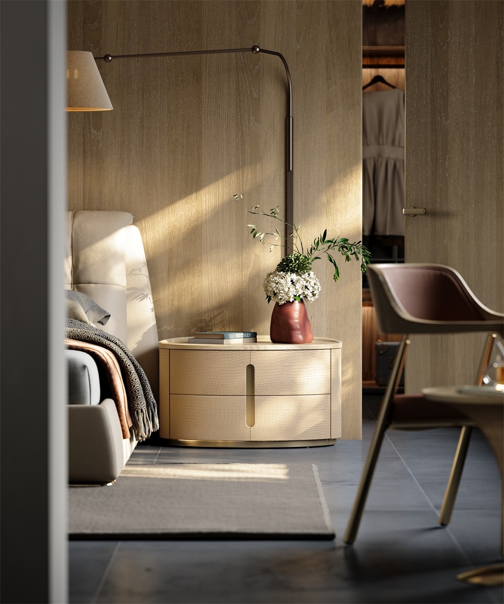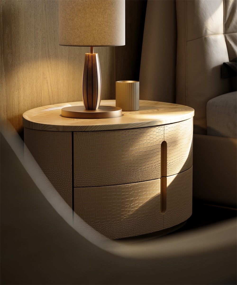 The cabinet body is covered with imitation crocodile leather with lifelike three-dimensional light gold texture. It is embossed and ecologically tanned, with a delicate touch and wear resistance. The frame is inlaid with bronze metal, which is electroplated and polished to present a warm luster. The table top is made of solid wood, which is hand-polished and waxed to exude a natural wood fragrance.