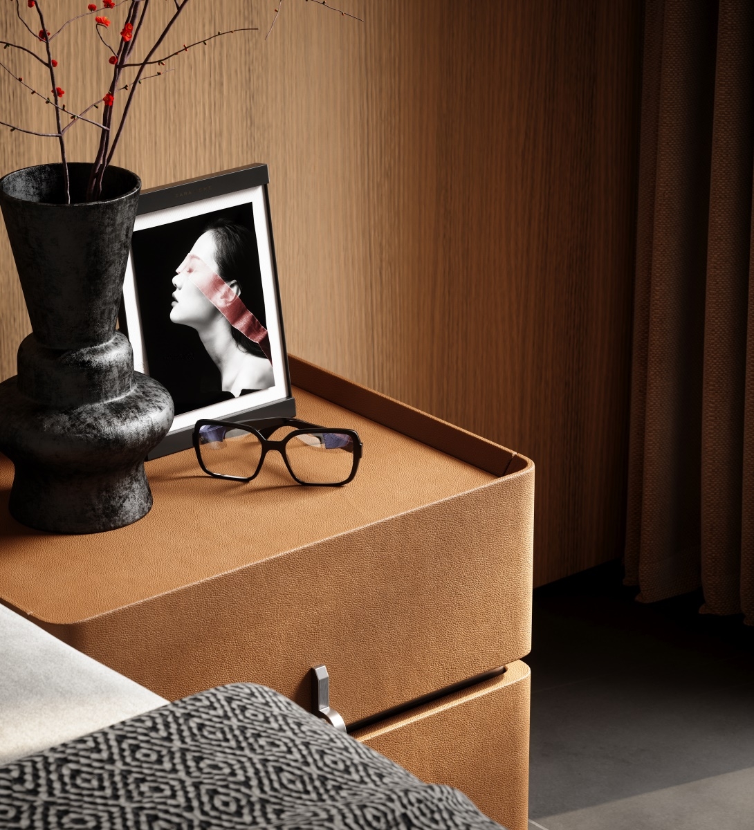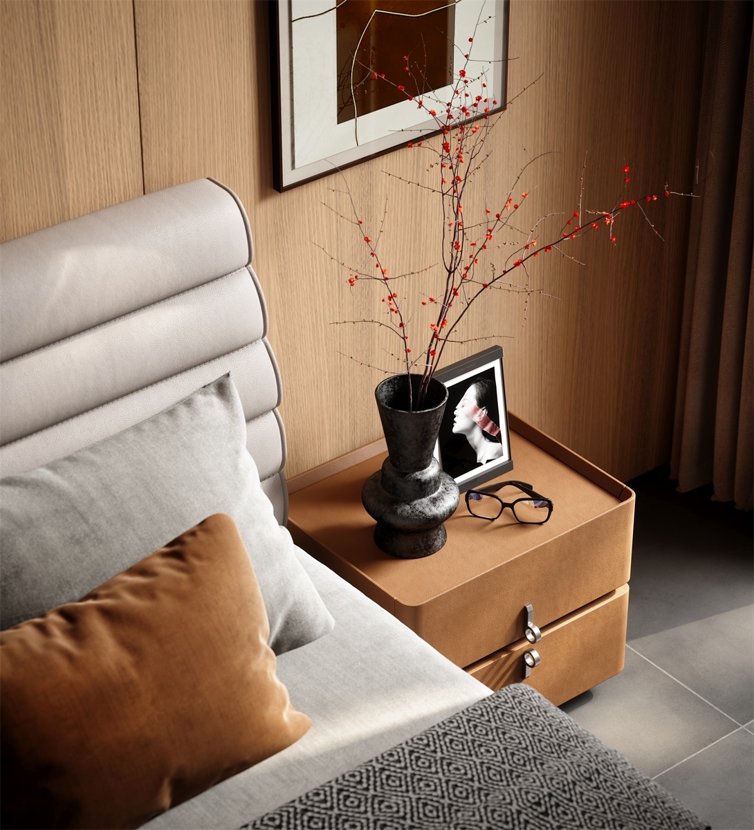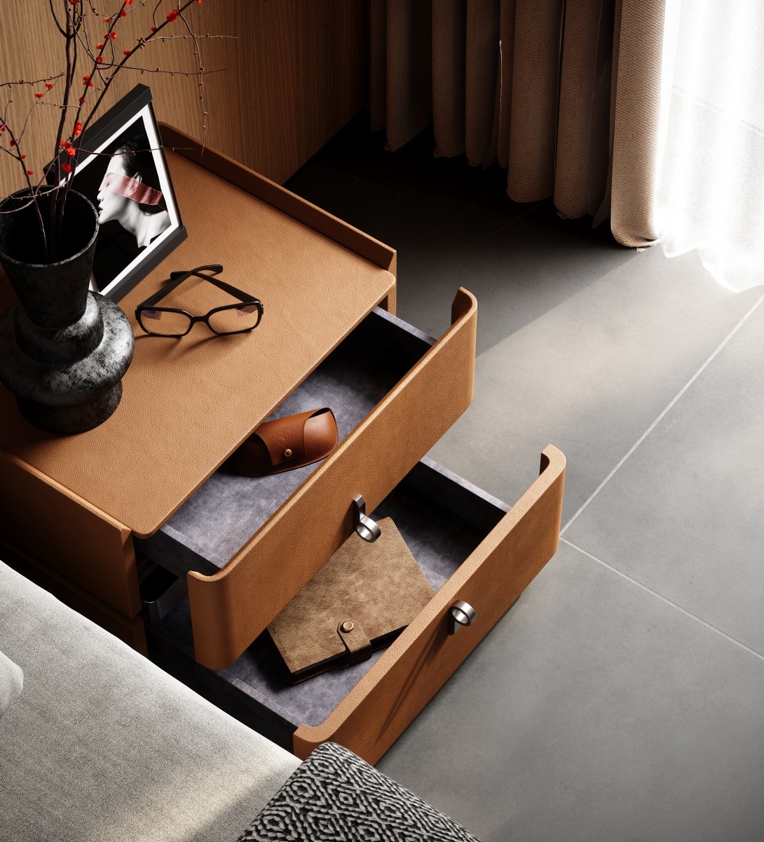 In a space that focuses on the exquisite atmosphere of the bedroom and the storage needs before going to bed, this bedside table combines genuine leather and metal materials, with double-layer drawers + open storage design, becoming a "sleep butler" by the bed, turning every time you tidy up before going to bed into a healing experience blended with quality life.