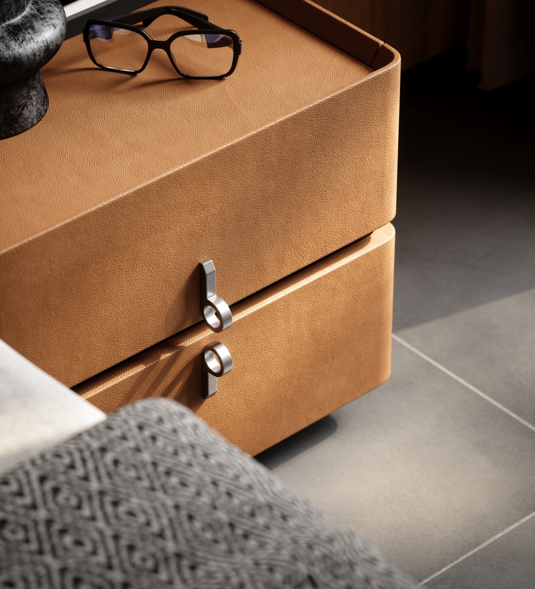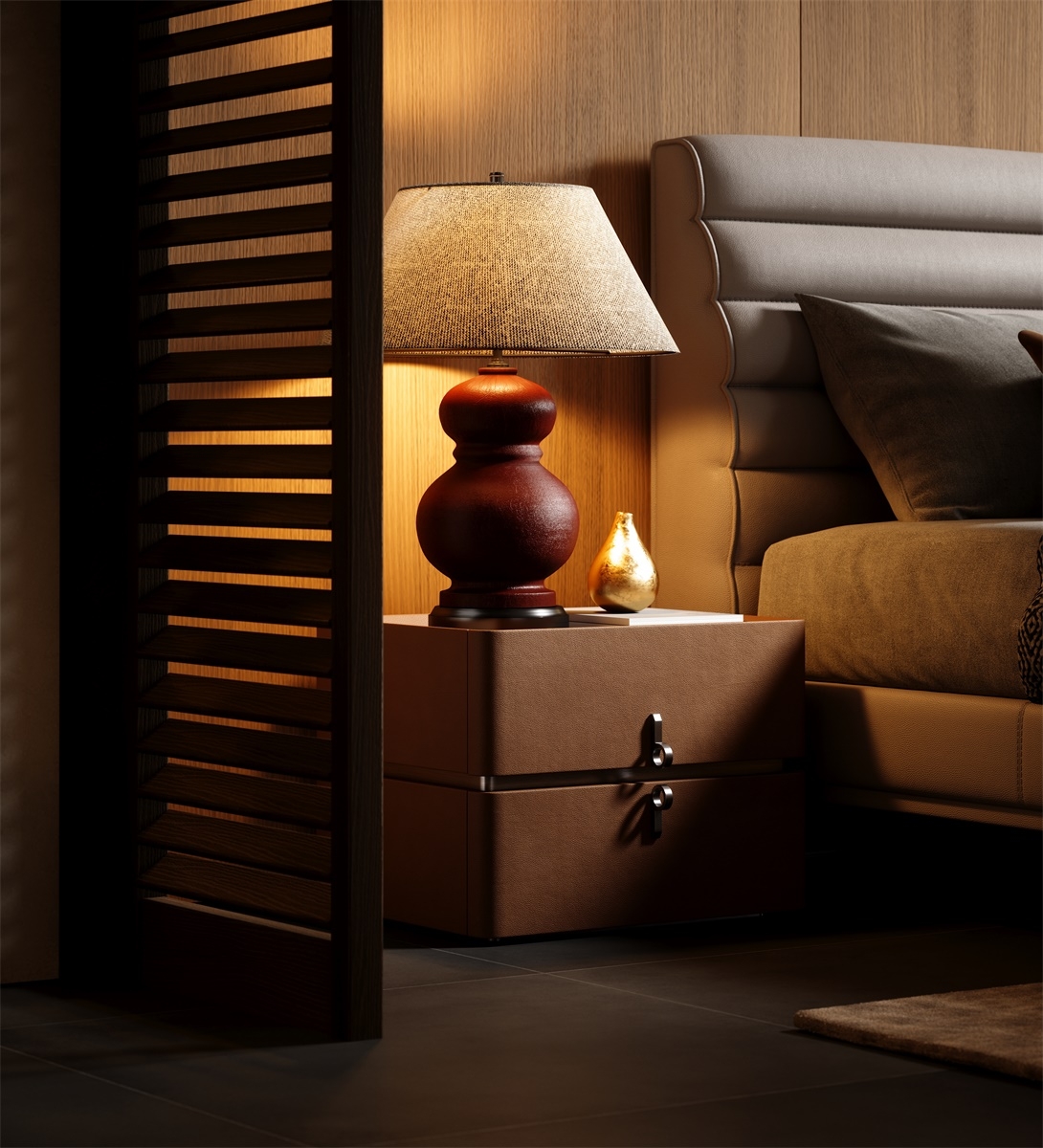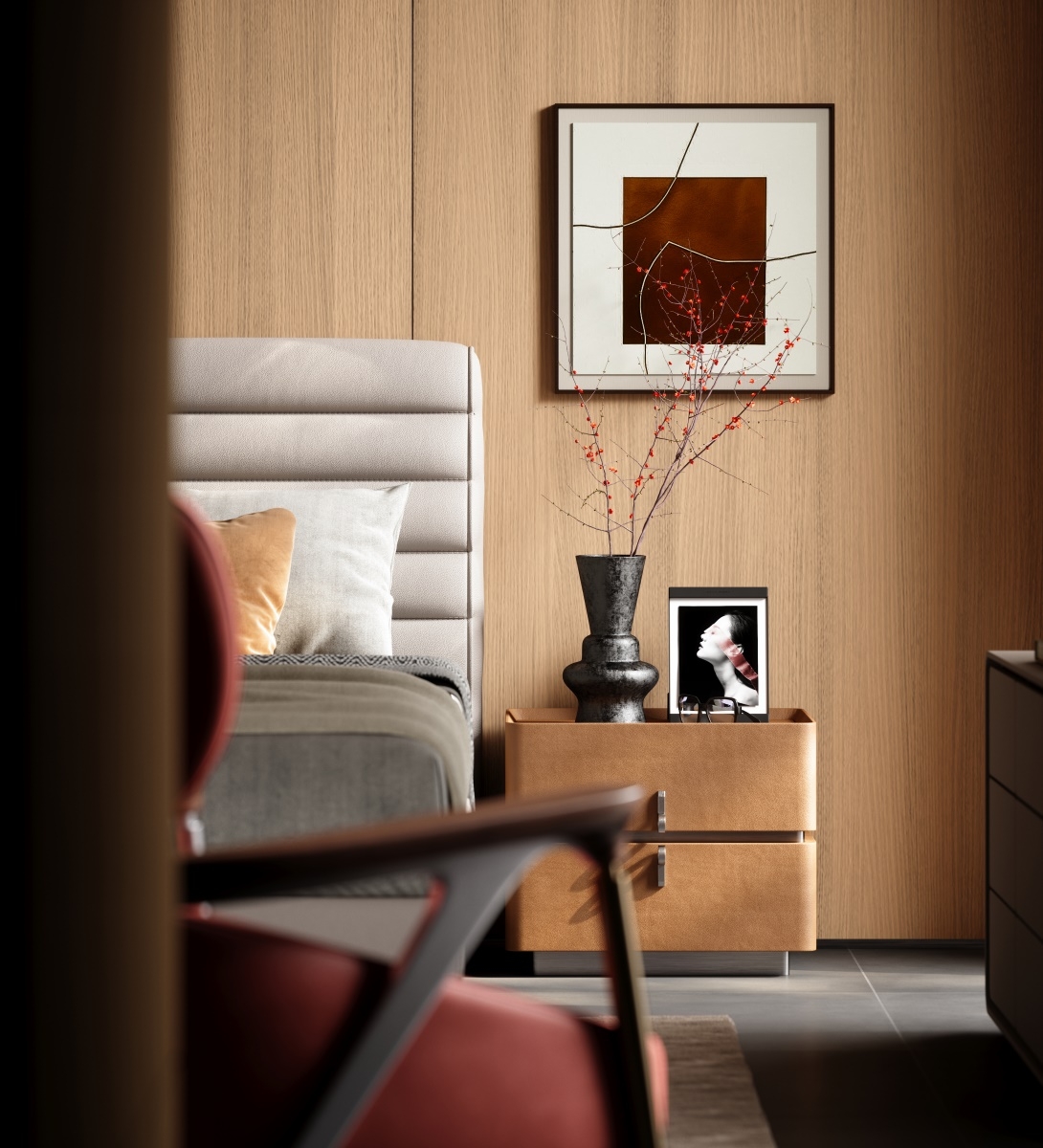 In a space that focuses on the exquisite atmosphere of the bedroom and the storage needs before going to bed, this bedside table combines genuine leather and metal materials, with double-layer drawers + open storage design, becoming a "sleep butler" by the bed, turning every time you tidy up before going to bed into a healing experience blended with quality life.