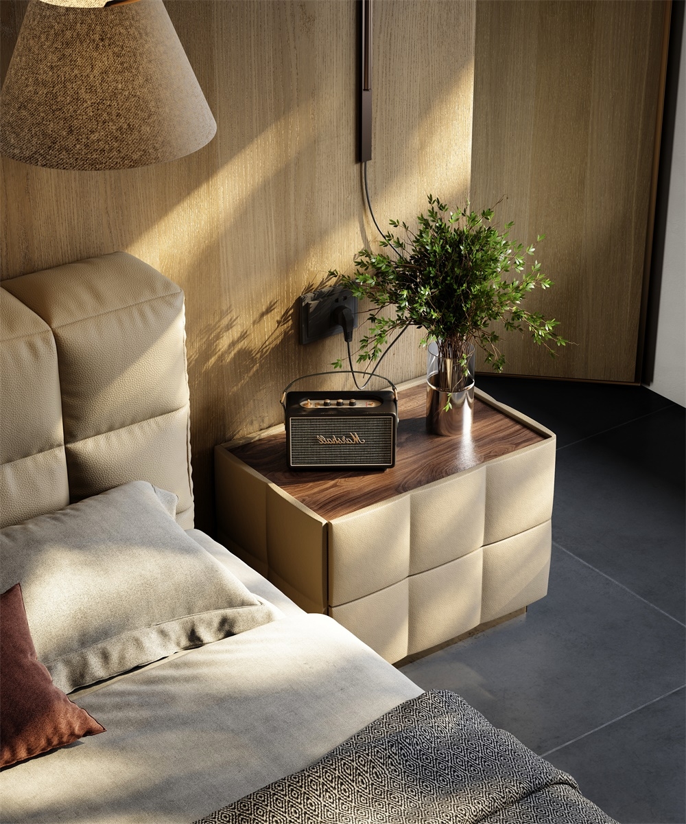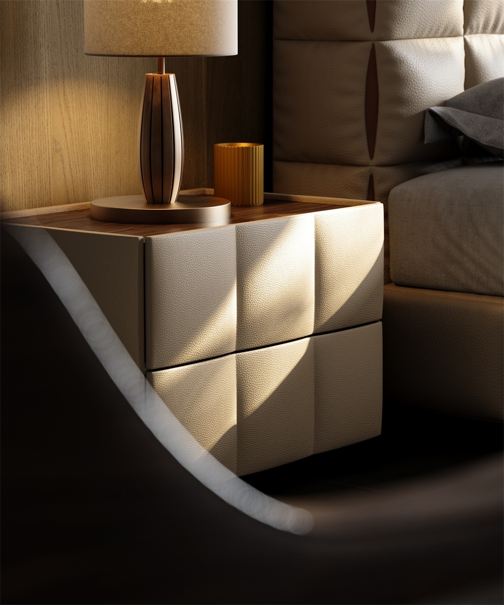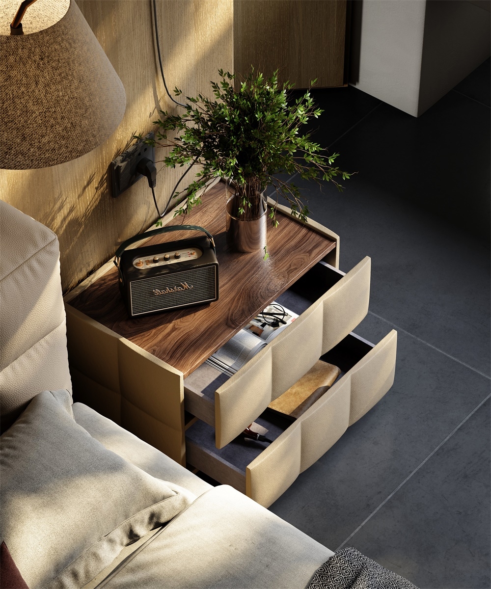 The double drawer diamond-shaped soft-padded shape breaks the stereotyped lines and adapts to various bedroom styles; the handleless design divides the storage area with leather texture and metal base, which not only ensures the storage capacity but also maintains the simple appearance; the "genuine leather soft-padded + solid wood base" combination creates a light visual effect and enhances stability, allowing the bedside area to say goodbye to clutter and return to a neat and healing resting area.