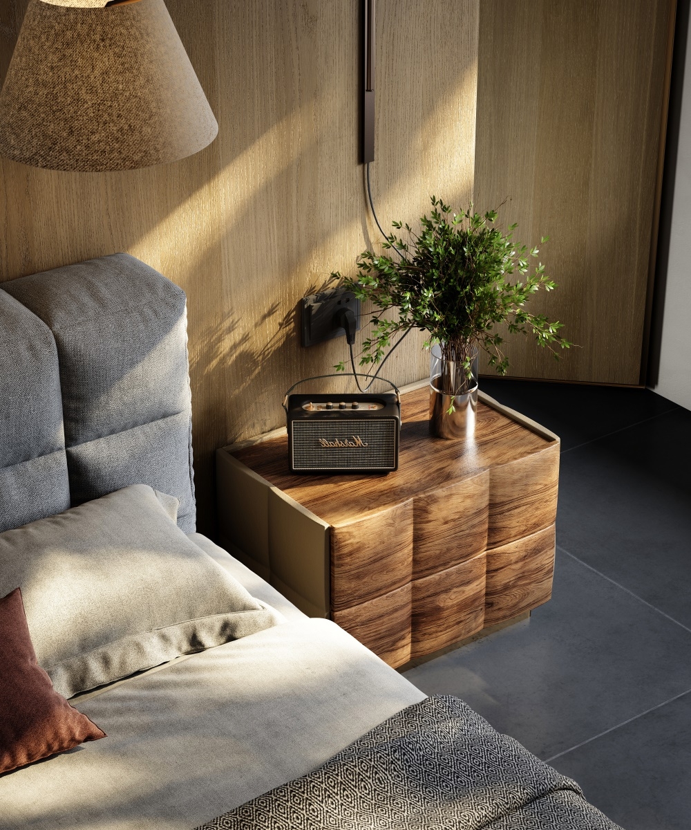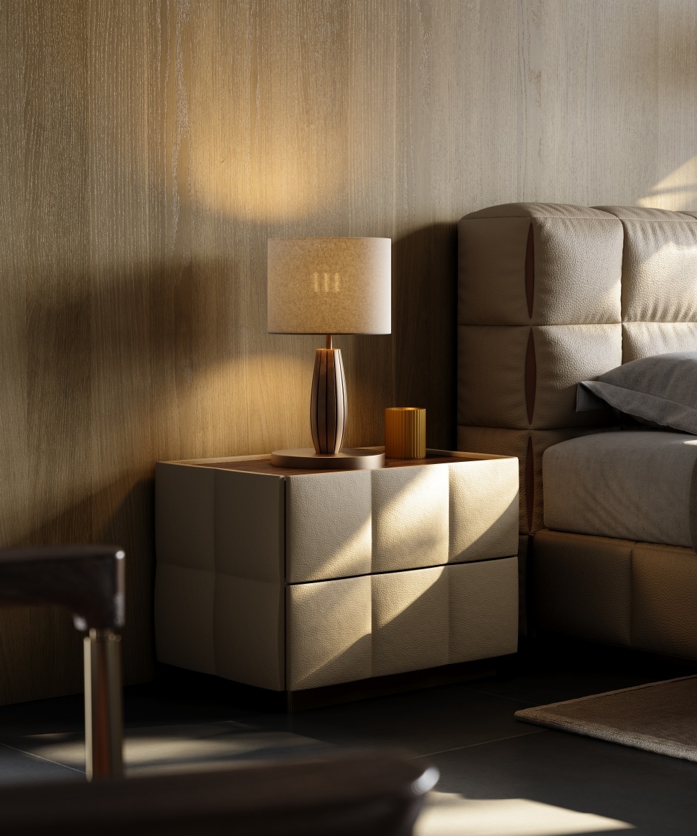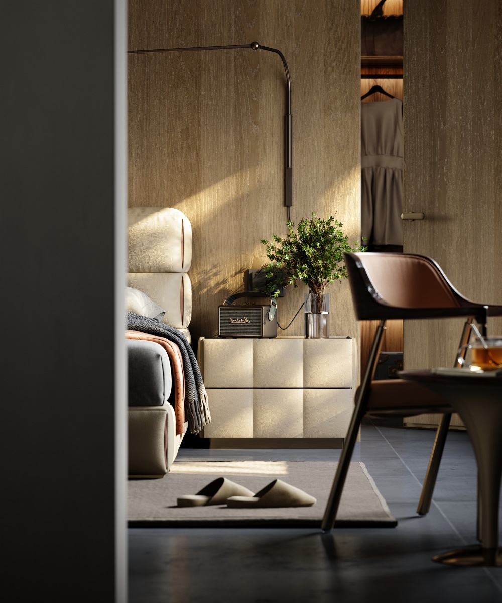 The double drawer diamond-shaped soft-padded shape breaks the stereotyped lines and adapts to various bedroom styles; the handleless design divides the storage area with leather texture and metal base, which not only ensures the storage capacity but also maintains the simple appearance; the "genuine leather soft-padded + solid wood base" combination creates a light visual effect and enhances stability, allowing the bedside area to say goodbye to clutter and return to a neat and healing resting area.