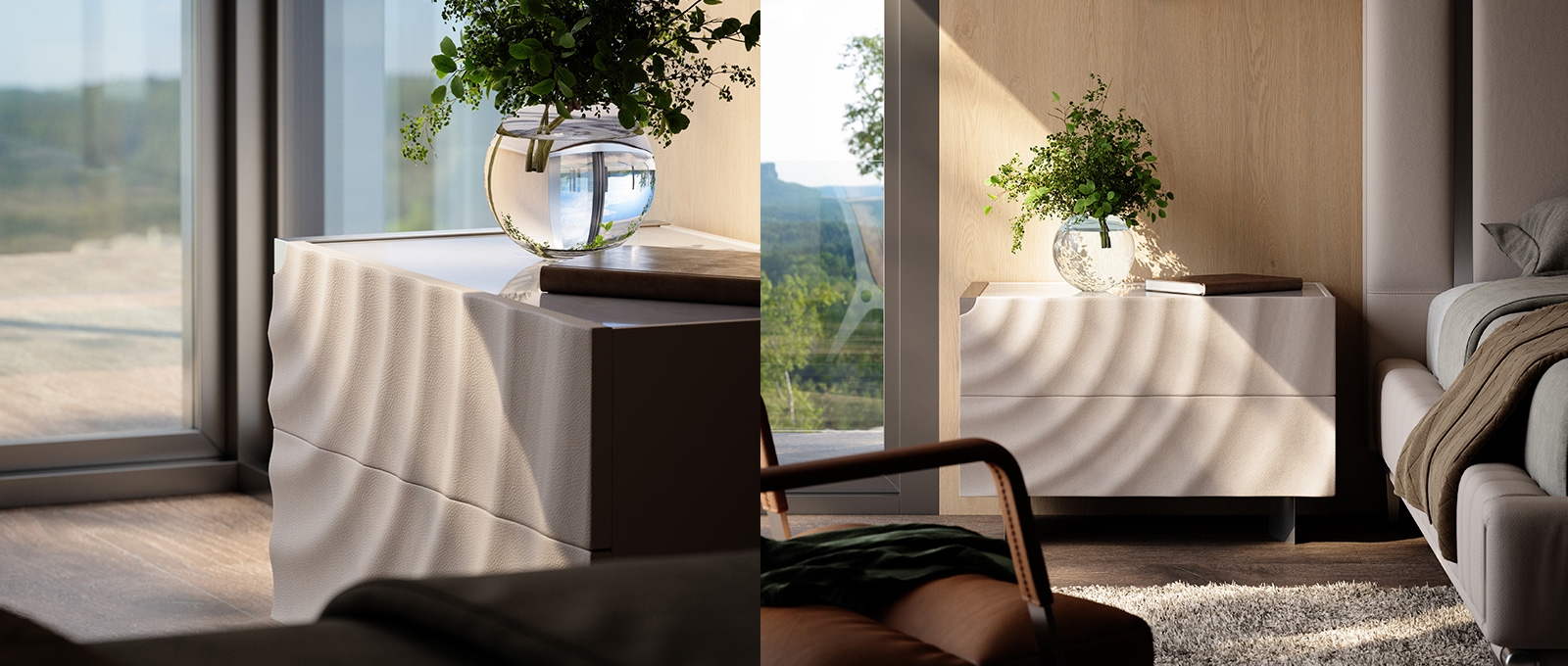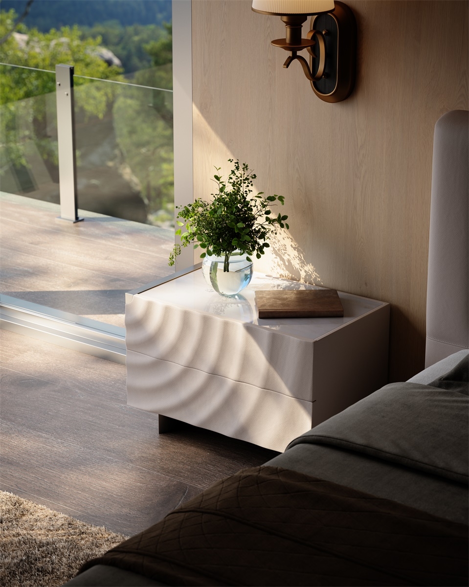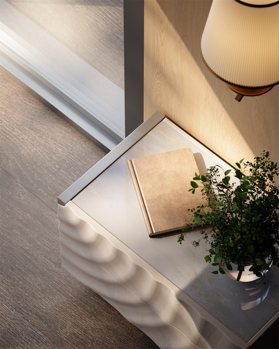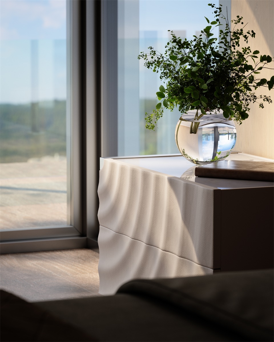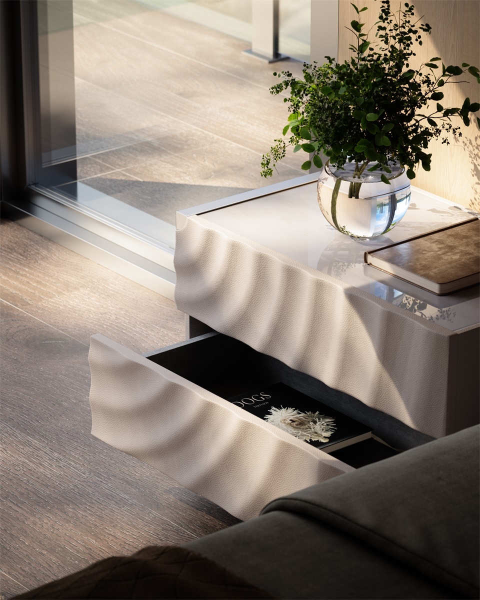 It is not like the ripples on the new pond. The breeze blows over the water, creating a natural and dynamic beauty with small ripples, and savoring the peaceful time of rhythm and tranquility Its cabinet, cloaked in beige leather with a mesmerizing wave - like texture, marries tactile luxury with artistic design. The sleek black metal legs provide a striking contrast, grounding the piece in modern sophistication.