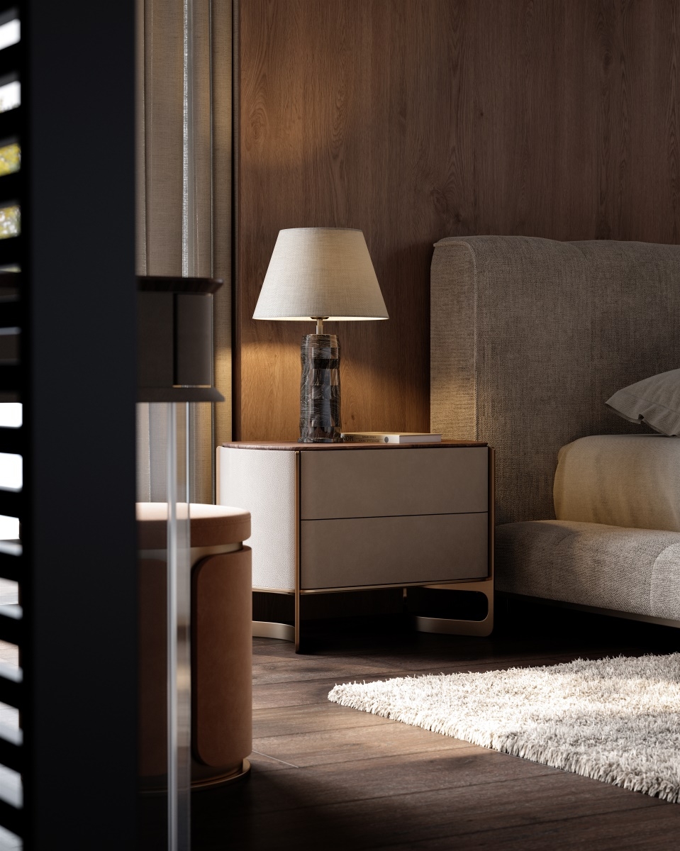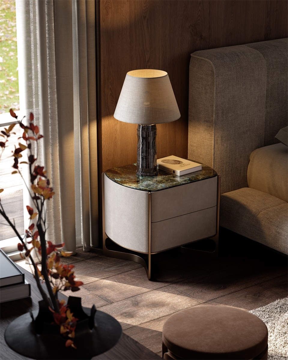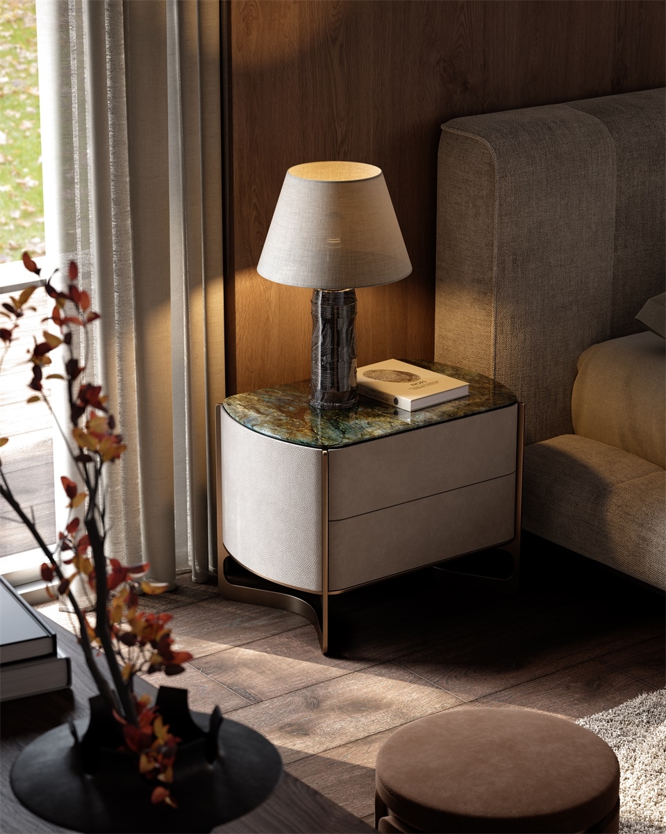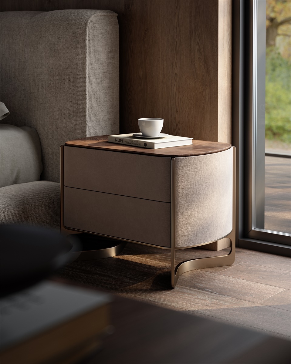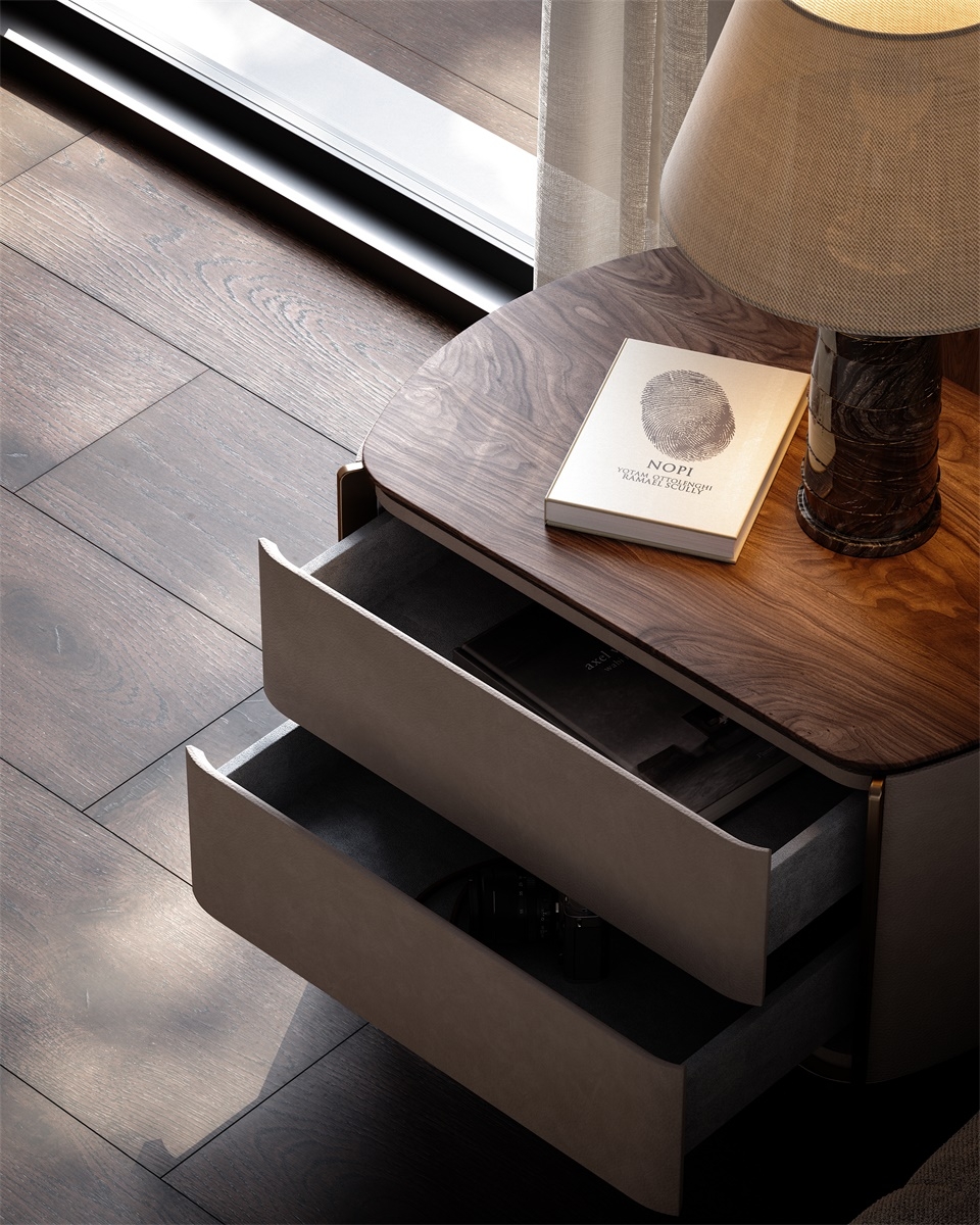 The leather stitching is CNC sewn + hand-trimmed, with a precise stitch length of 0.2mm, and the lines are smooth and fit the cabinet body; the joints between solid wood and metal are laser cut + hand-polished, smooth and burr-free, and the welding points are invisible and traceless; the metal tripod is manually adjusted, and the curvature fits the cabinet body, integrating "exquisite detailism" into every storage structure.