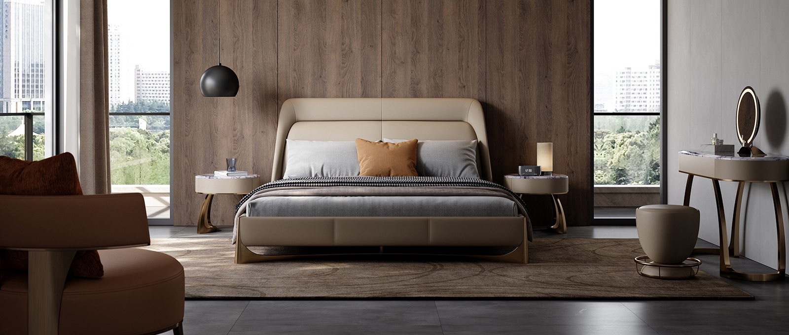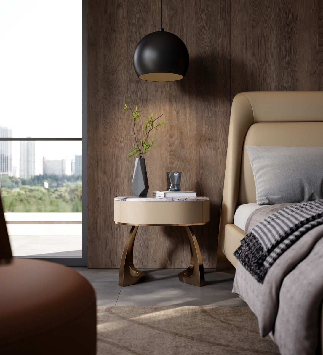 The countertop is made of natural rock slabs with marble texture like an art painting. After high-temperature calcination and anti-seepage treatment, it is wear-resistant and stain-resistant and has its own quiet luster. The cabinet body is wrapped in delicate leather, which feels warm and skin-friendly, complementing the tough lines of the metal bracket.