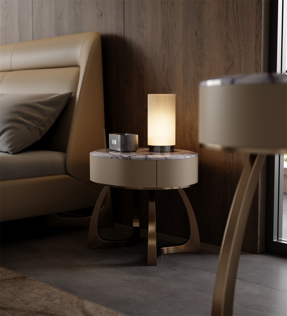 The metal bedside table with light lines and exquisite styles, coupled with a suspended space in the middle and a simple luxury stone countertop, gives the entire product a futuristic feel. The streamlined style cleverly presents an unyielding storage space.