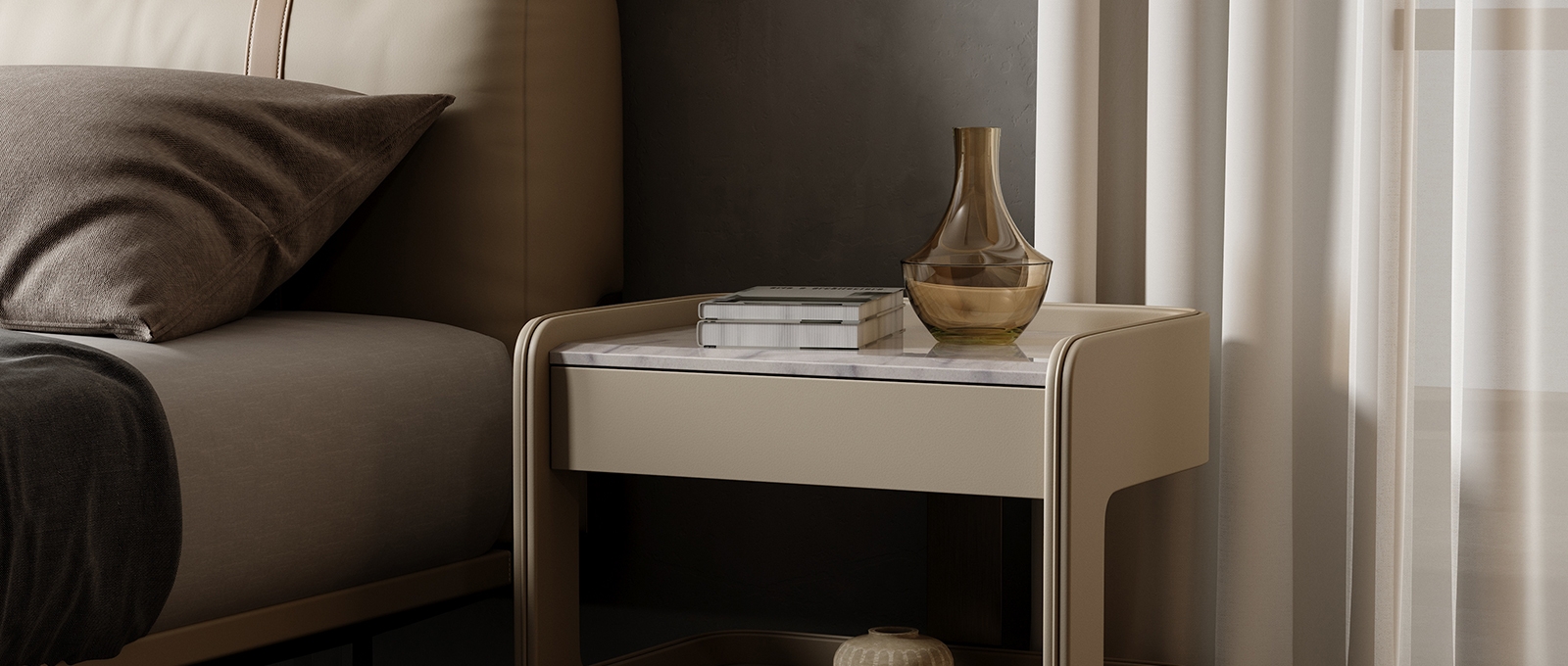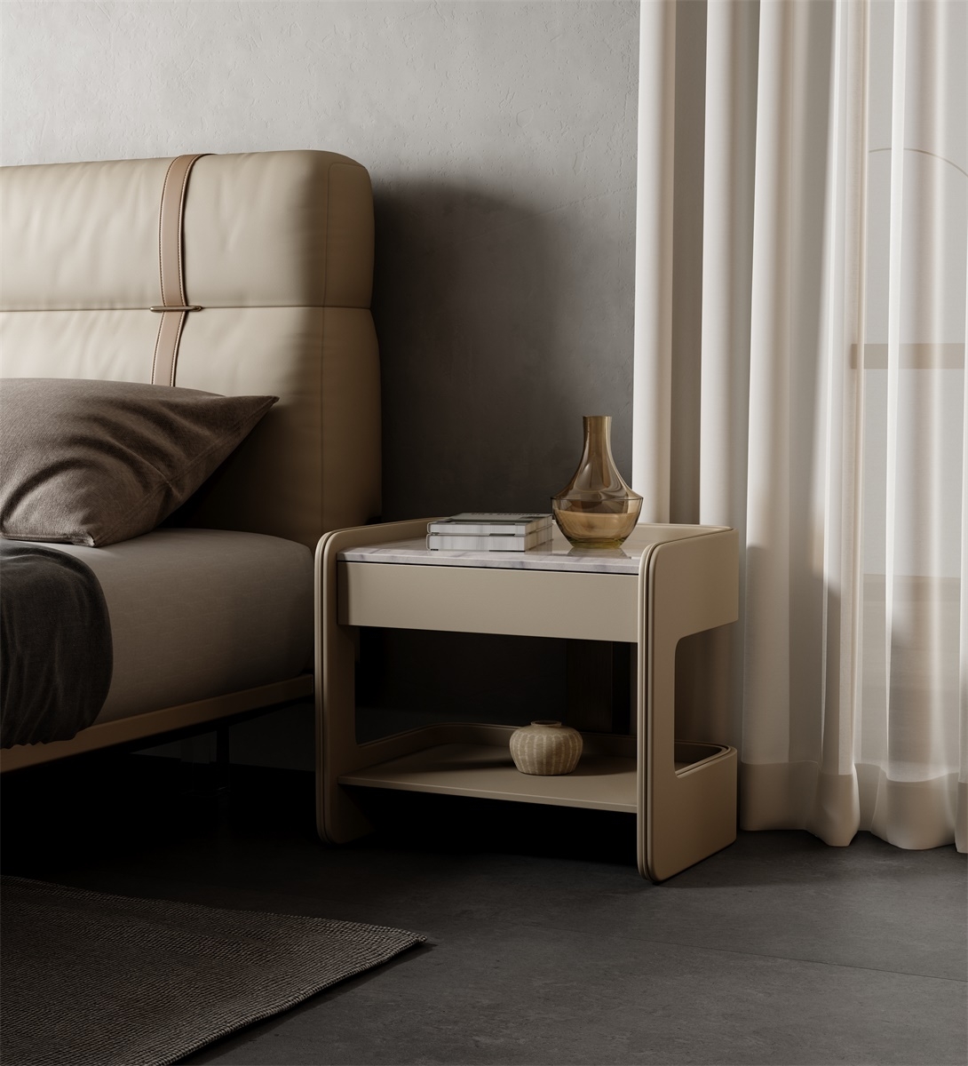 The countertop is made of natural rock slabs with a delicate texture as soft as clouds. After high-temperature calcination and anti-seepage treatment, it is wear-resistant and stain-resistant and has its own healing luster. The cabinet body is upholstered in leather, which feels warm and skin-friendly, complementing the natural texture of the solid wood support in the middle.