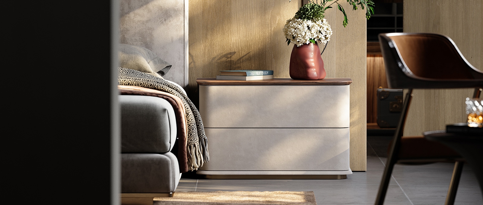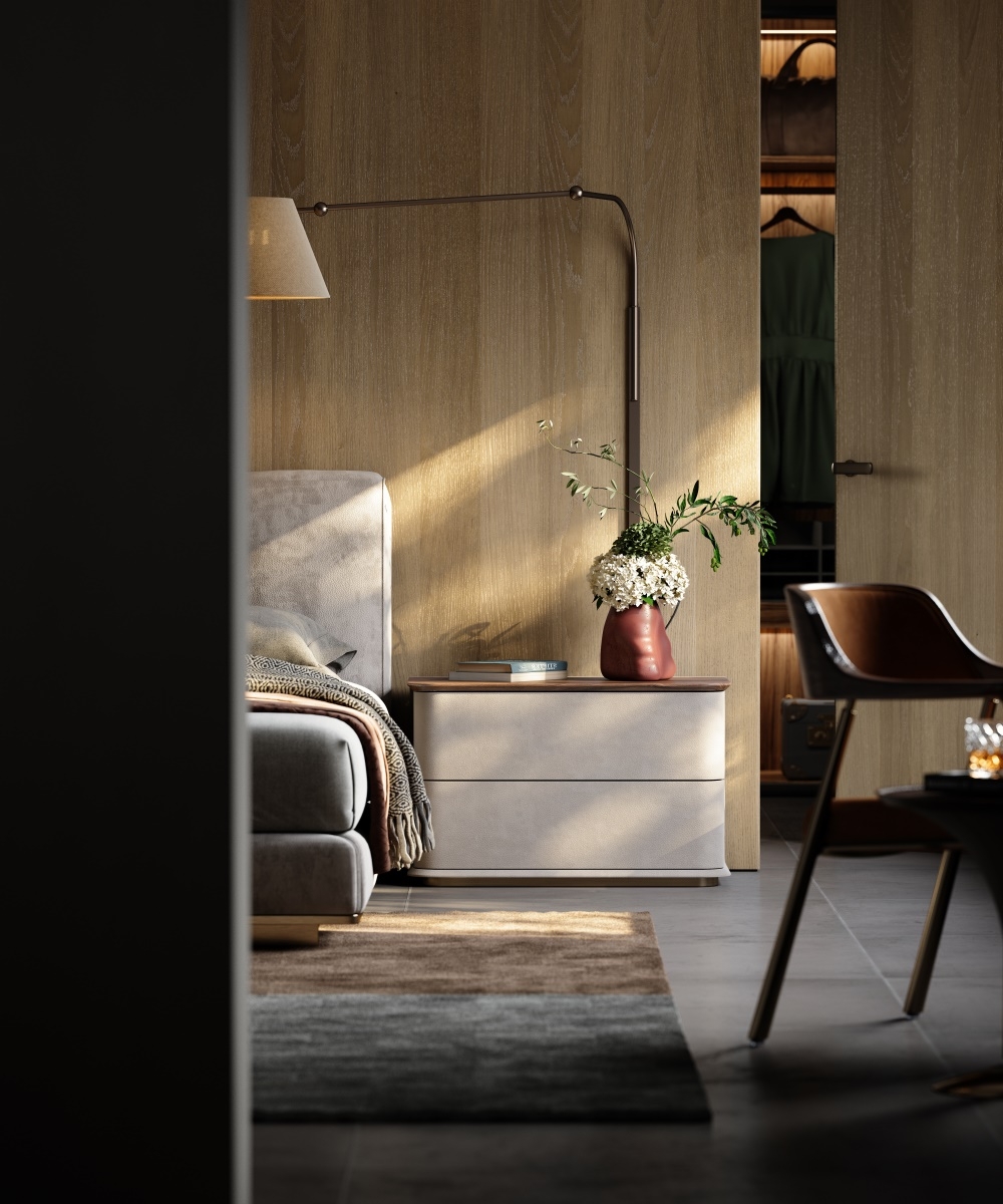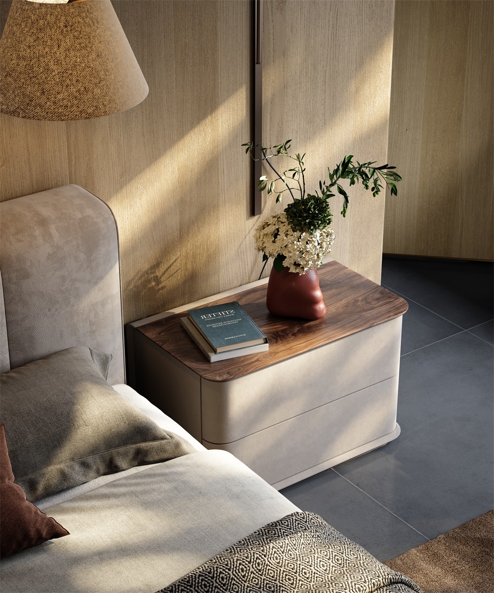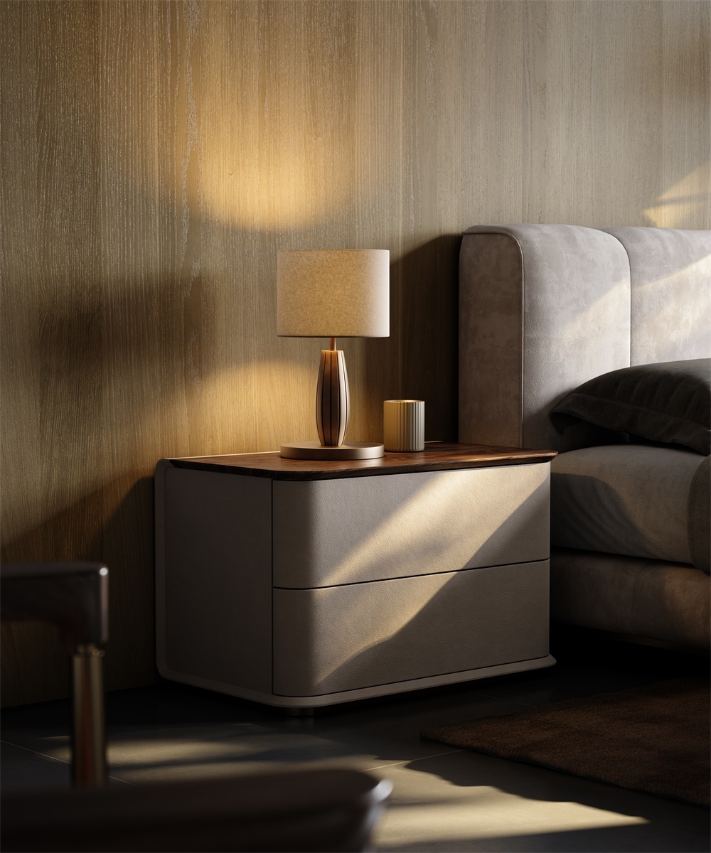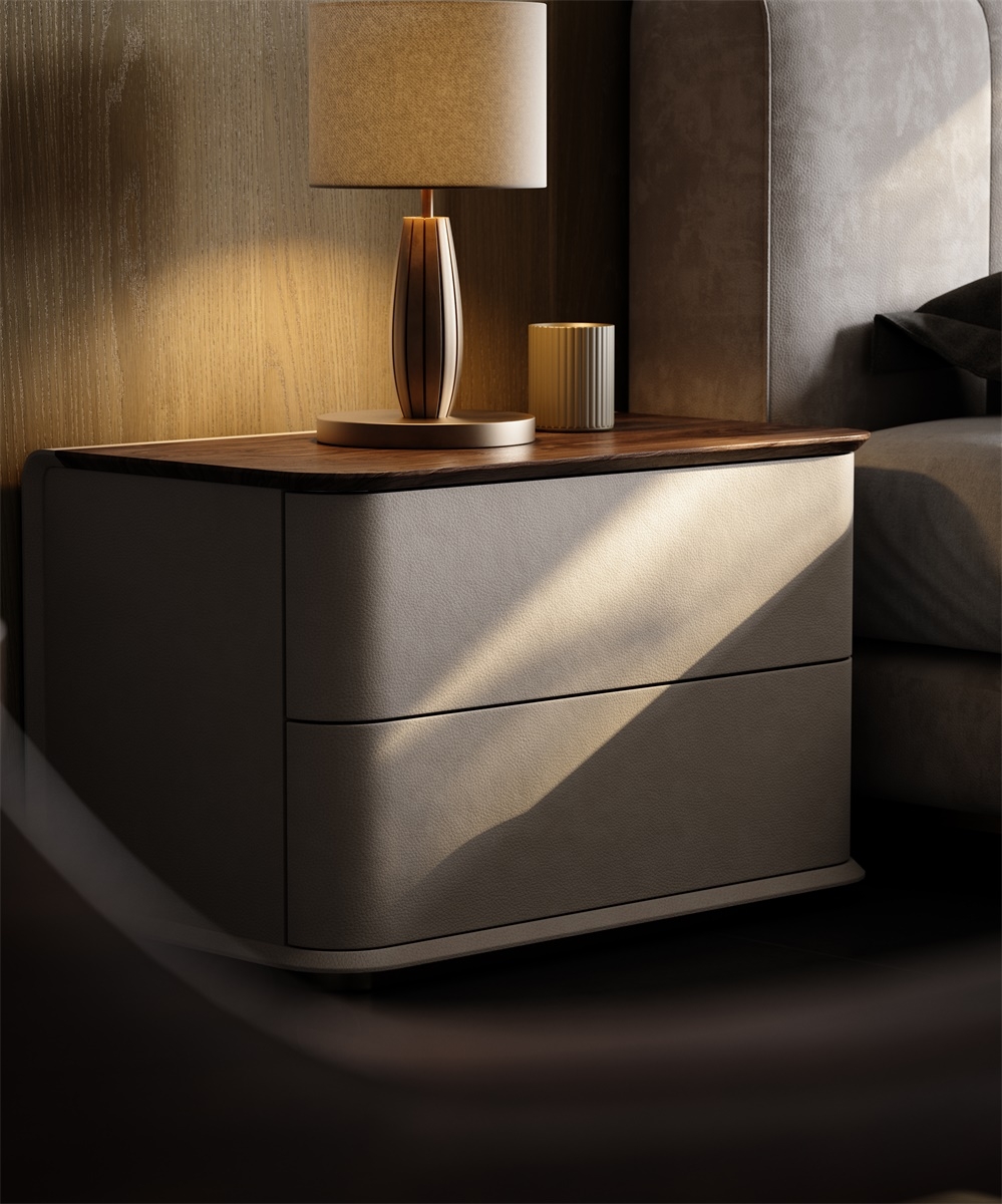 In a home scene that focuses on the sense of order in the sleeping space and the convenience of storage before going to bed, this bedside table combines leather, solid wood, and metal materials, with a simple double-drawer design, becoming a "quiet guardian" by the bed, turning every time you tidy up before going to bed into a healing experience that blends with quality life.