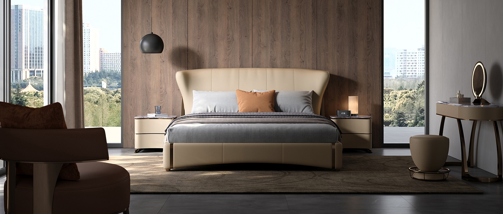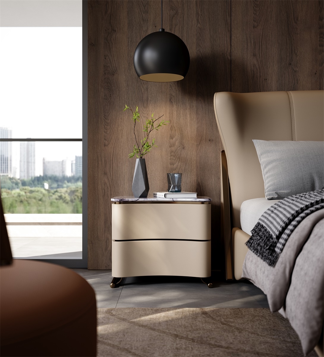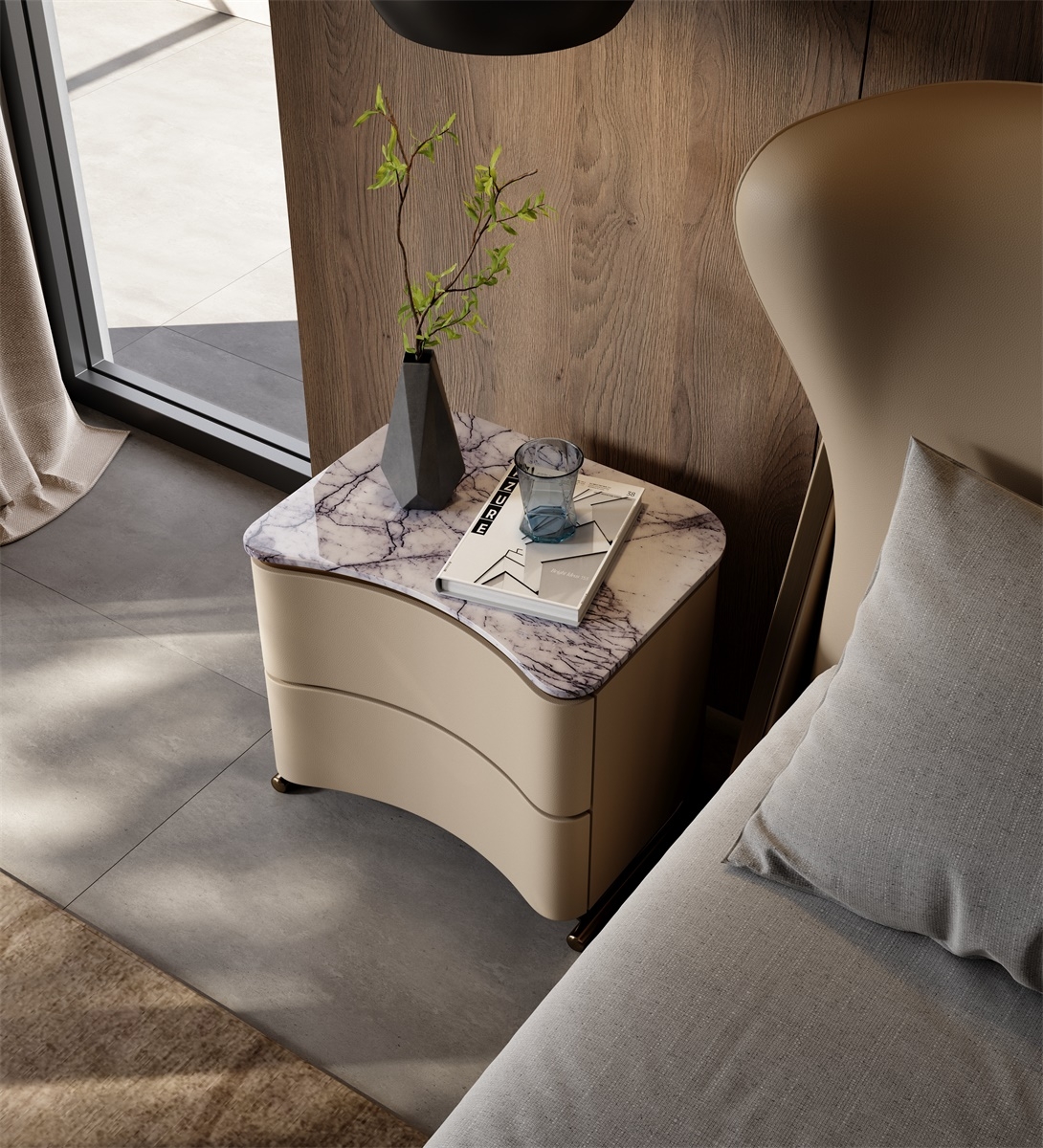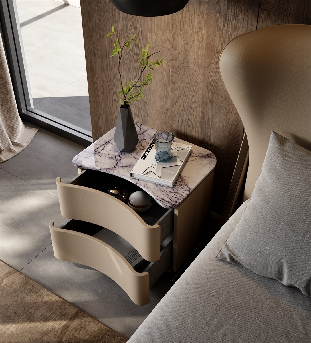 The cabinet body is made of stone slab + genuine leather + metal. The tough texture of the stone slab, the delicate skin-friendliness of the genuine leather, and the warm luster of the metal complement each other. Through laser cutting + manual splicing, the three are combined to weave a gentle texture base for the space, injecting a high-end atmosphere into the sleeping area.